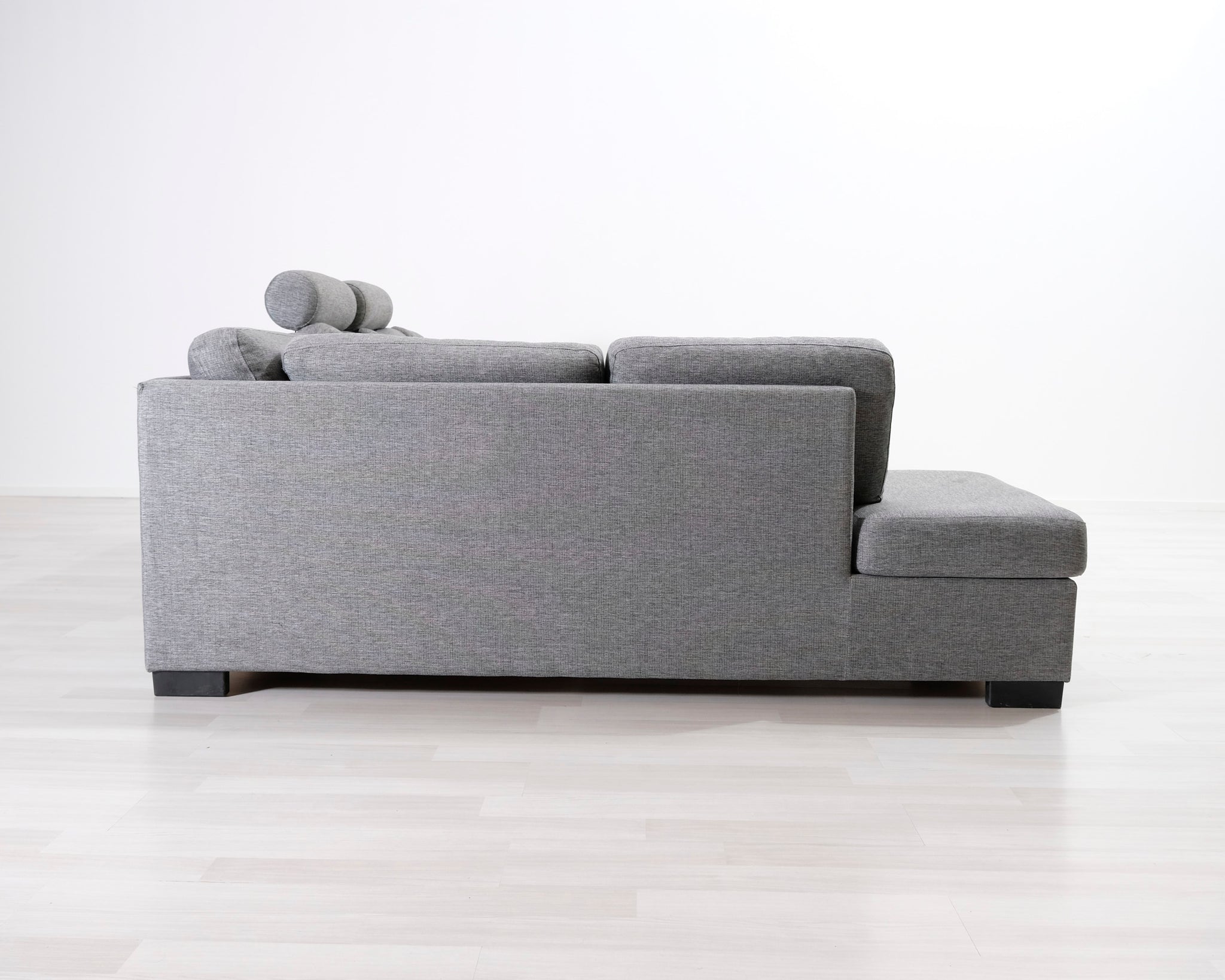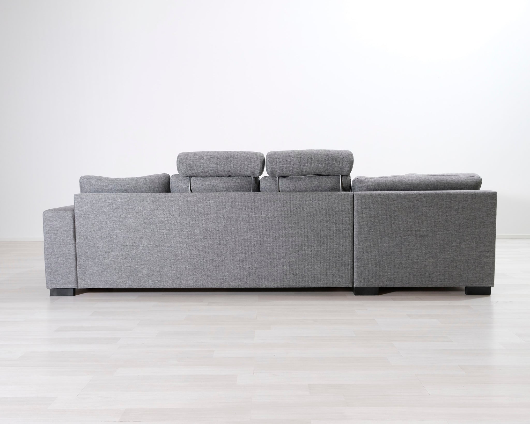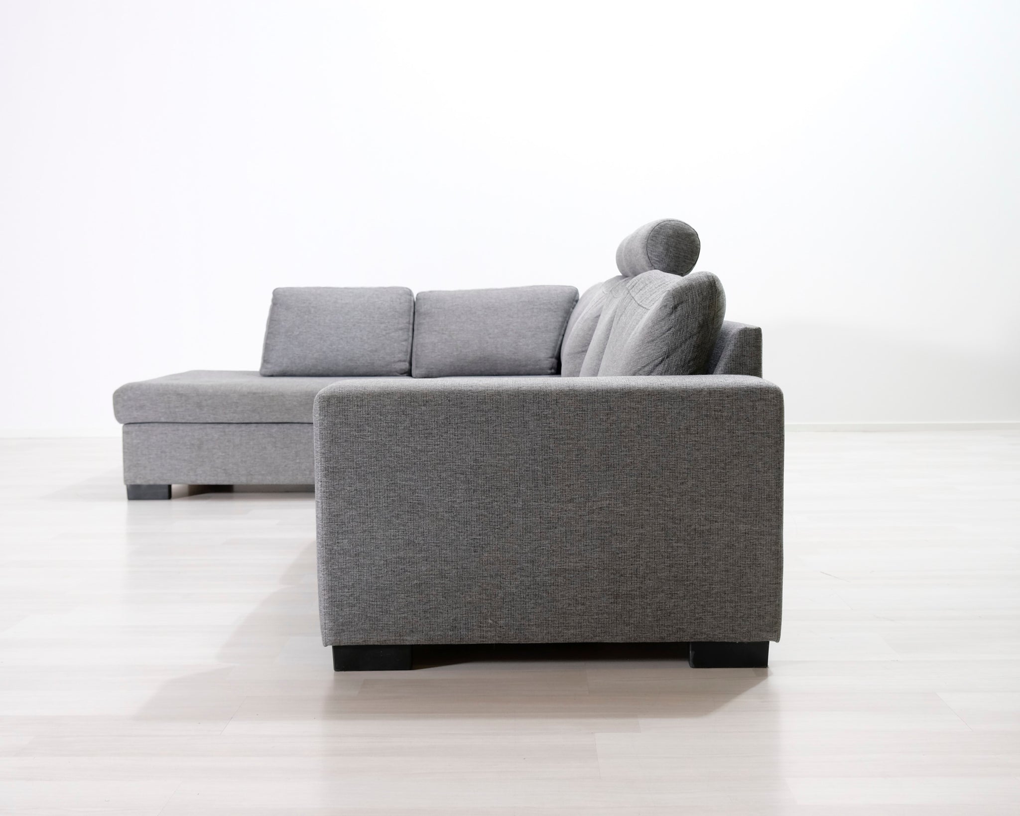 Suuri, harmaalla kankaalla verhoiltu avokulmasohva. Niskatyynyt antavat sohvalle lisämukavuutta.