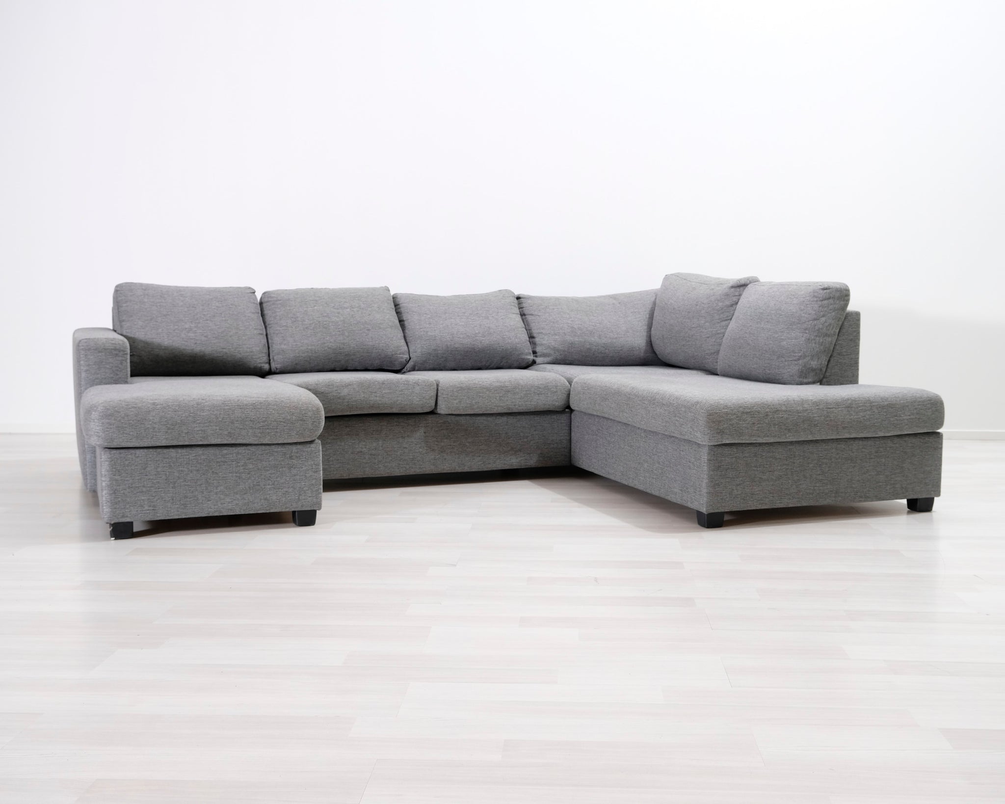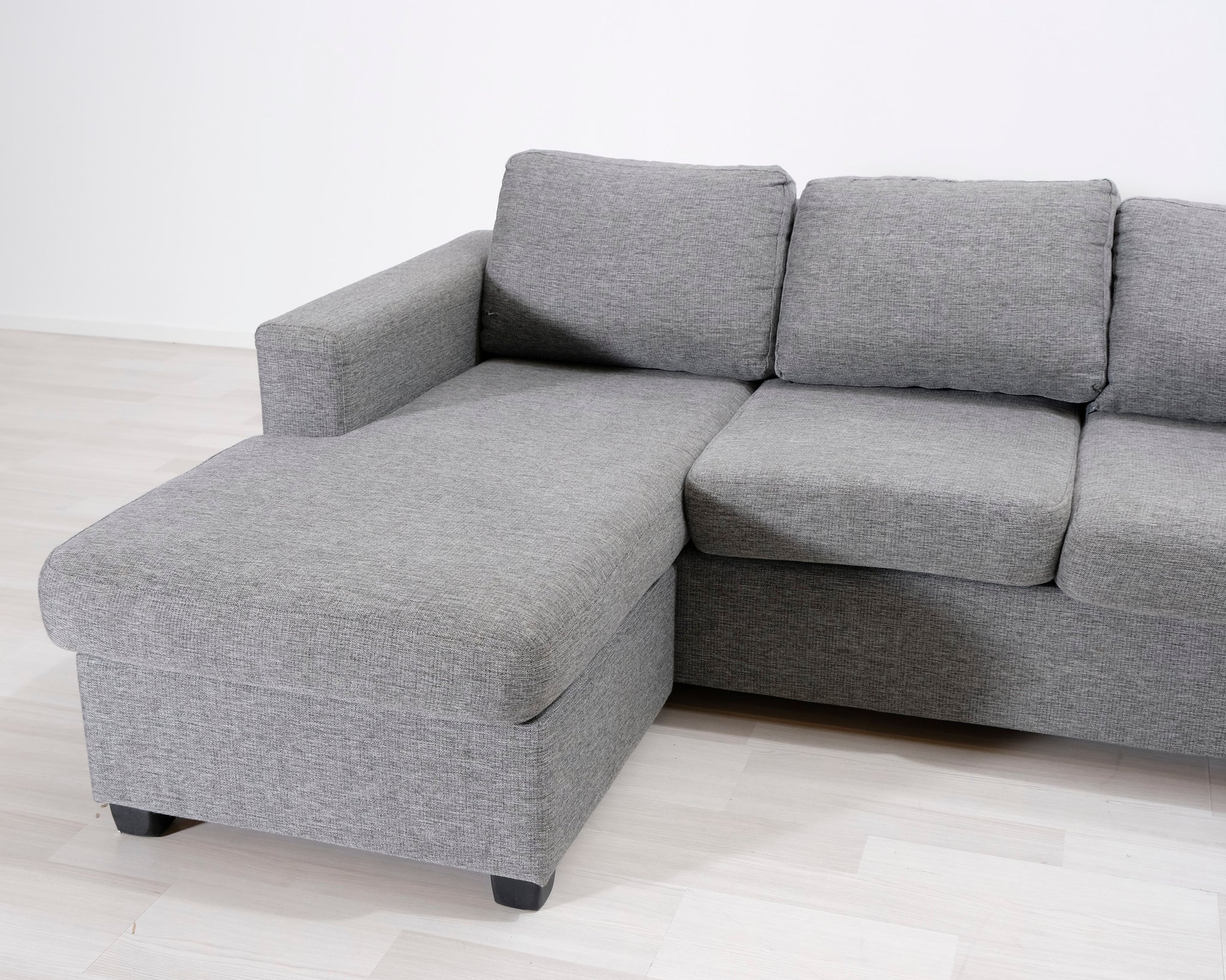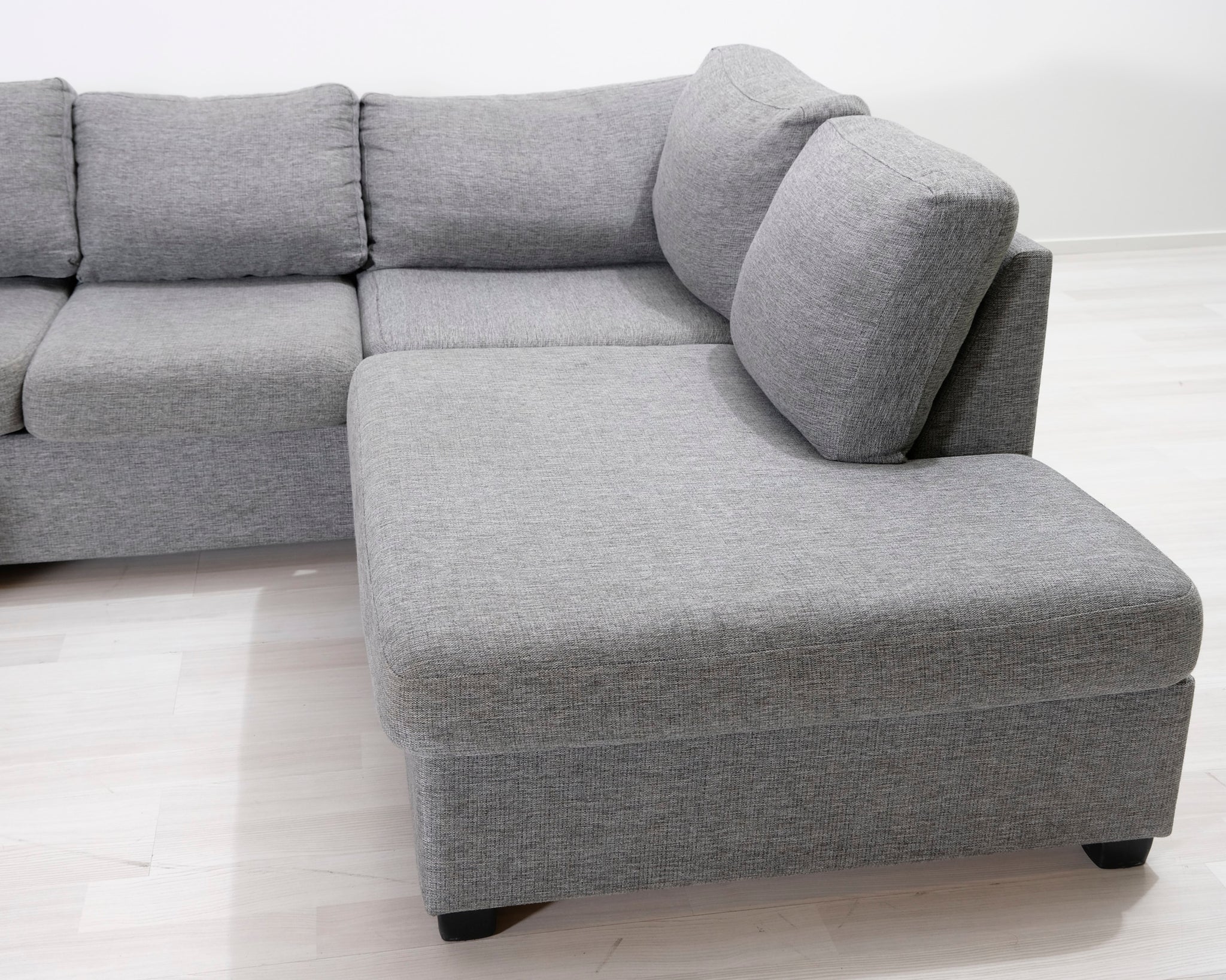 Suurikokoinen avokulmasohva divaanilla. Harmaa kangasverhoilu. Päälliset ovat irrotettavat.