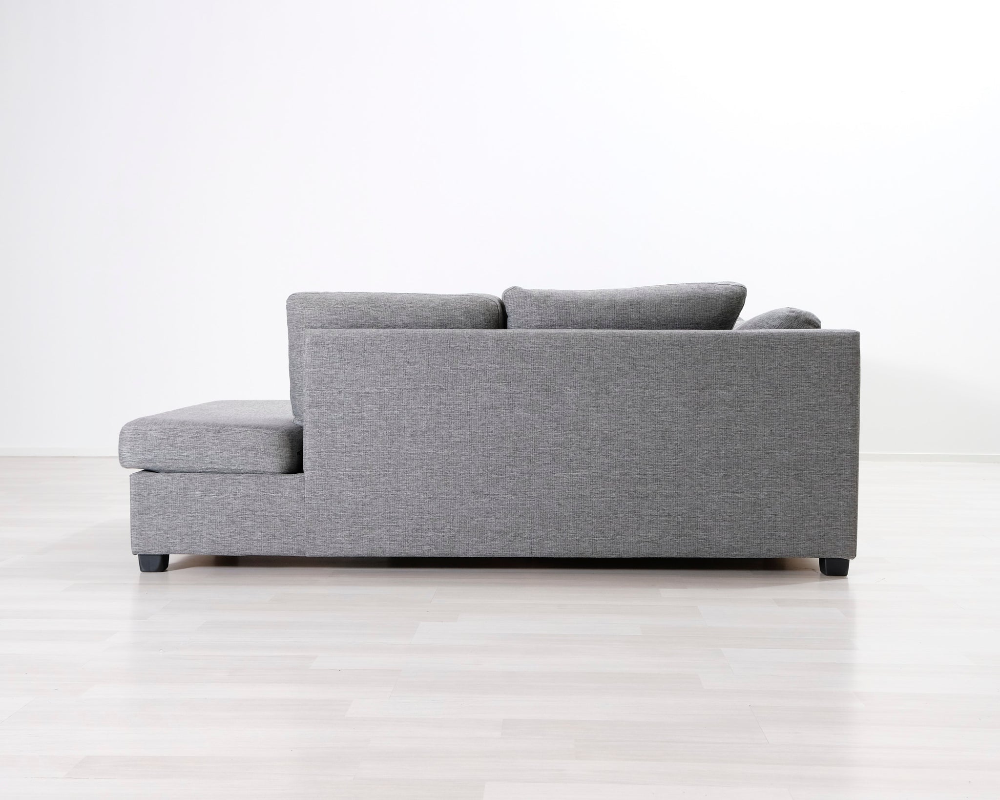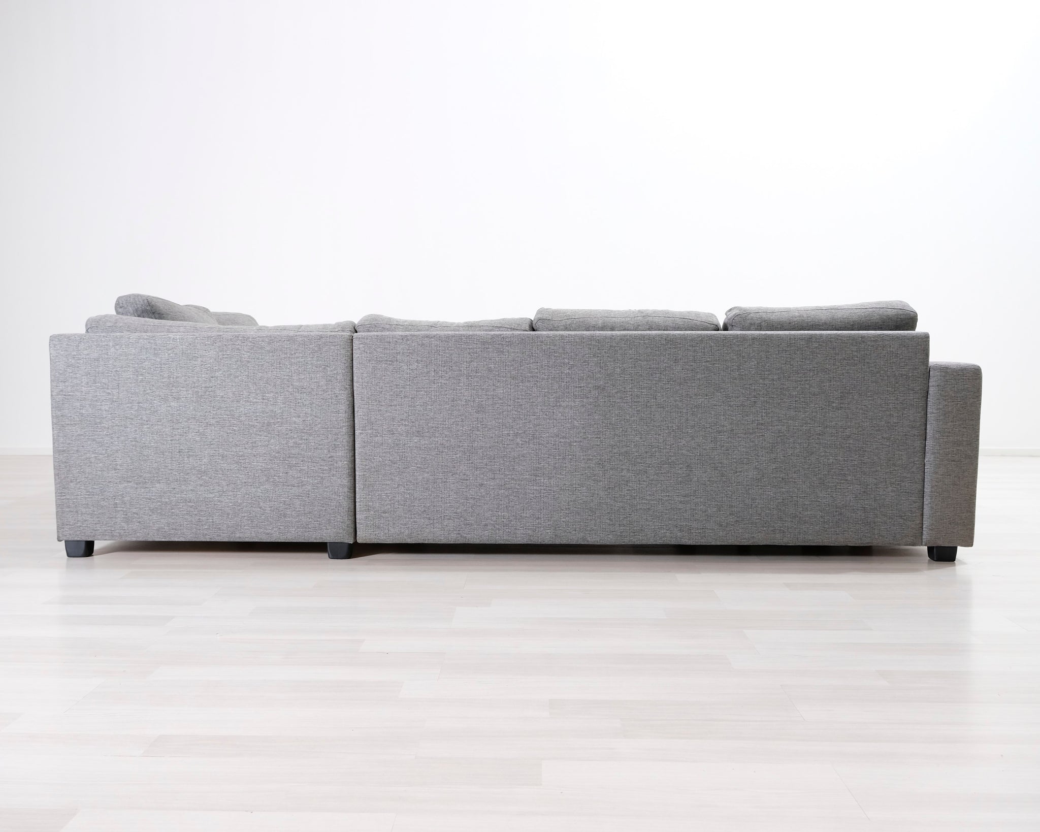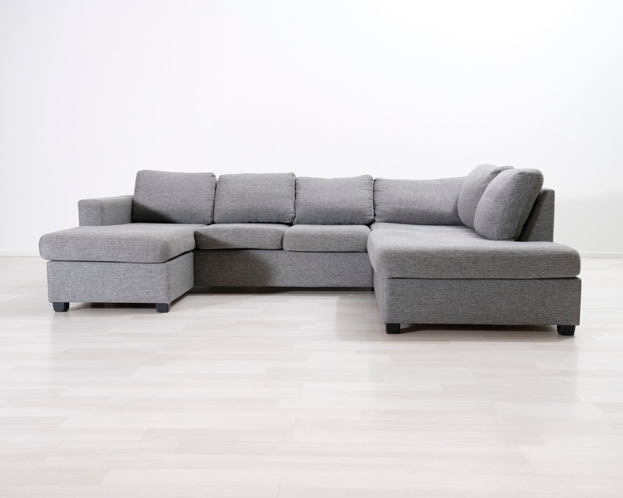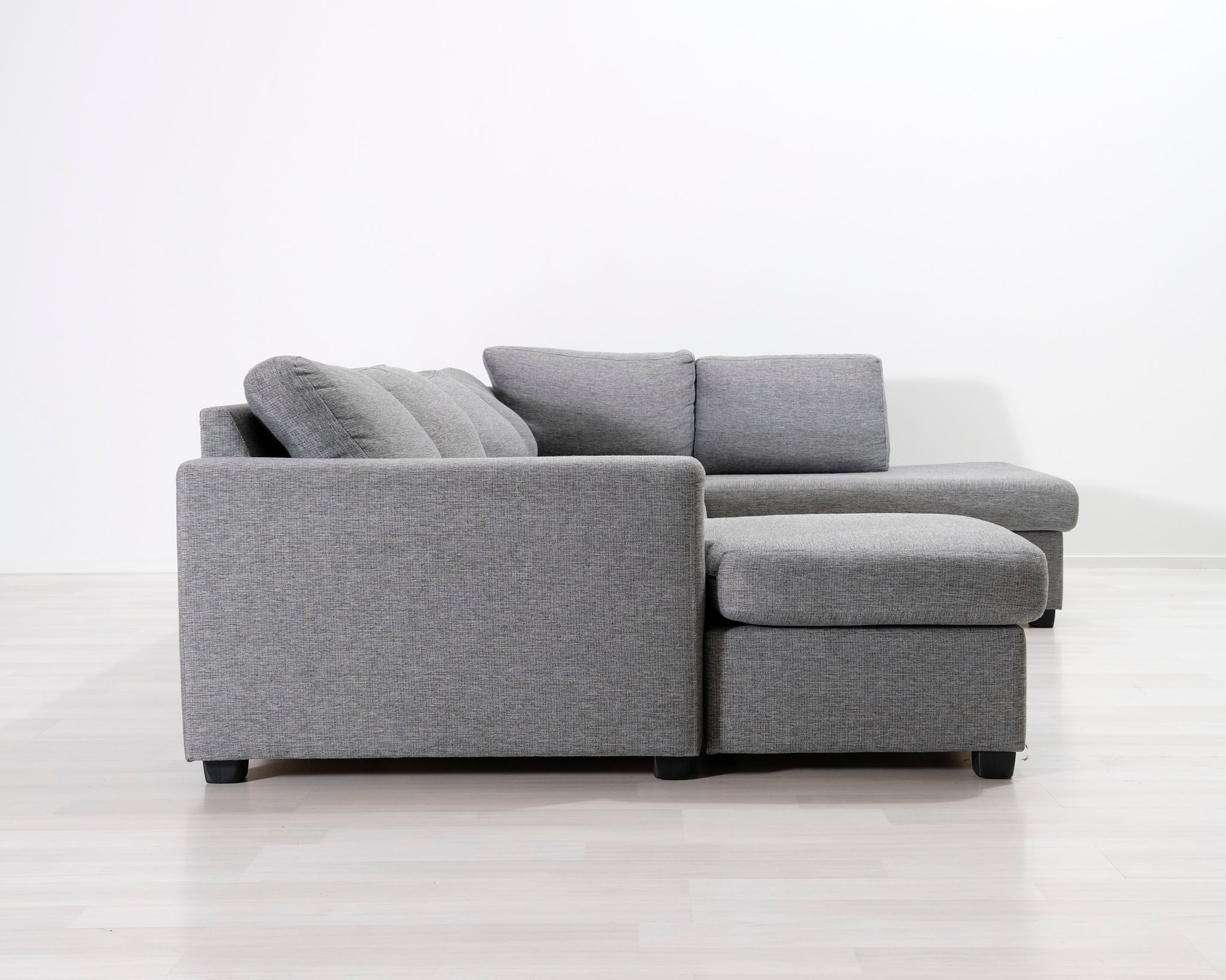 Suurikokoinen avokulmasohva divaanilla. Harmaa kangasverhoilu. Päälliset ovat irrotettavat.