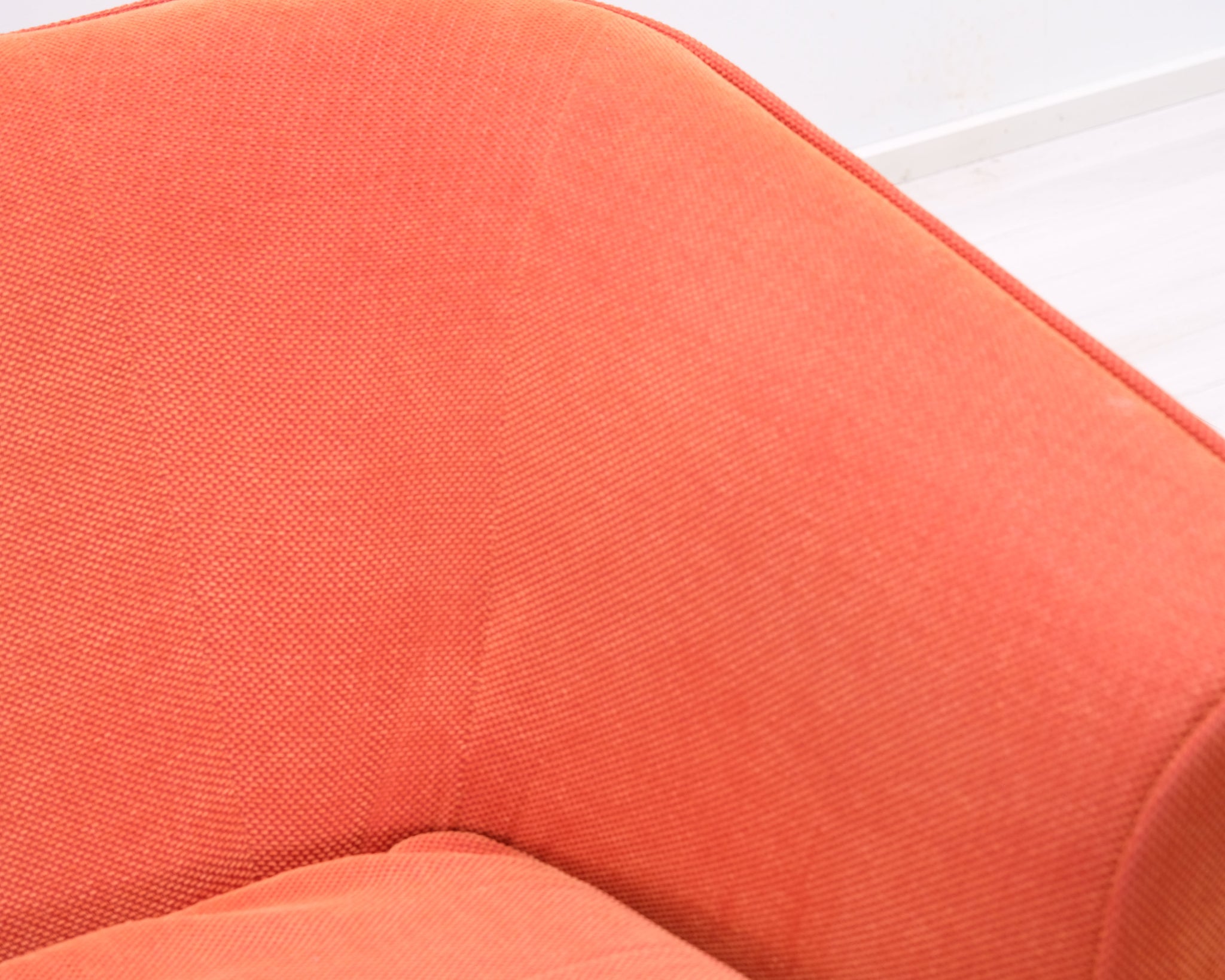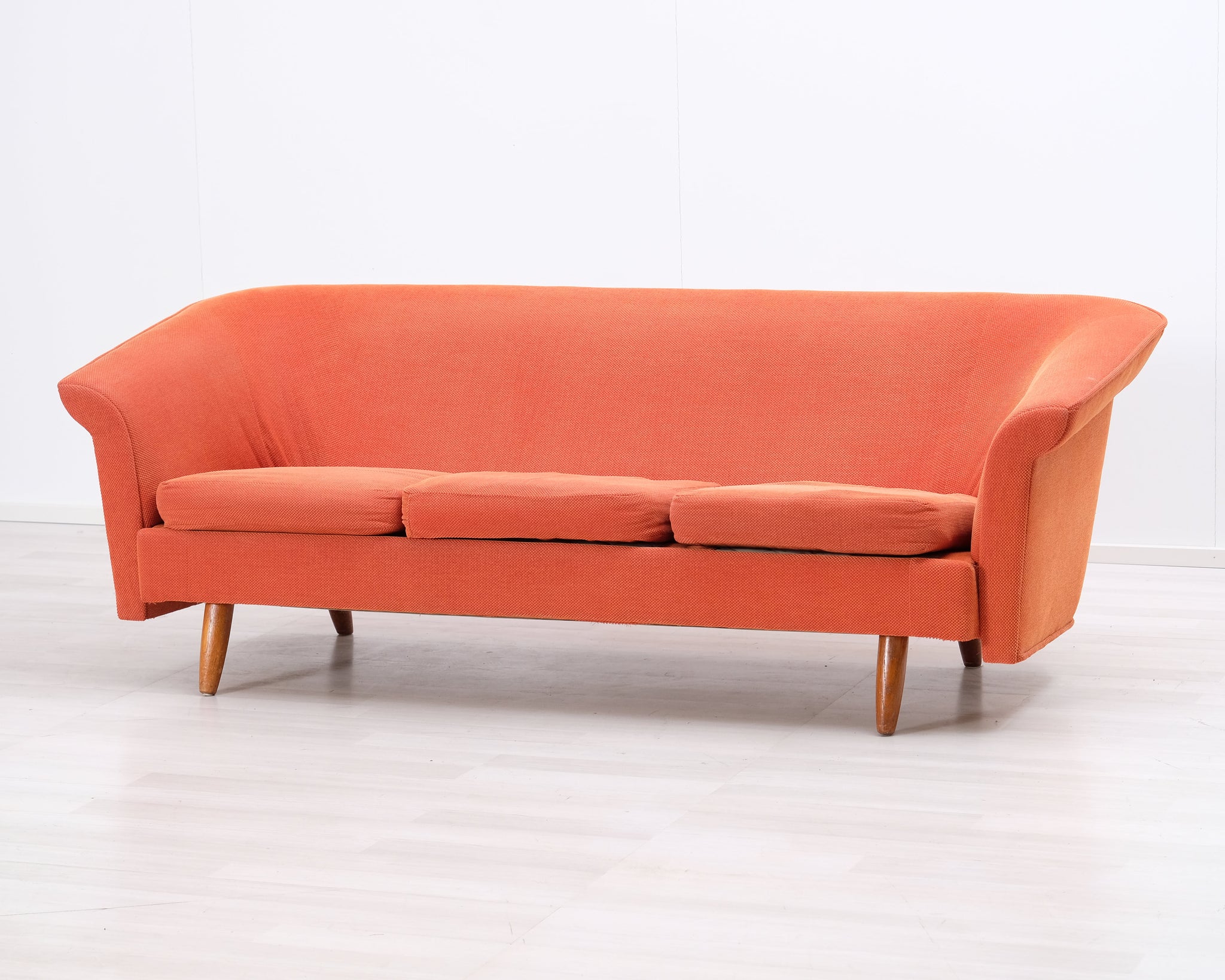 Kolmen istuttava vintage-sohva. Oranssi kangasverhoilu.
