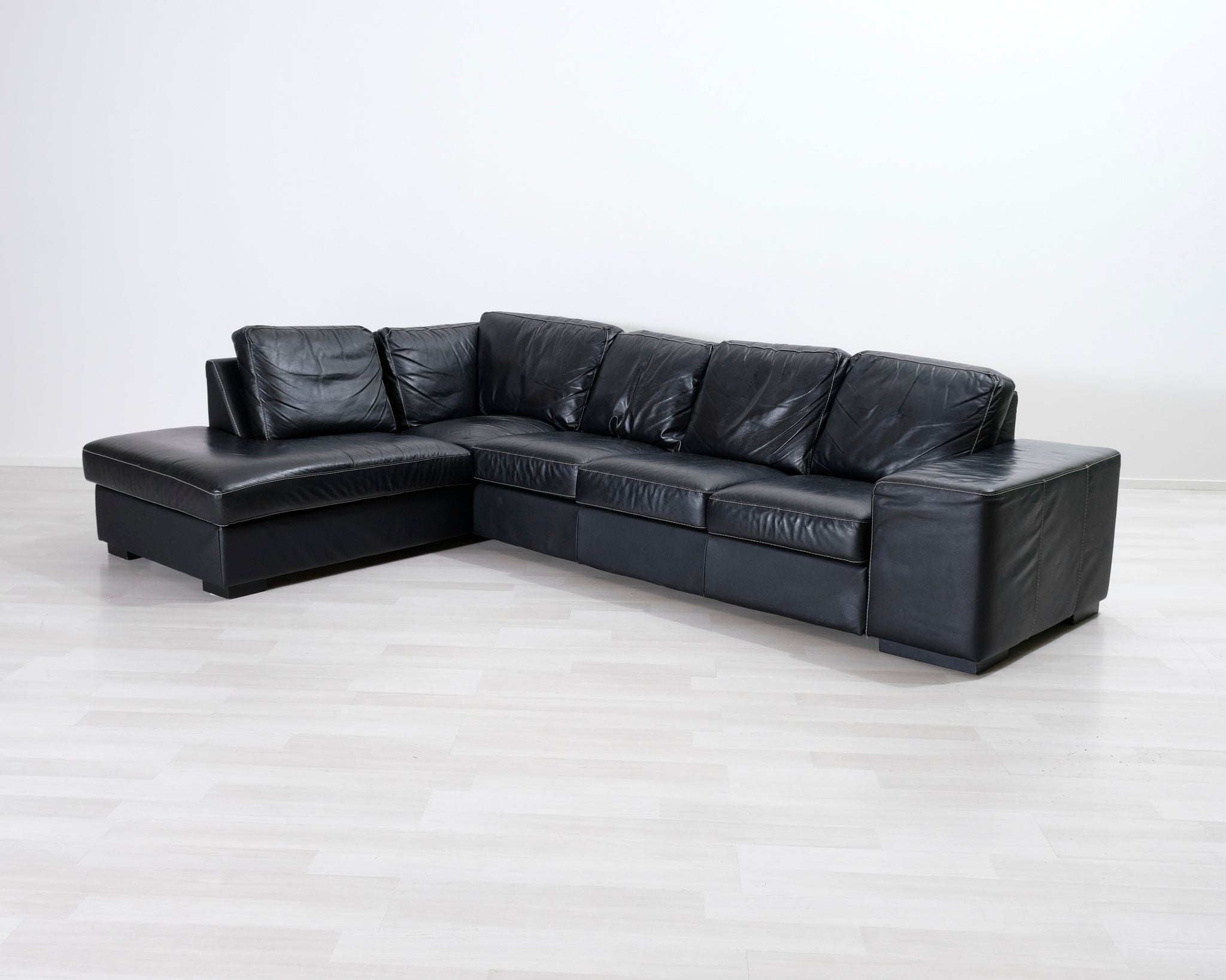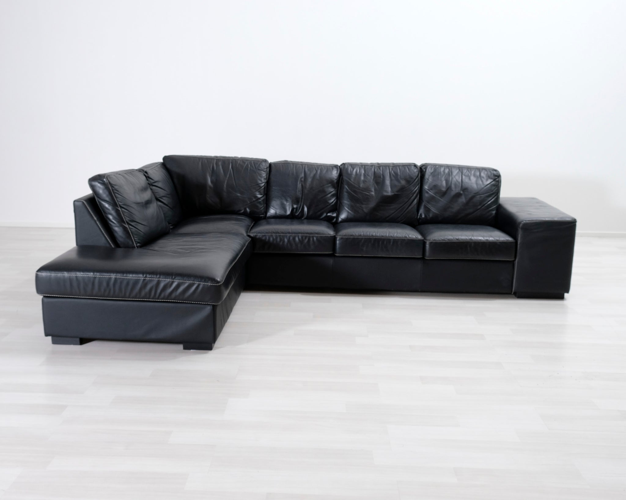 Kulmasohva divaanilla. Musta nahkaverhoilu.