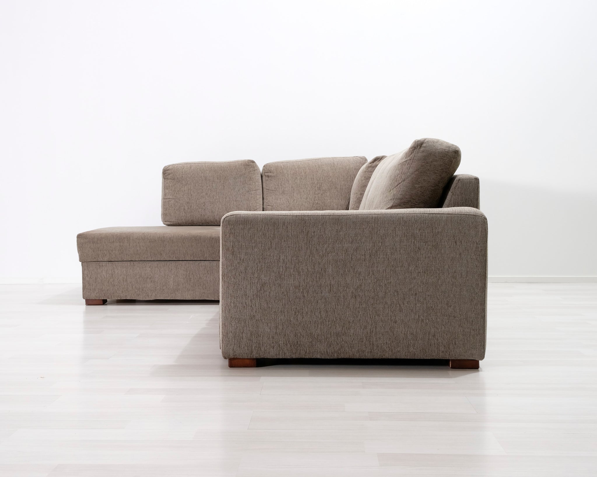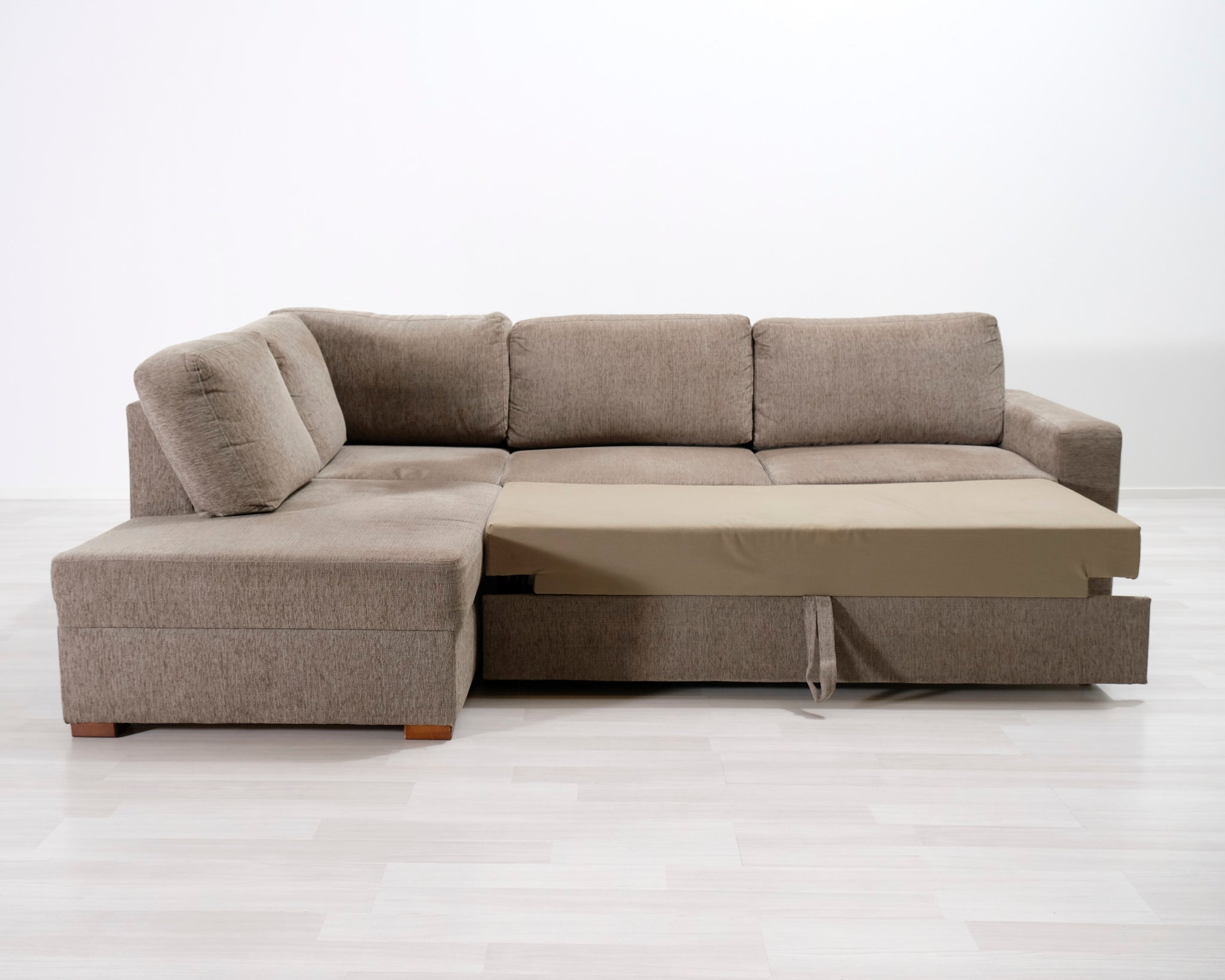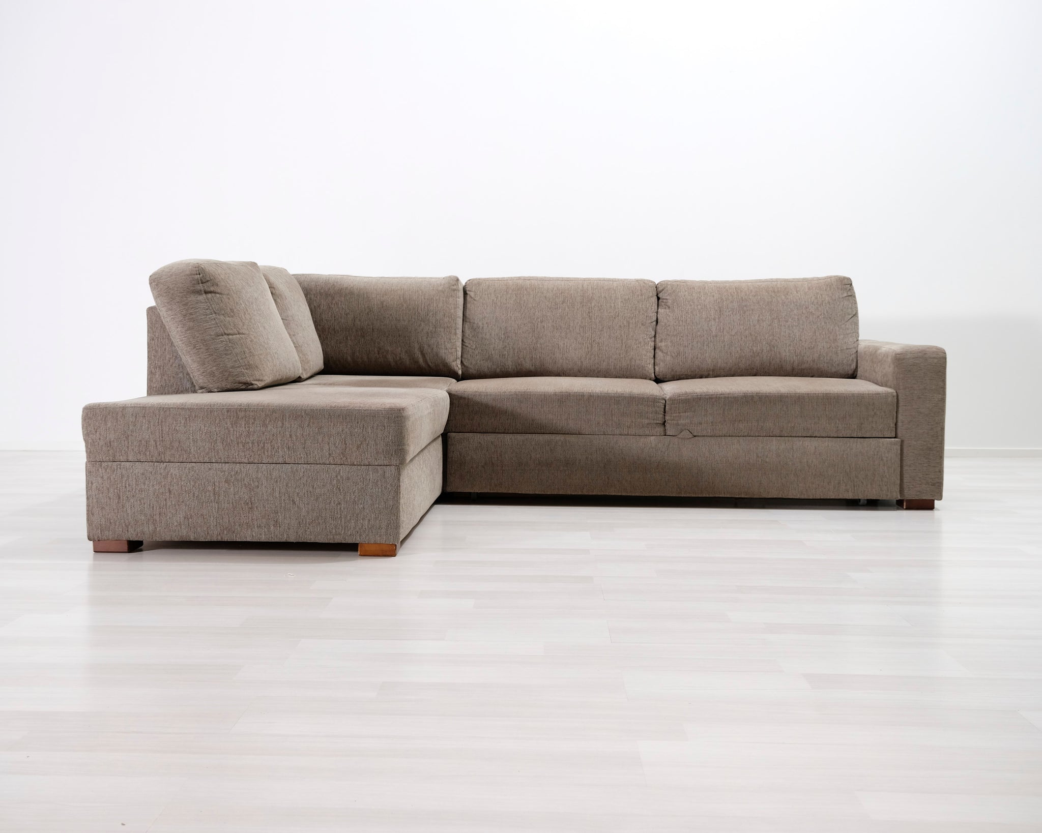 Kangasverhoiltu vuodesohva divaanilla. Toimii niin vierasvuoteena kuin käytännöllisenä sisustusratkaisuna pienessä kodissa.