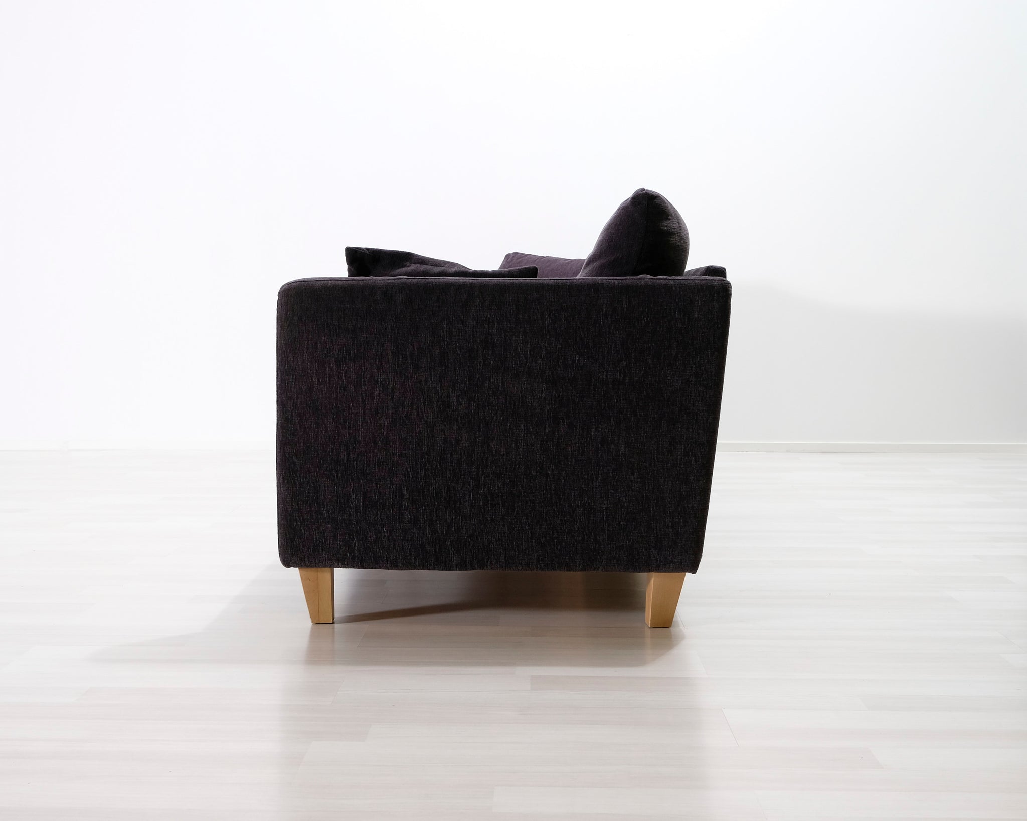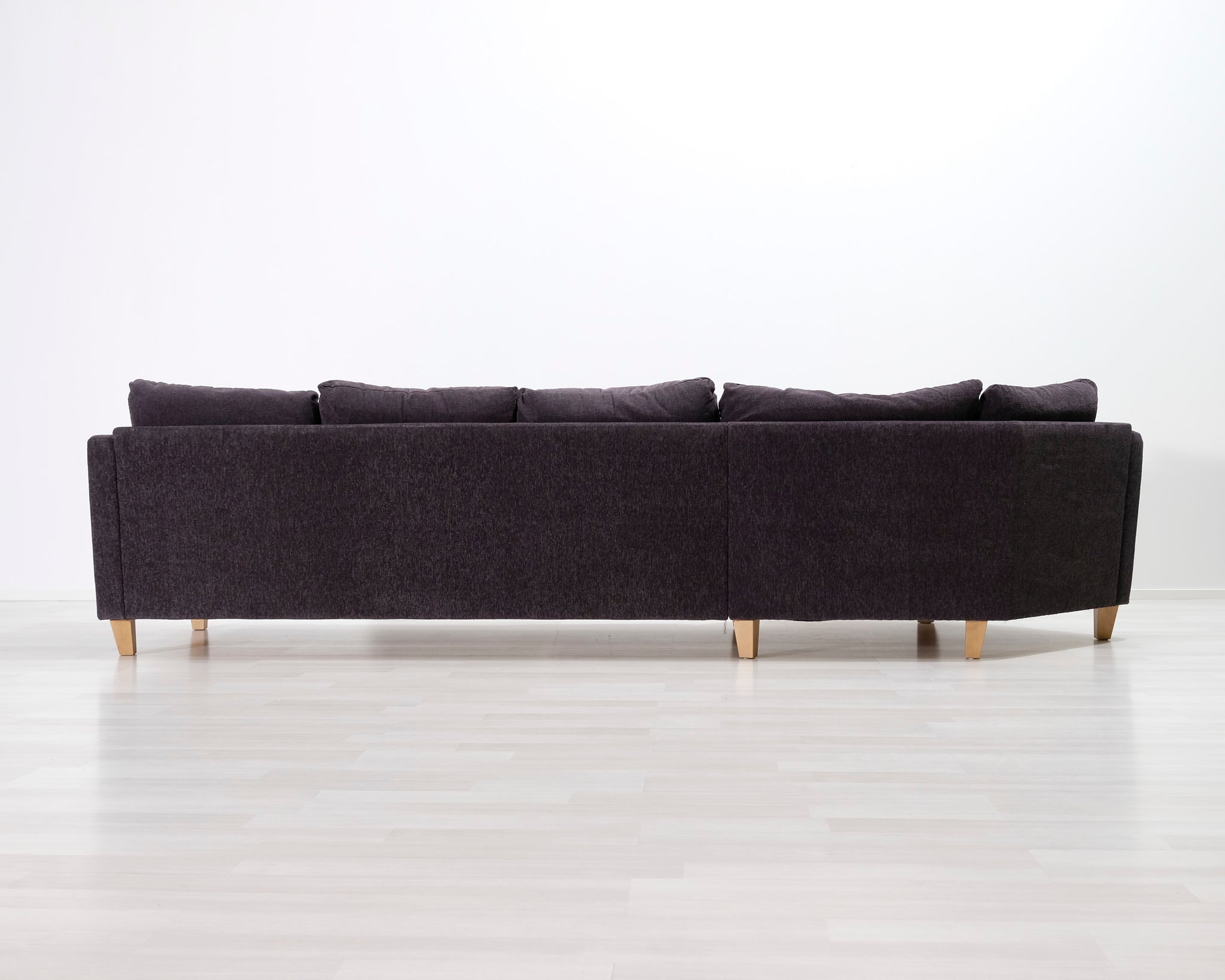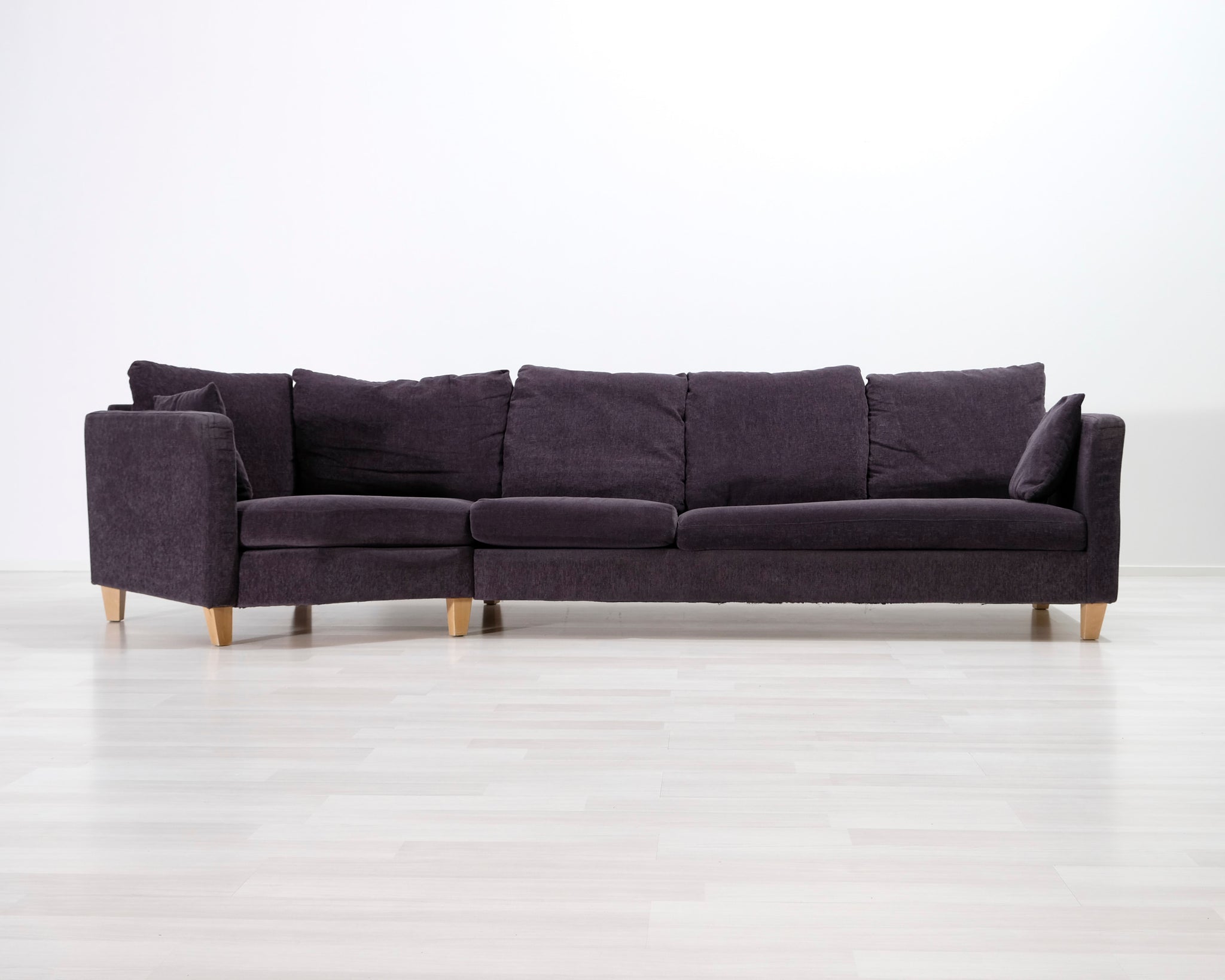 Viidelle hengelle sopiva kangassohva pienellä kulmalla. Harmaa kangasverhoilu.