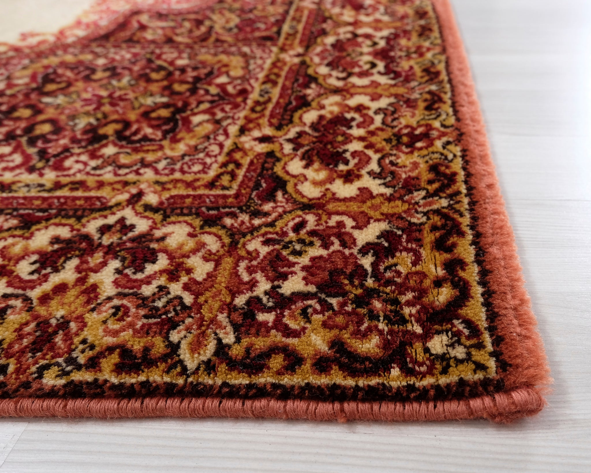 Antiikkinen matto. Punaisen ja beigen sävyinen. Koristeellinen kuviointi.