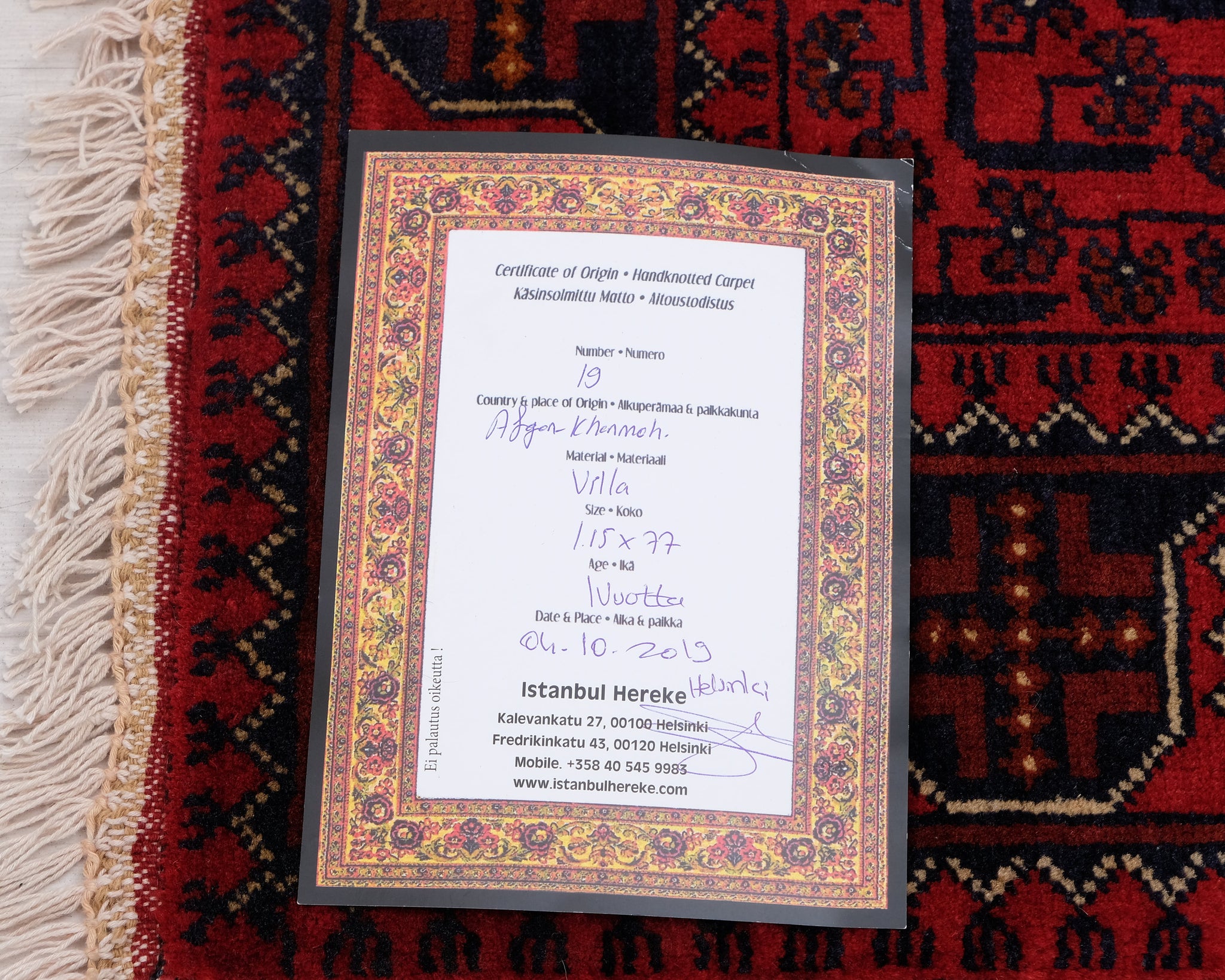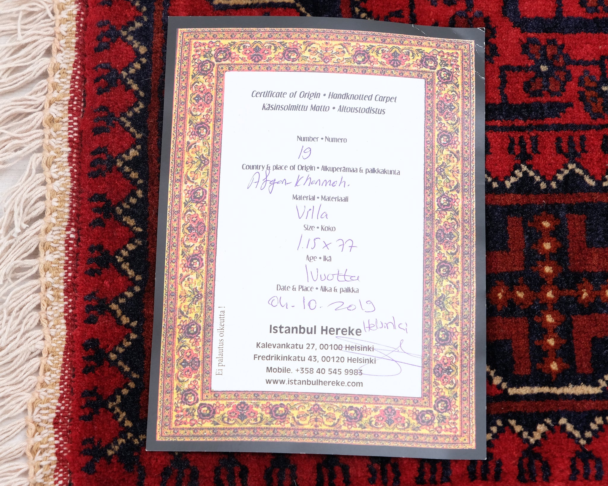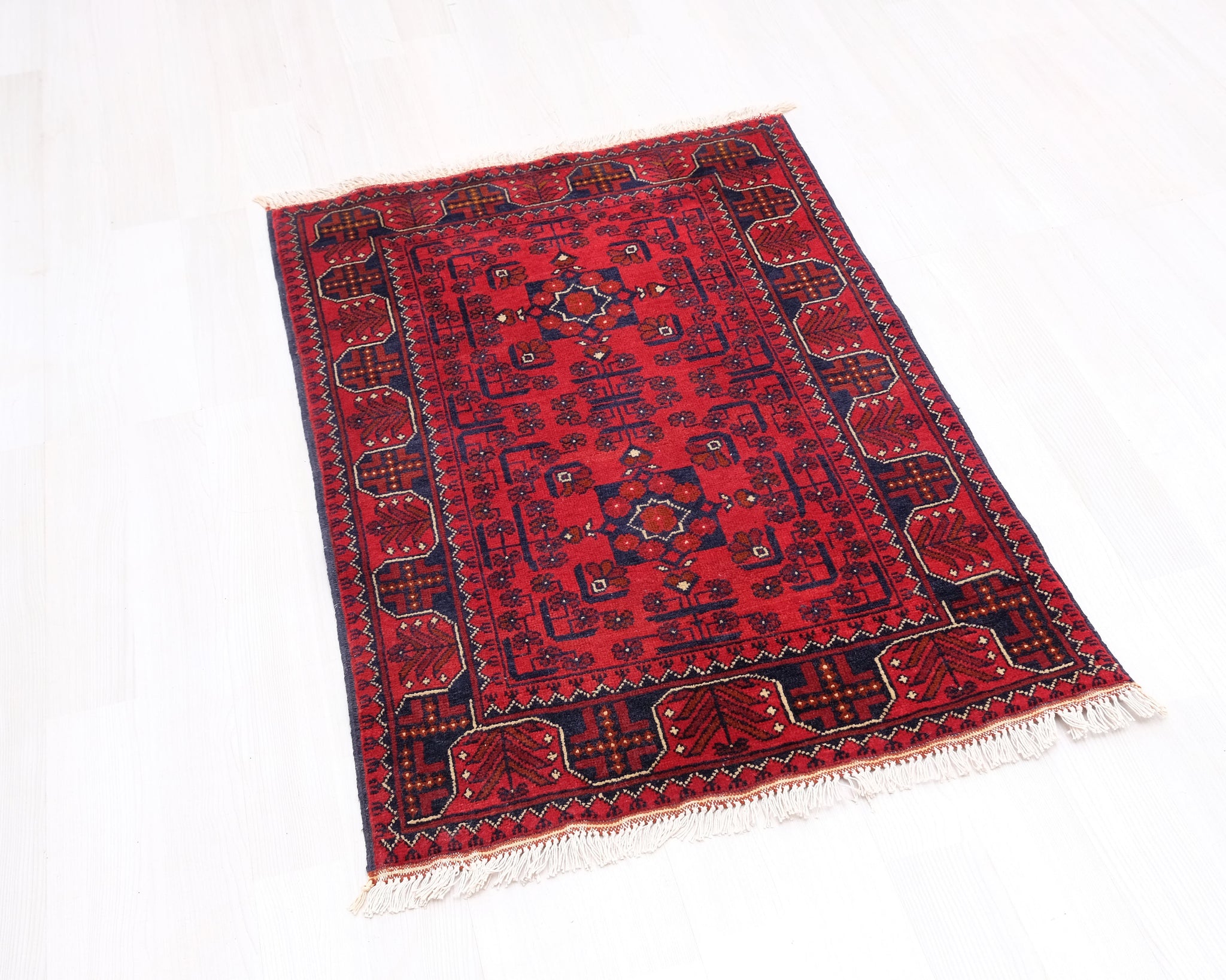 Käsinsolmittu afgaanimatto, valmistettu laadukkaasta villasta. Ostaja saa aitoustodistuksen.