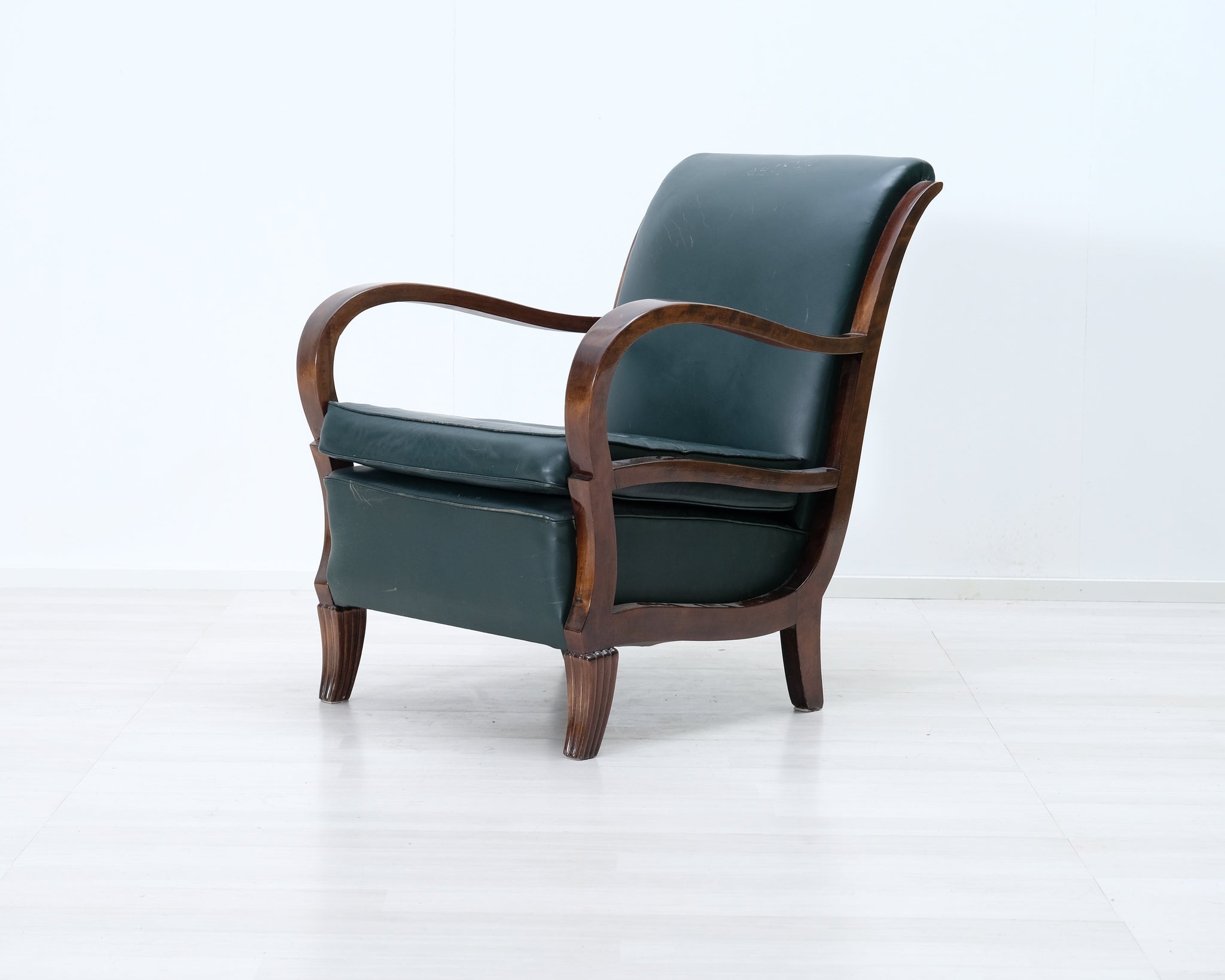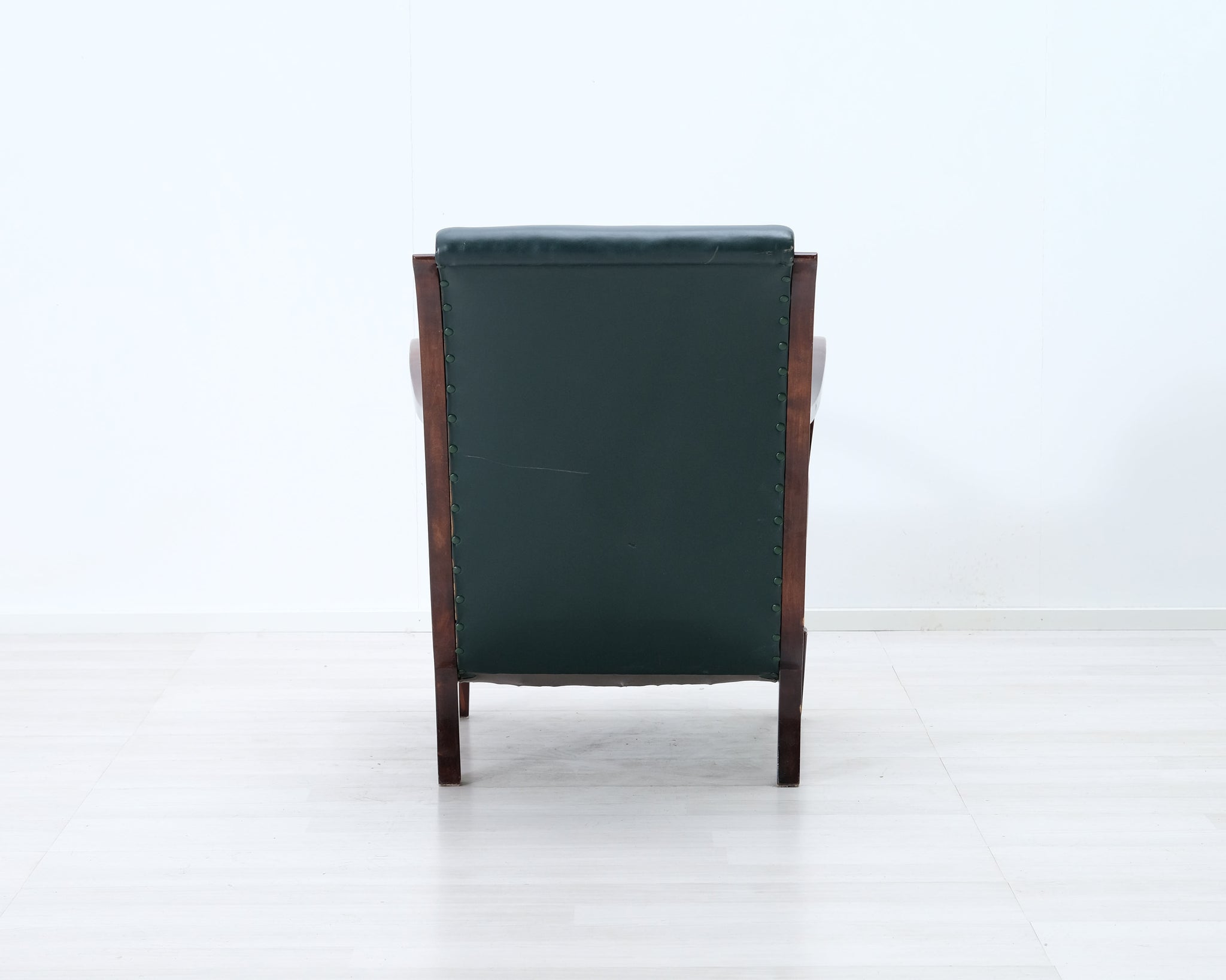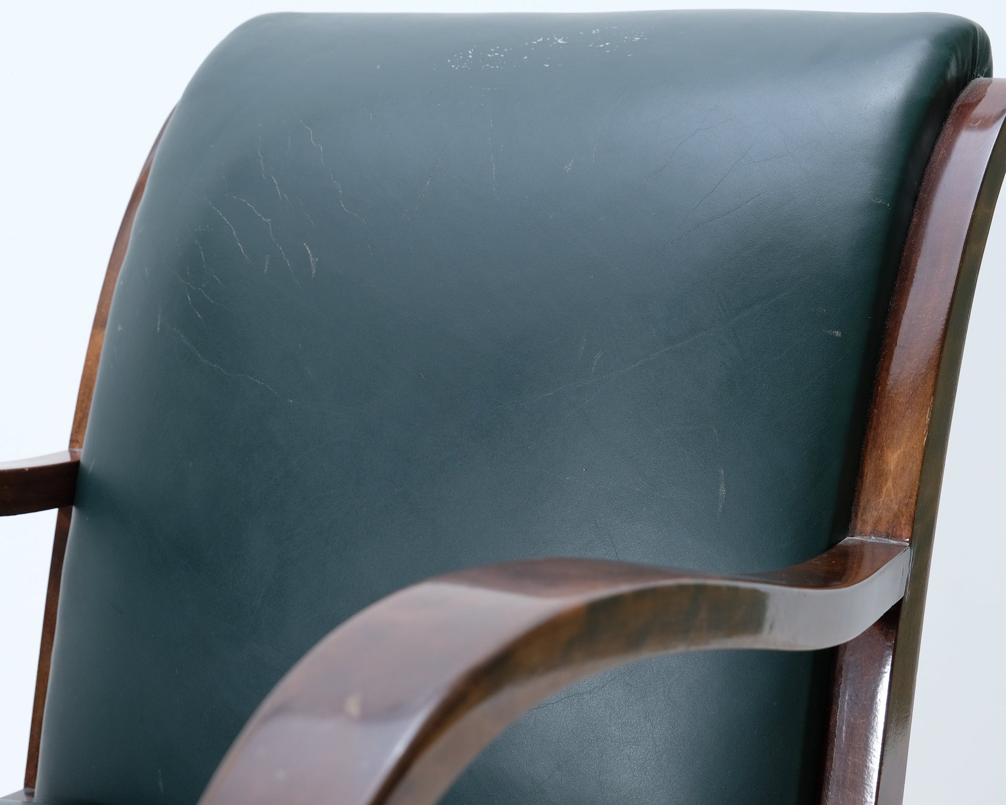 Nojatuoli 1920-luvulta. Vihreä nahkaverhoilu ja puinen runko.