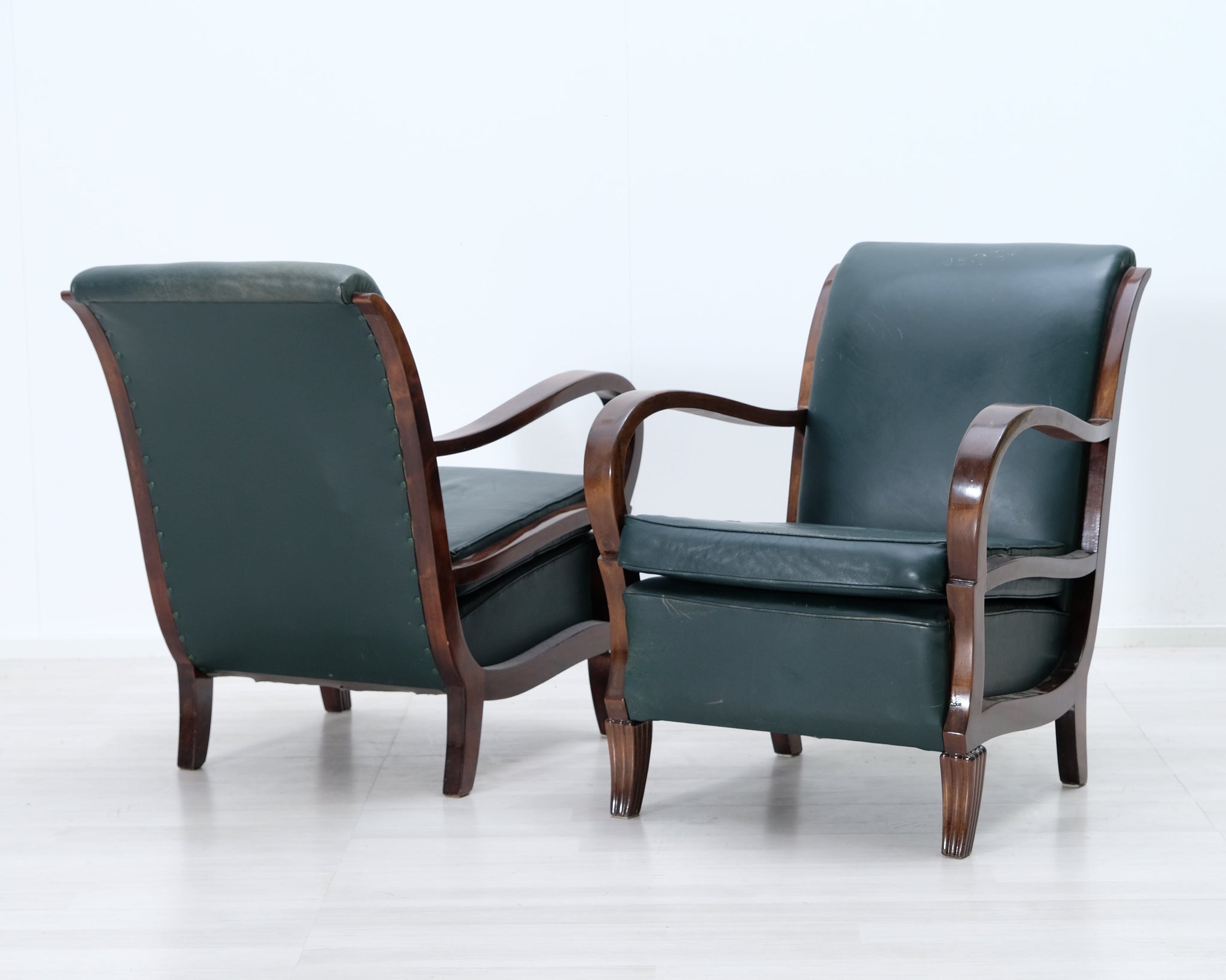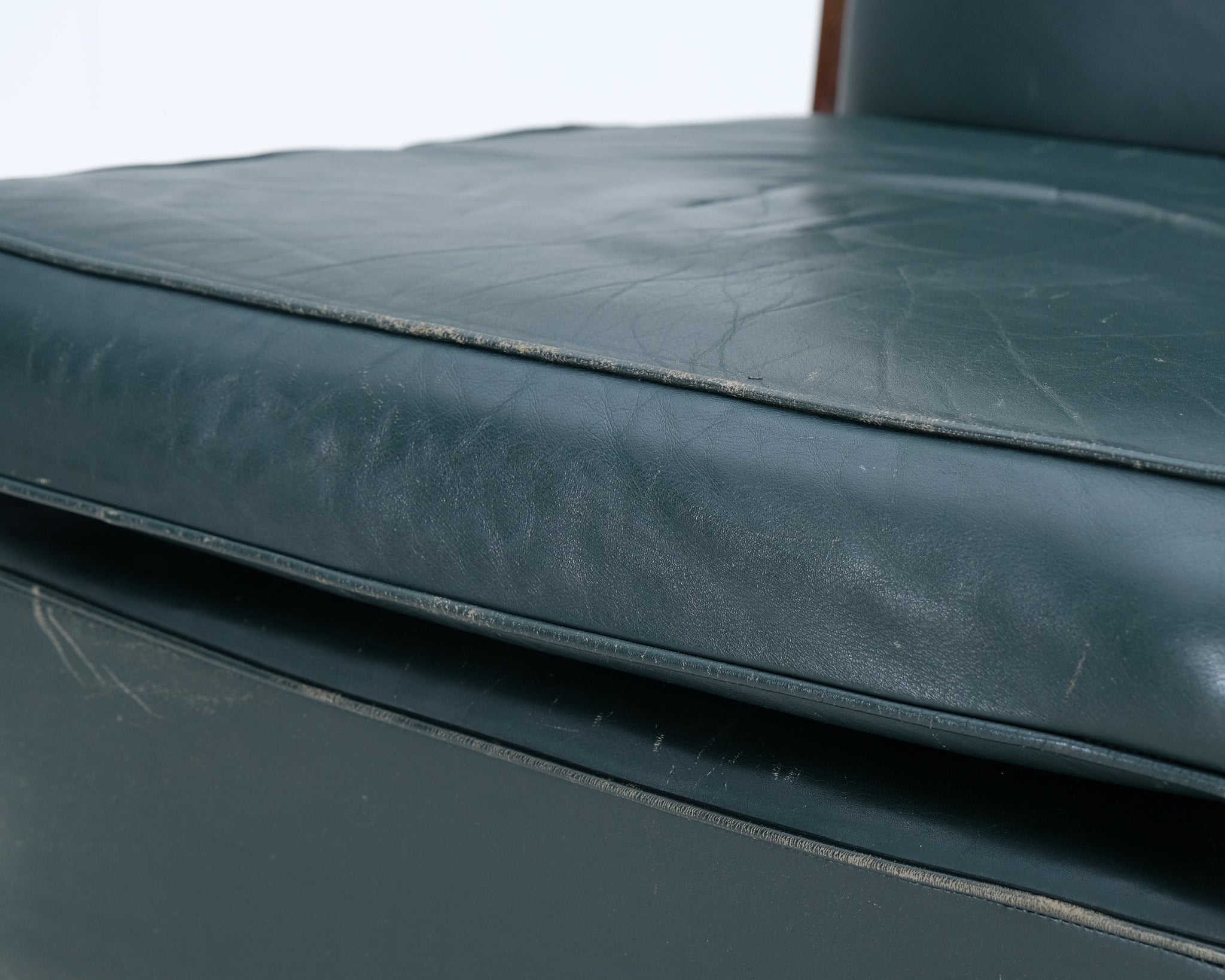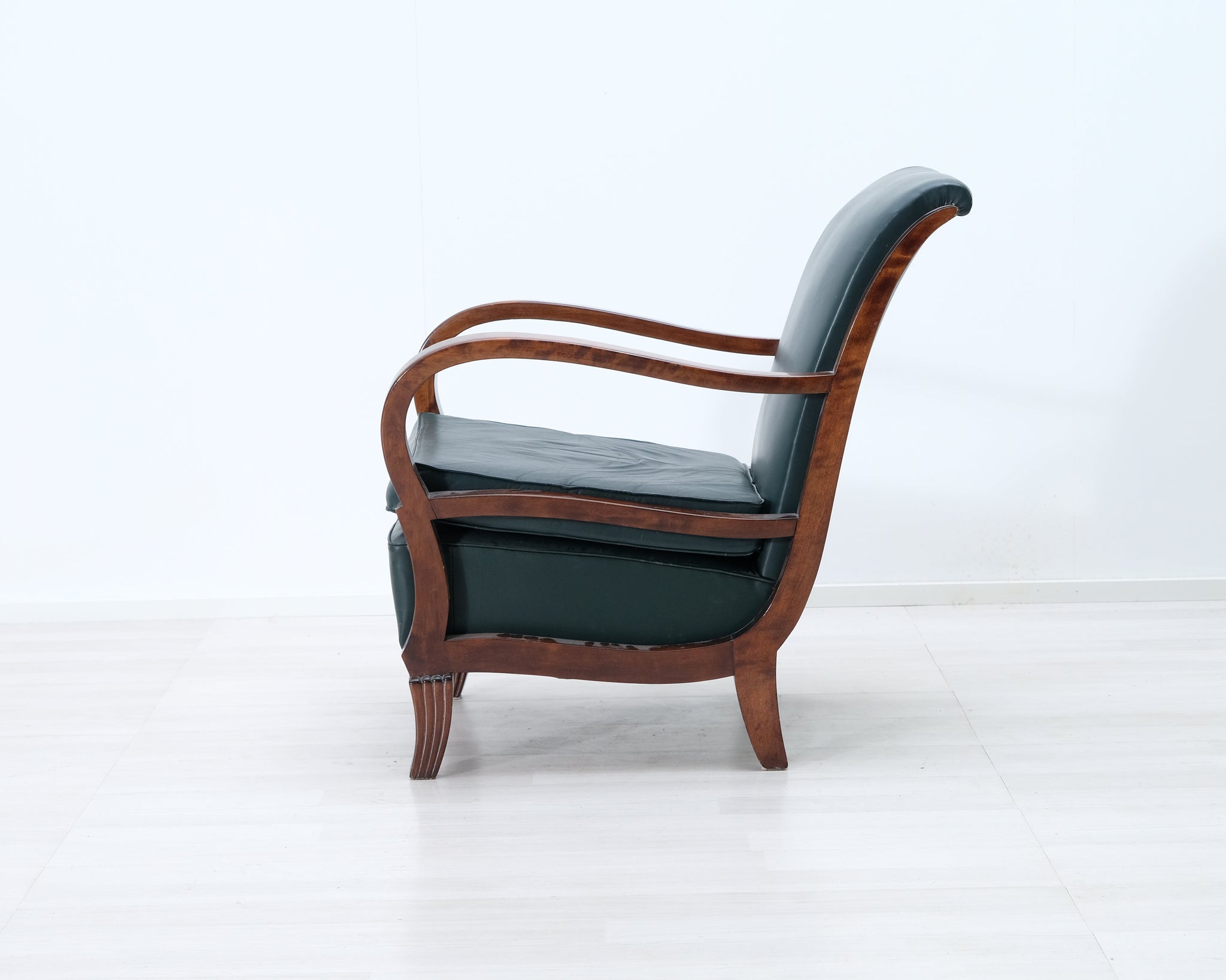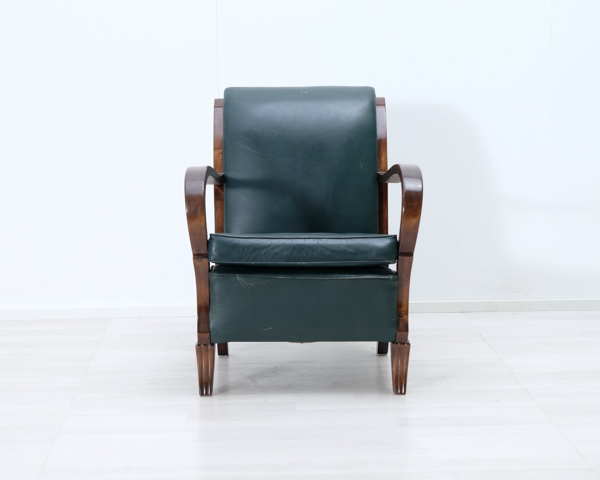 Nojatuoli 1920-luvulta. Vihreä nahkaverhoilu ja puinen runko.
