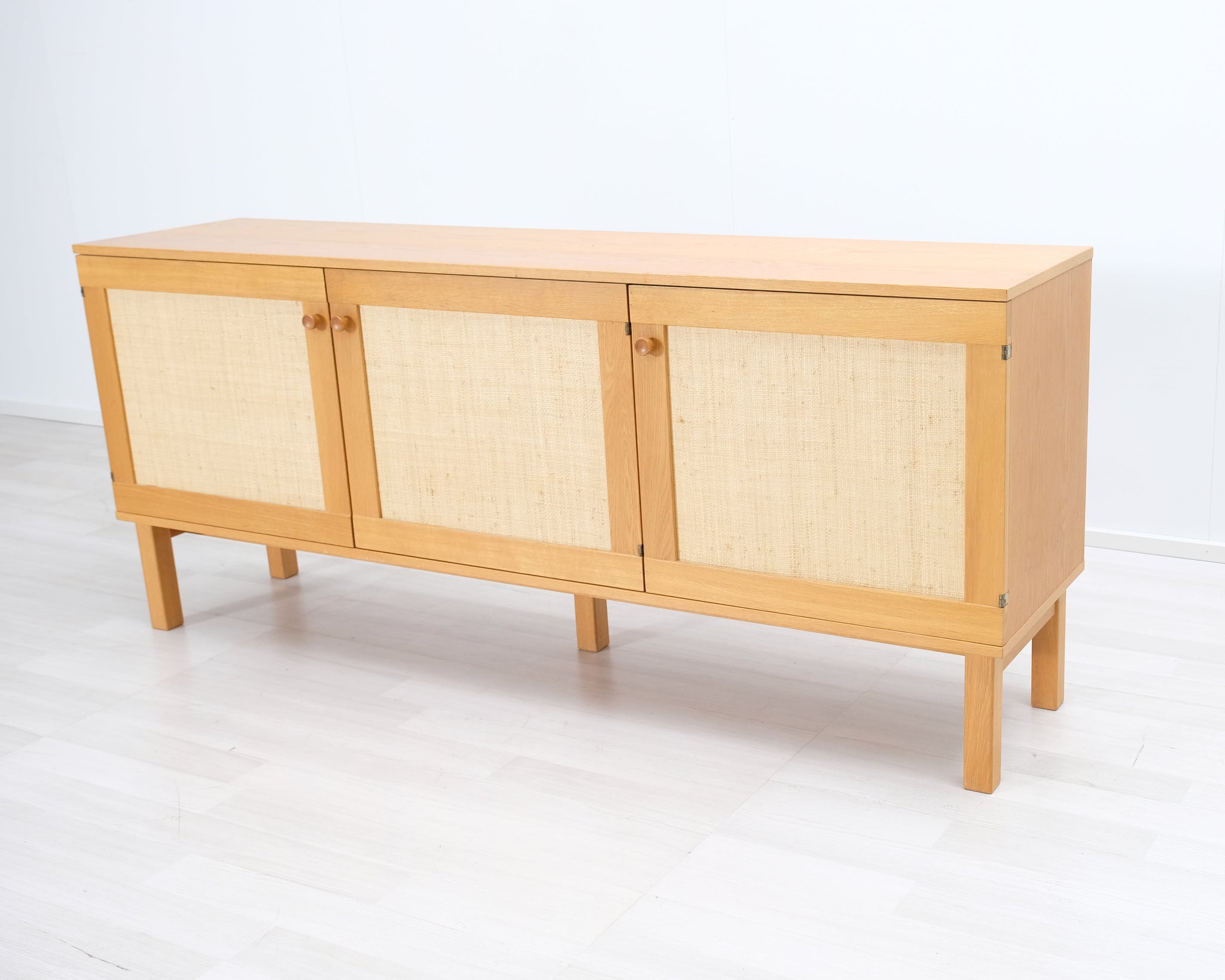 Eevaliisa Vaskon suunnittelema senkki 70-luvulta. Punottu tekstuuri kaapinovissa. Valmistaja Huonekaluliike Mikko Nupponen.
