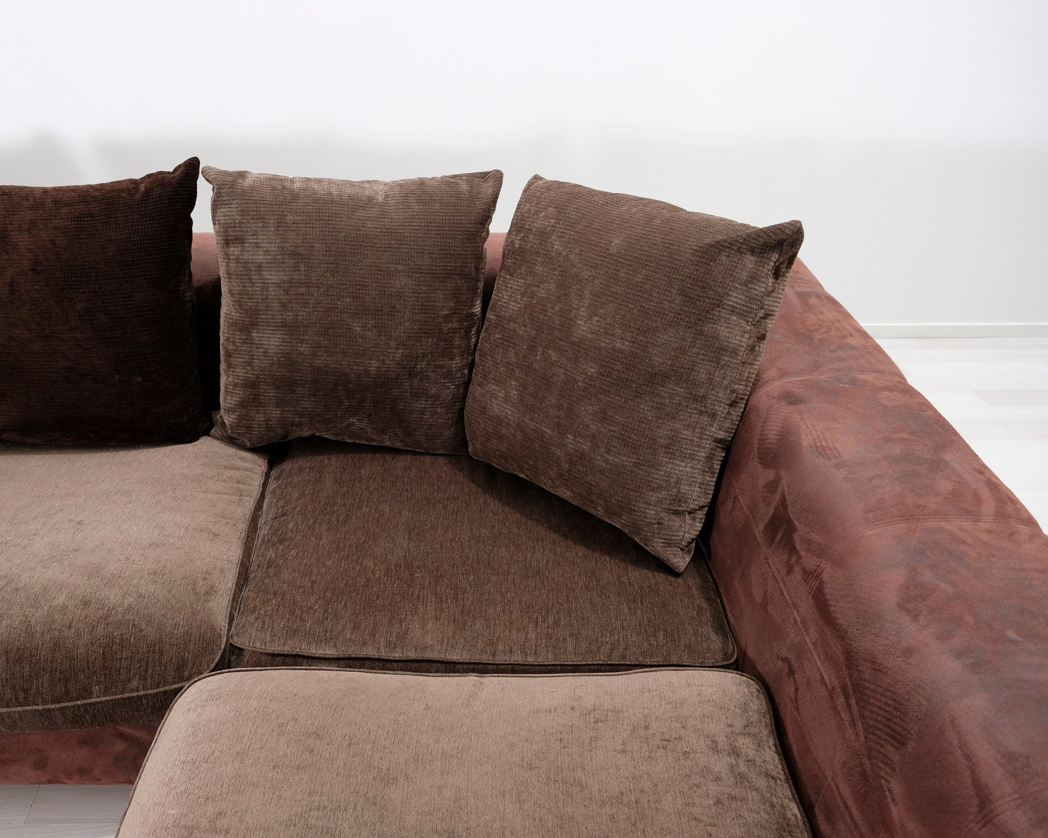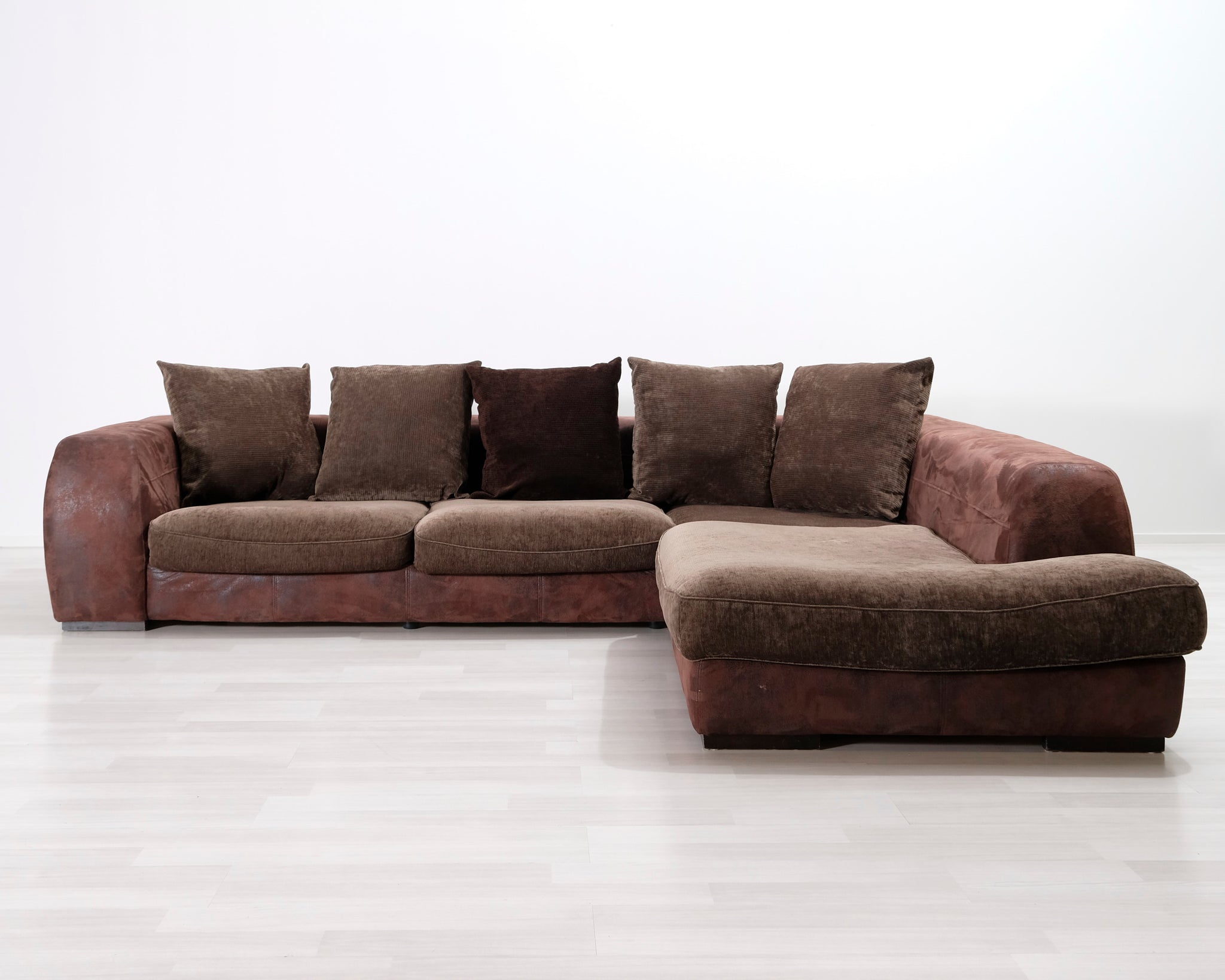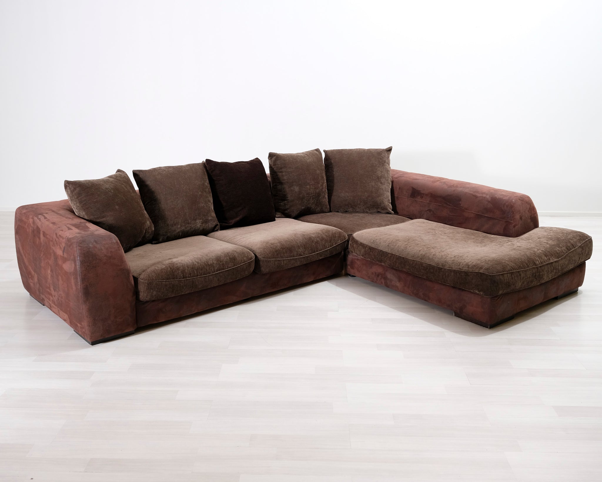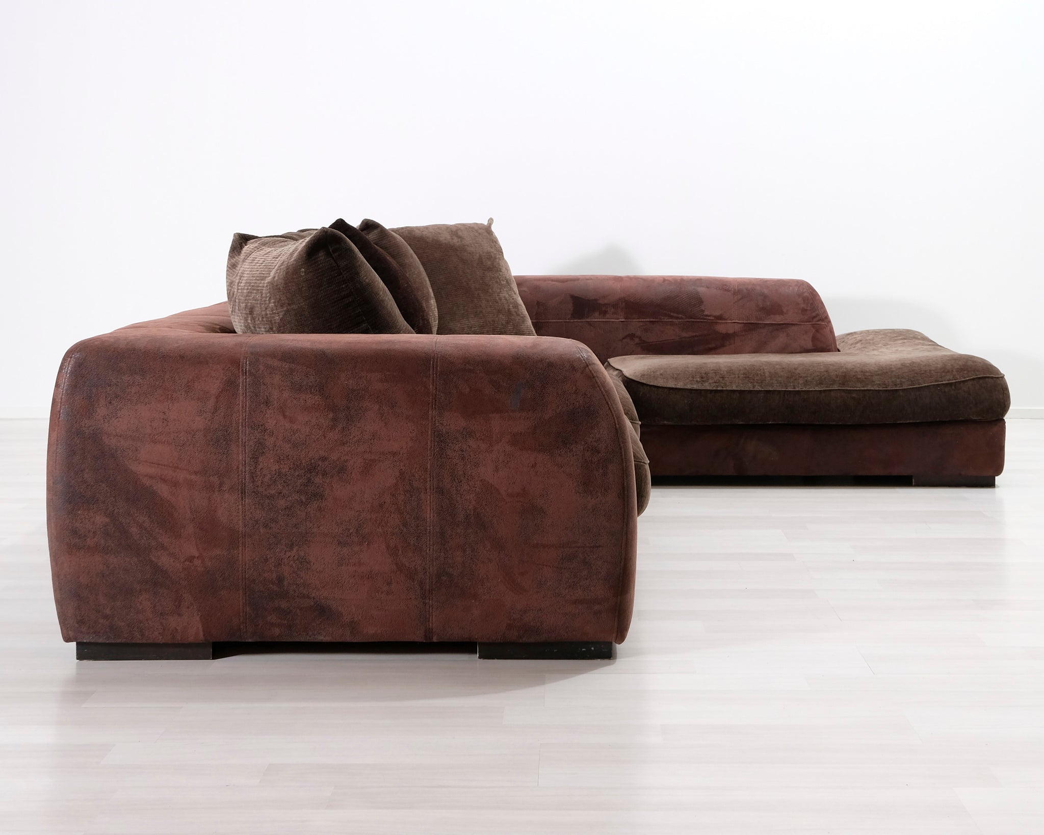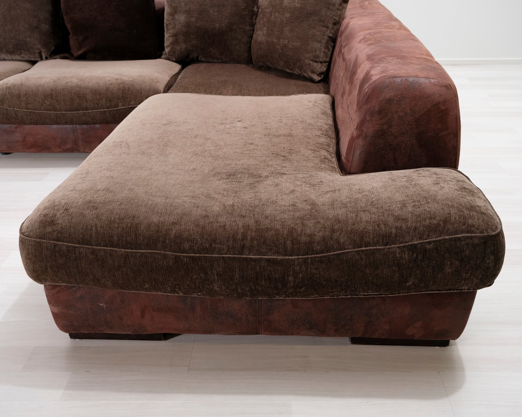 Suurikokoinen avokulmasohva. Runko ja tyynyt verhoiltu kahdella eri ruskealla kankaalla.
