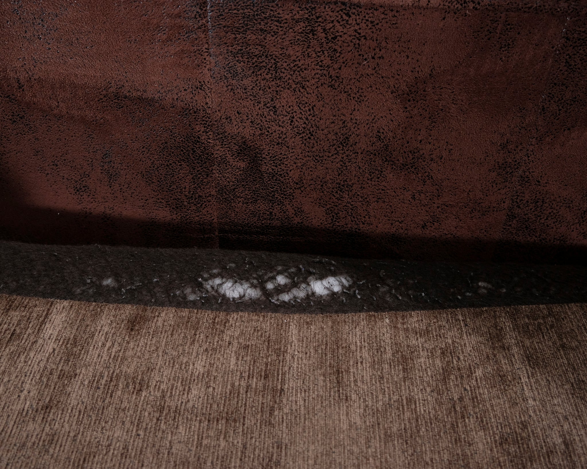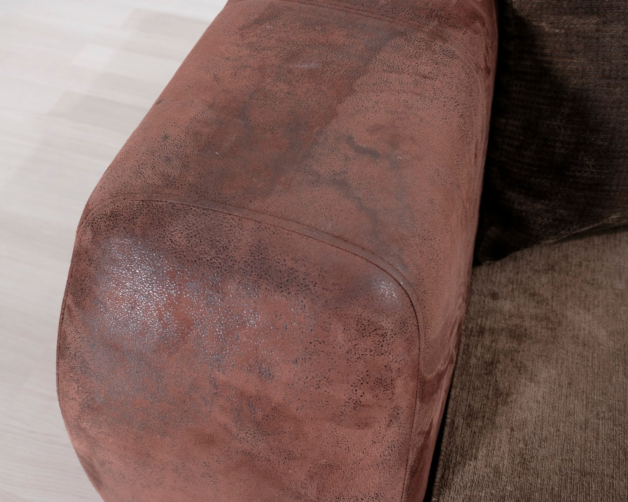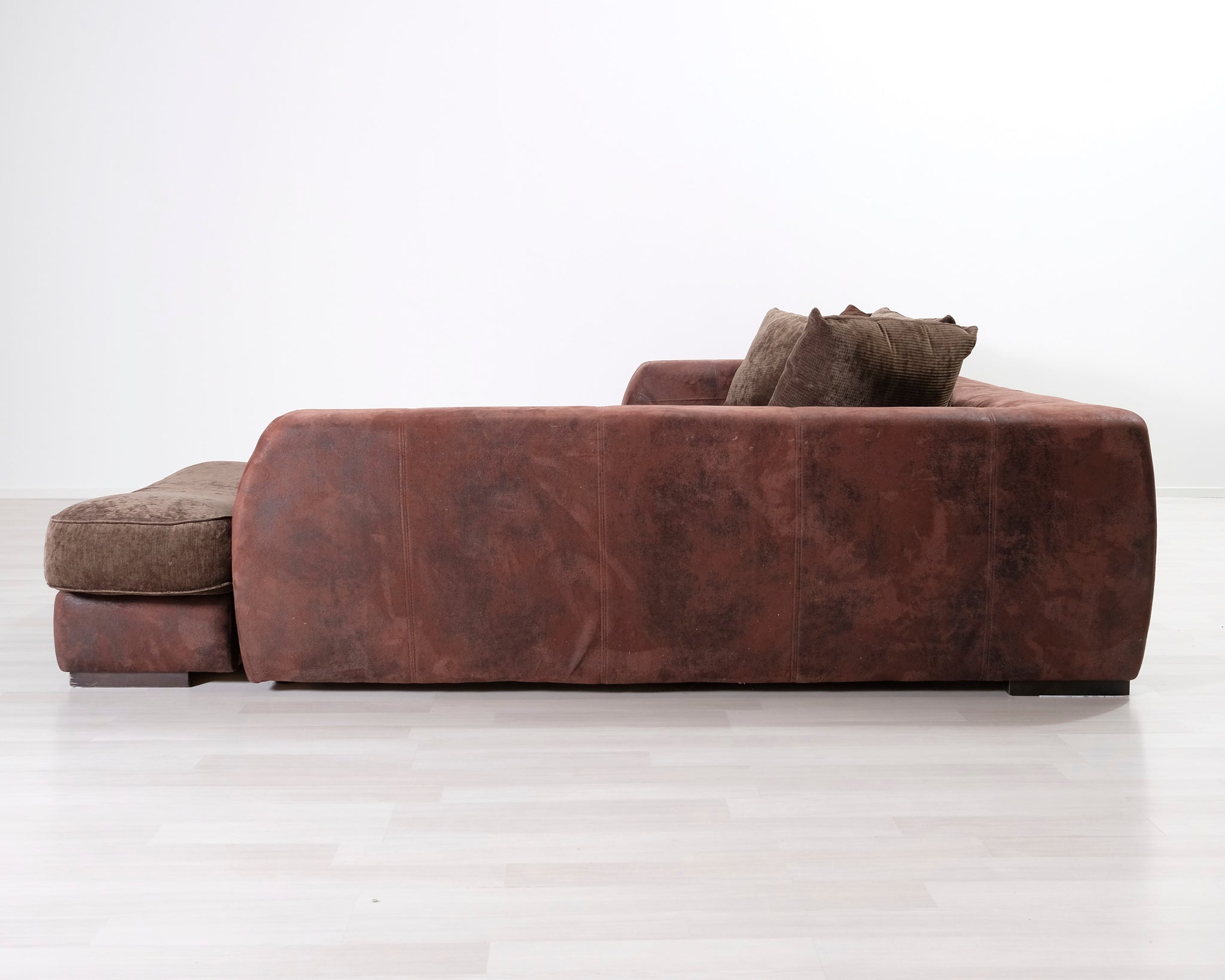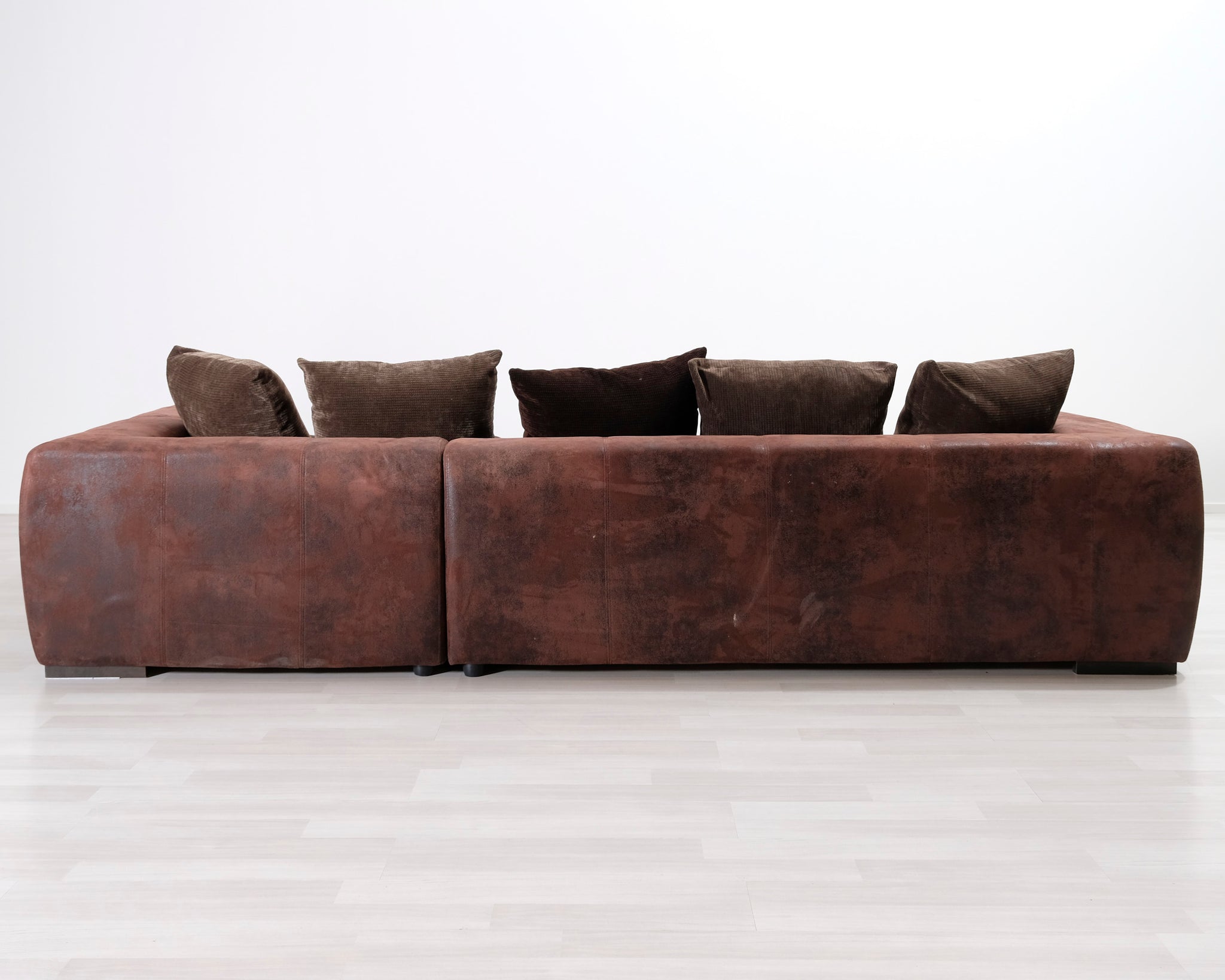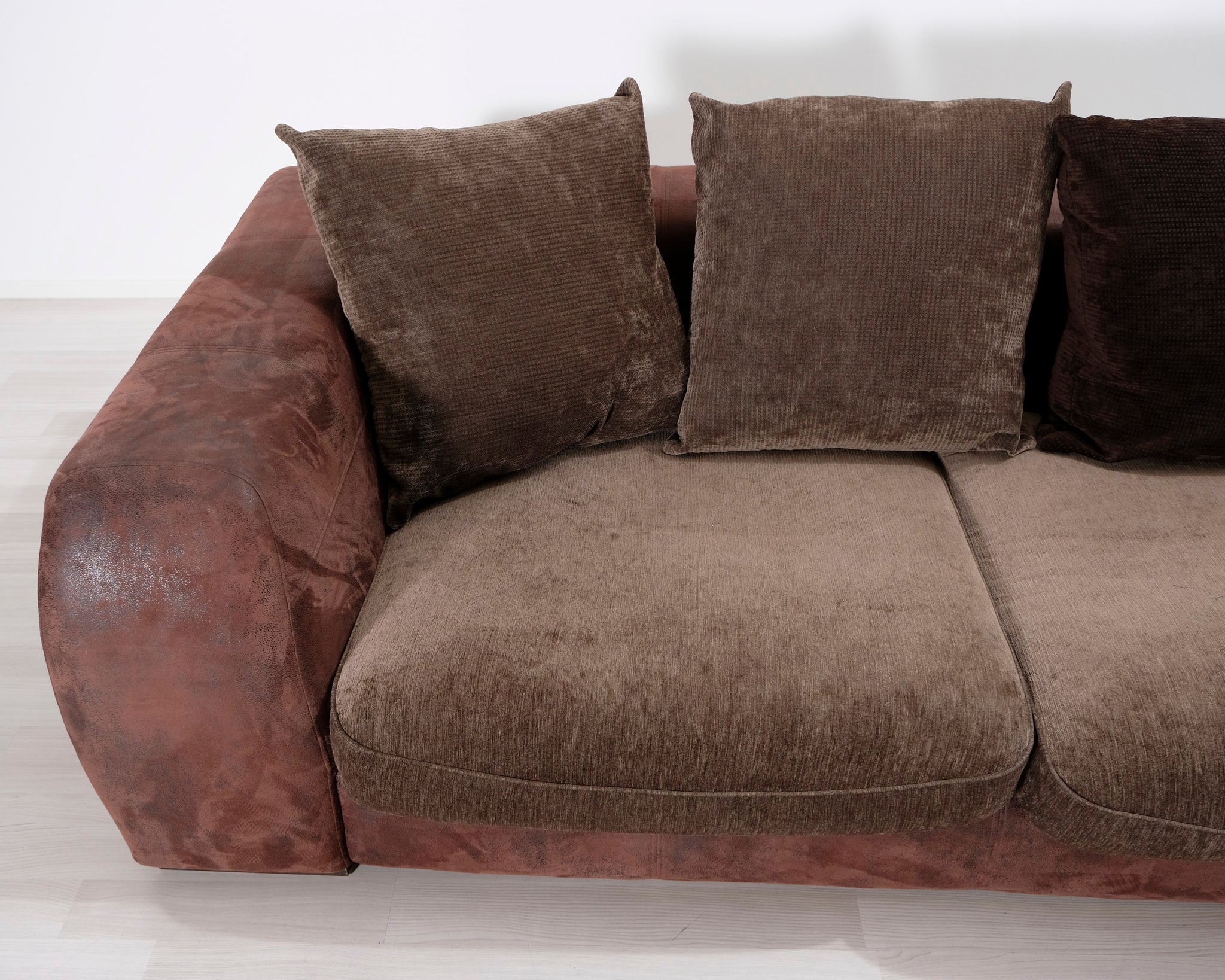 Suurikokoinen avokulmasohva. Runko ja tyynyt verhoiltu kahdella eri ruskealla kankaalla.