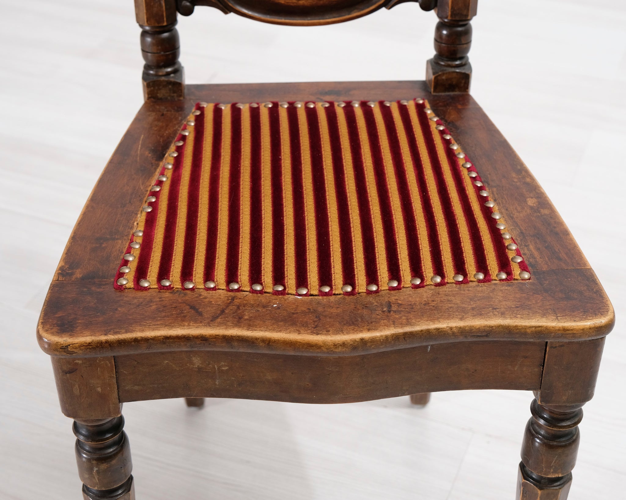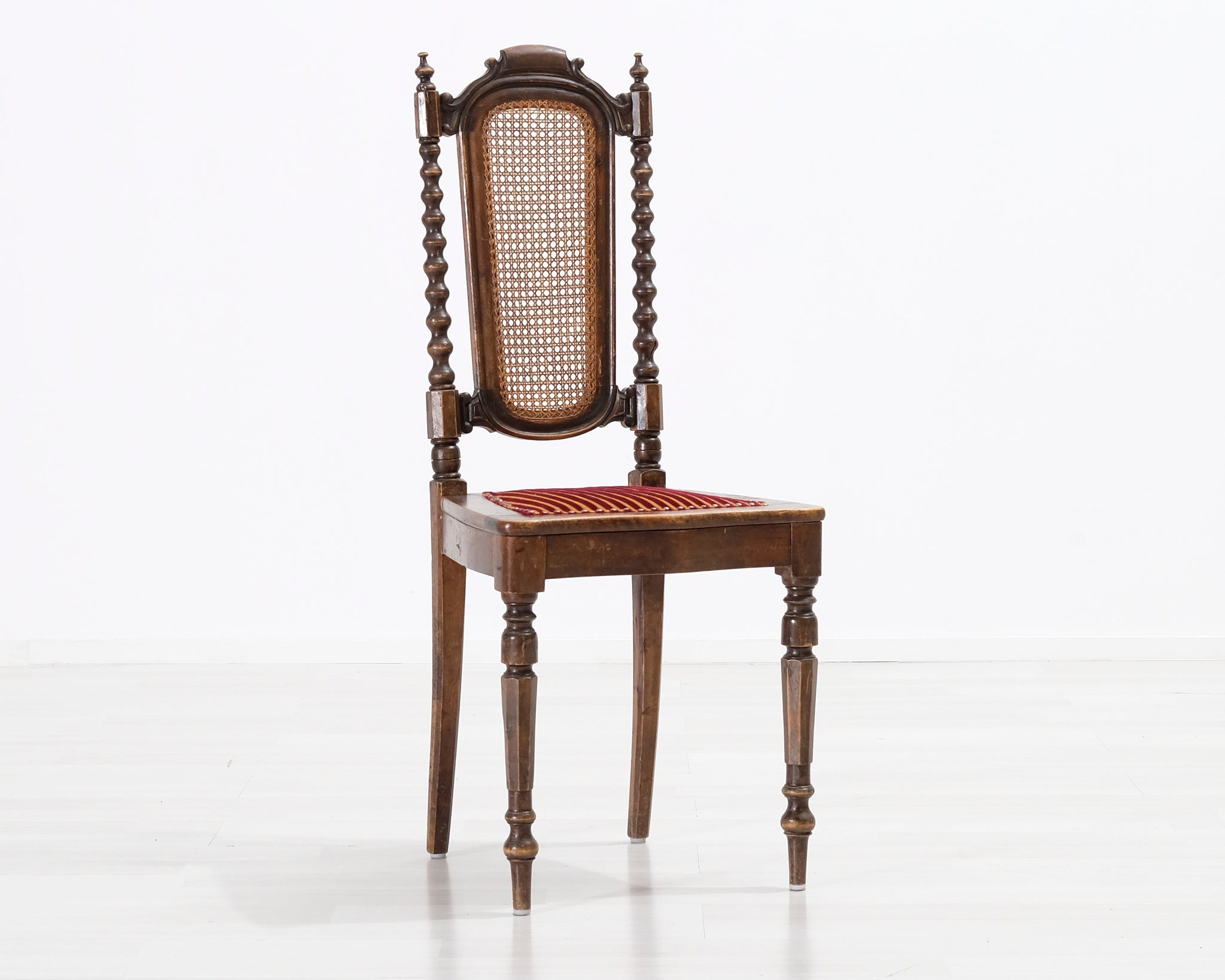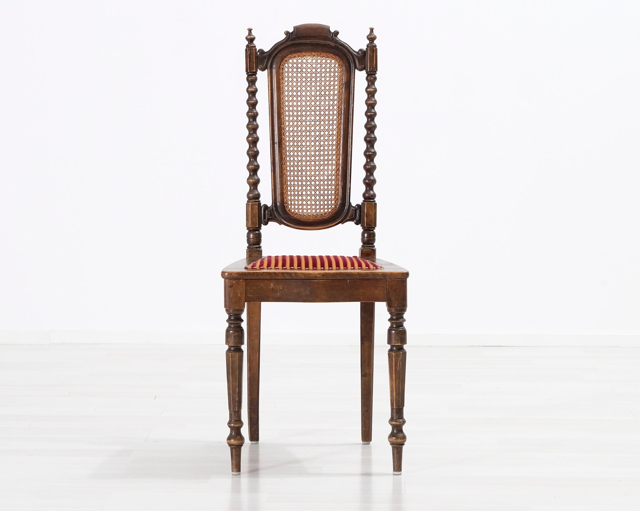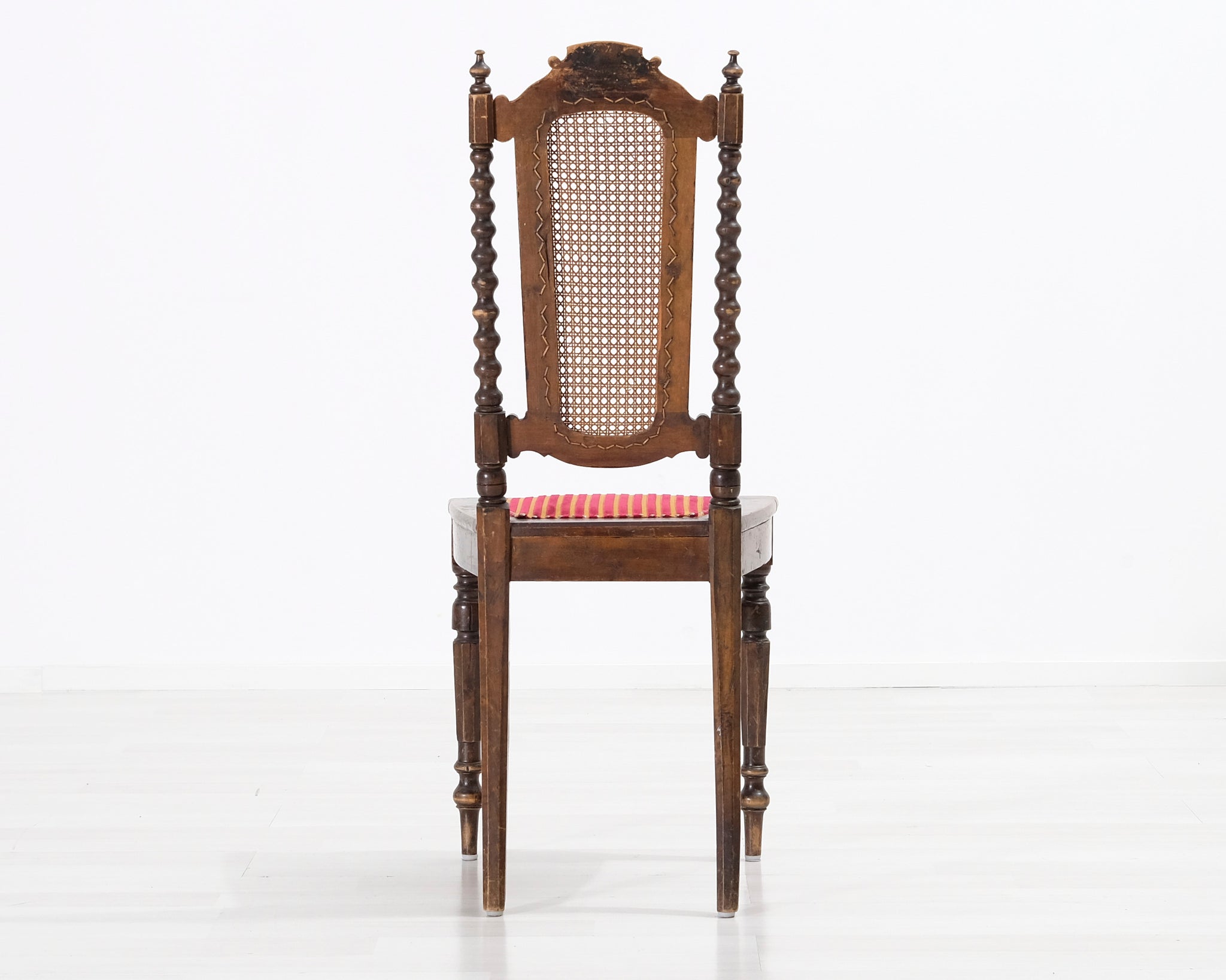 Antiikkinen ruokatuoli raidallisella istuimella. Selkänojassa ja jaloissa paljon koristeellisia yksityiskohtia.