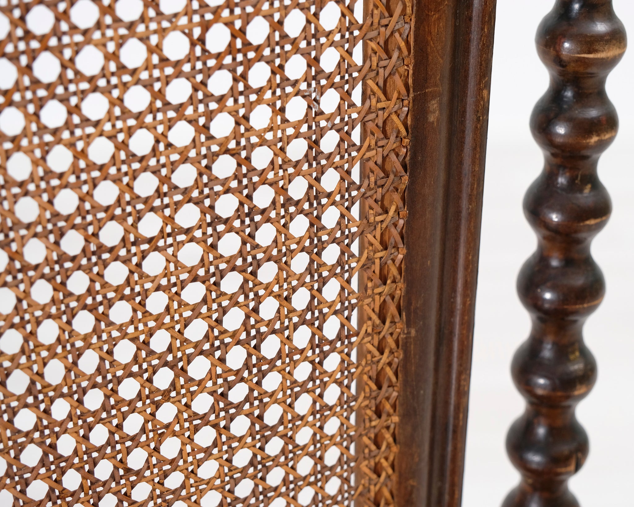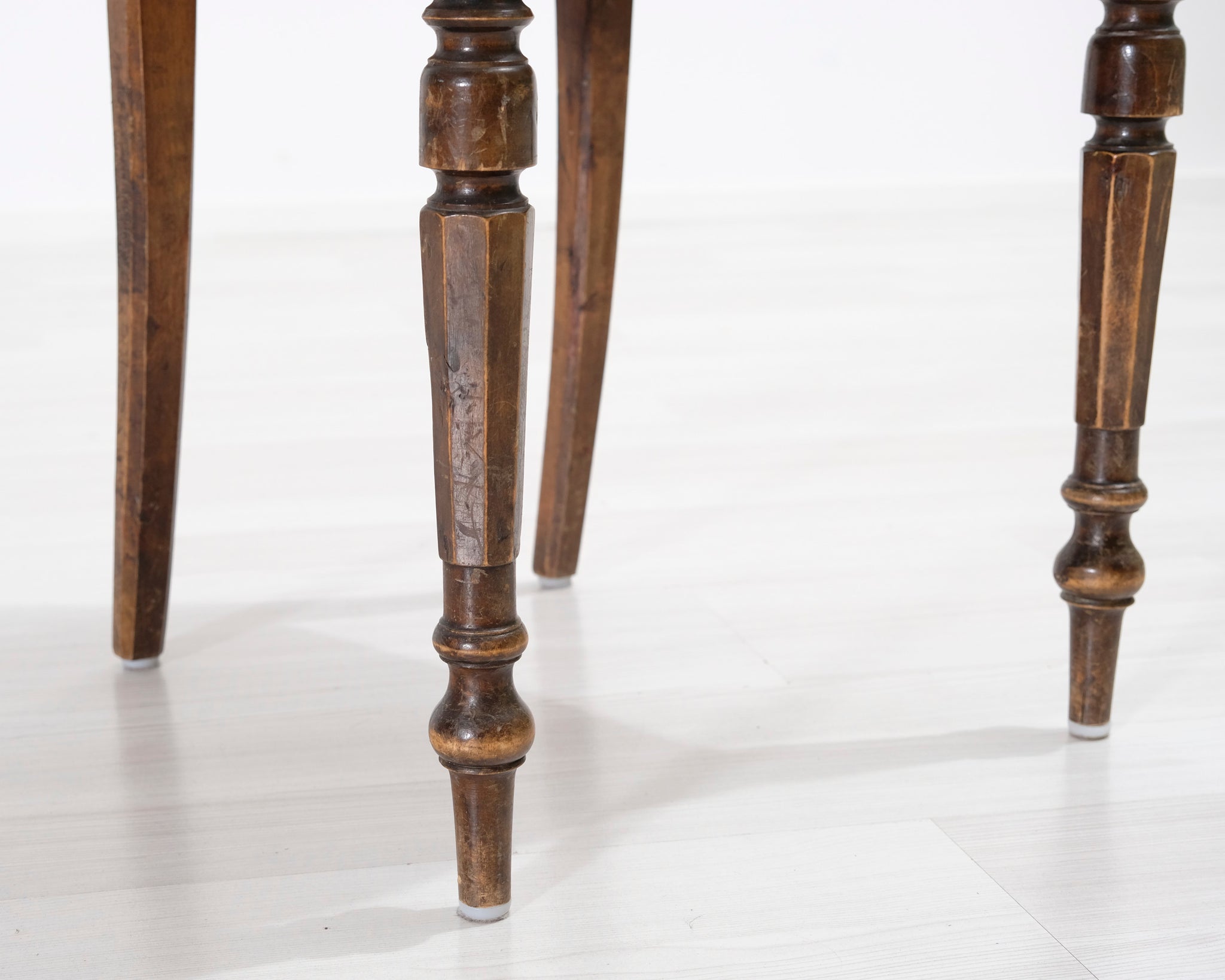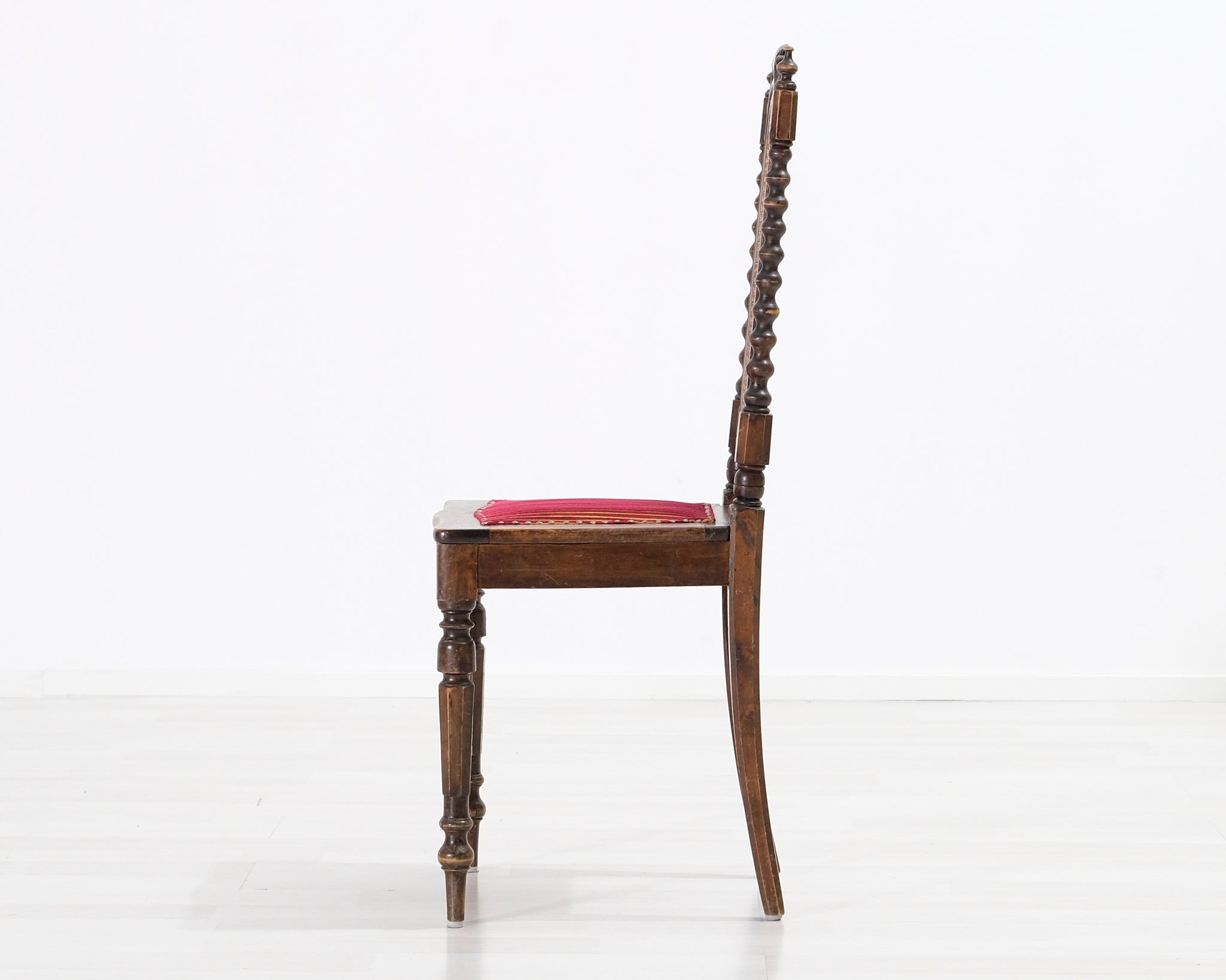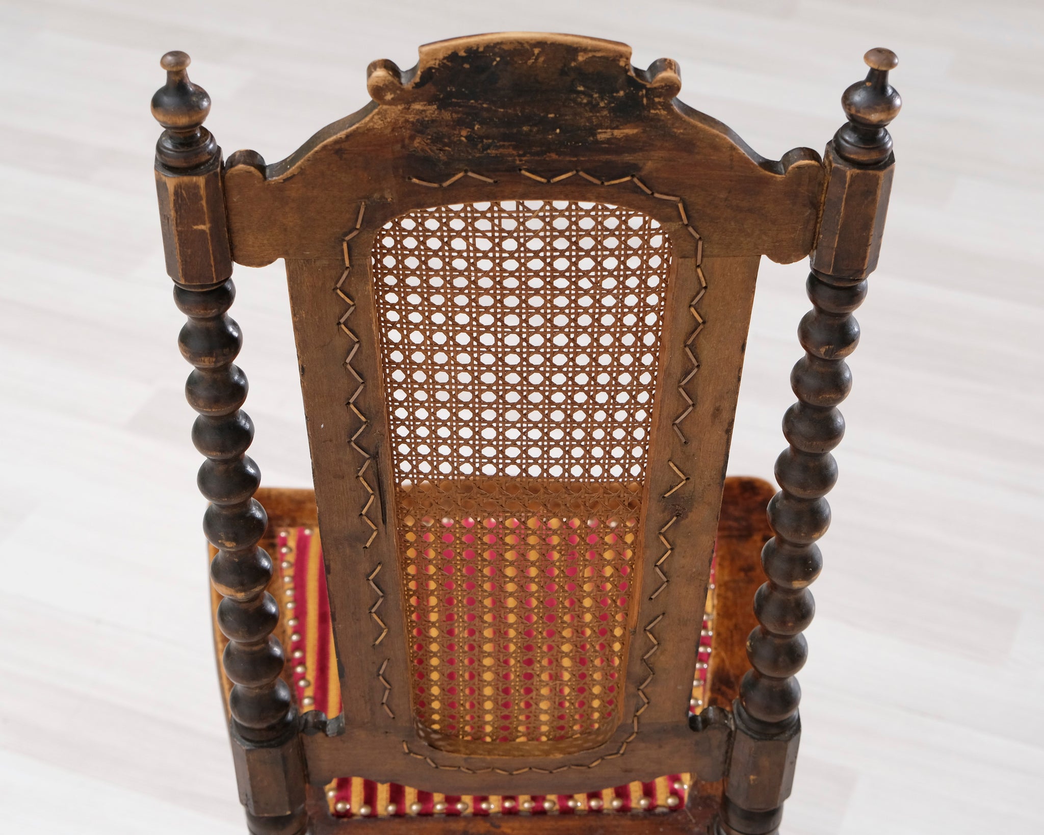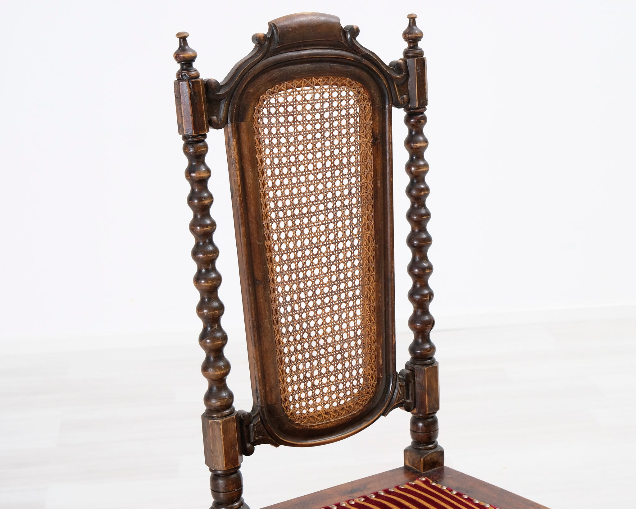 Antiikkinen ruokatuoli raidallisella istuimella. Selkänojassa ja jaloissa paljon koristeellisia yksityiskohtia.