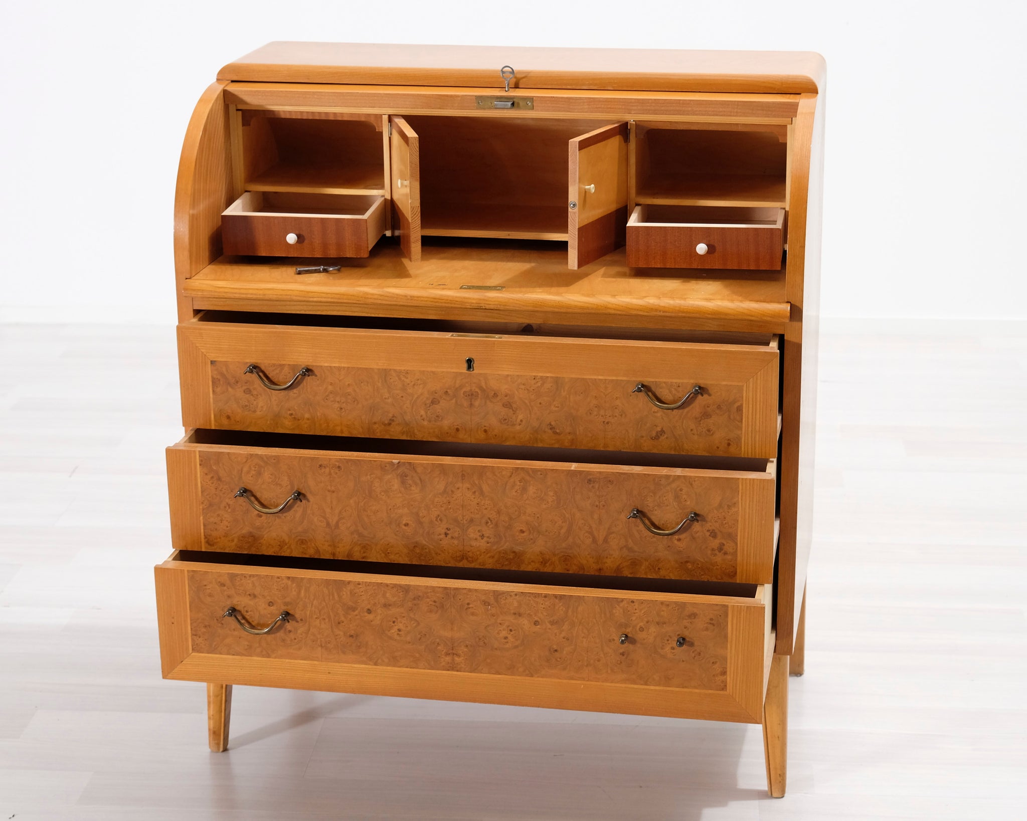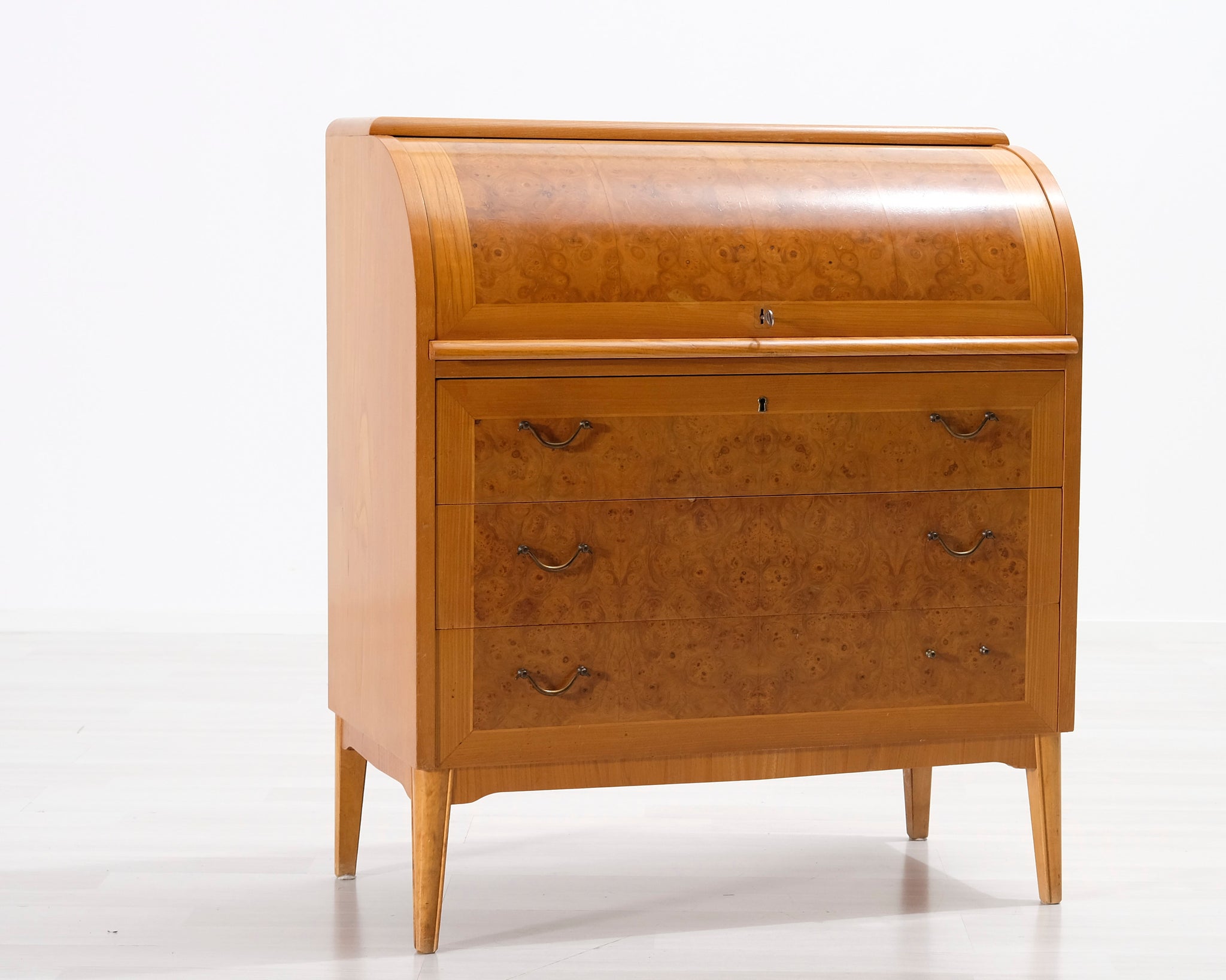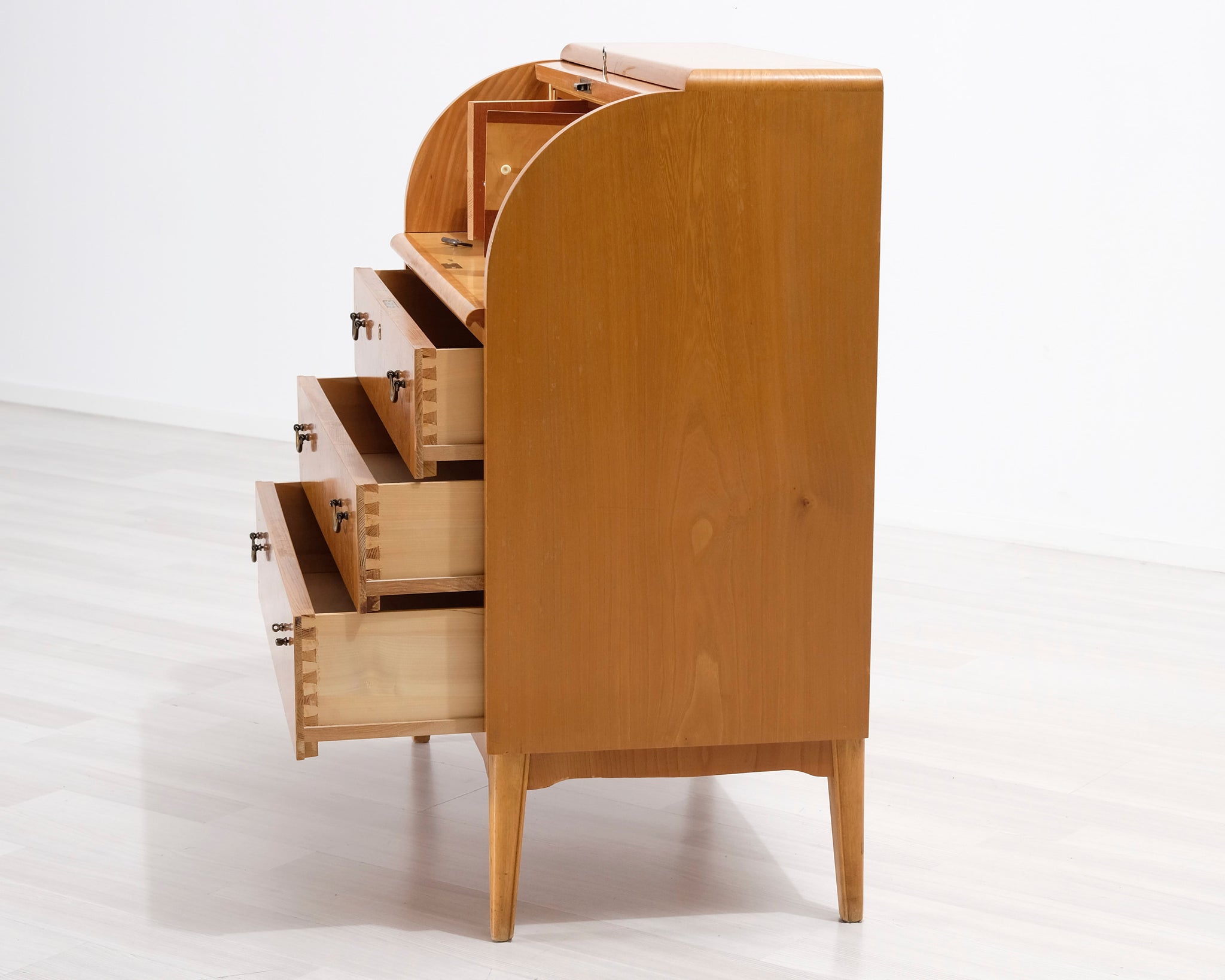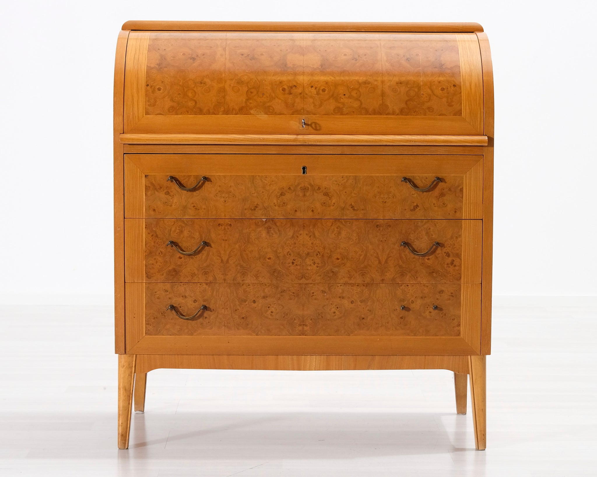 Antiikkinen lipasto kolmella vetolaatikolla. Lipaston yläosassa rulokaappi, jonka takana pieniä laatikoita ja lokeroita.