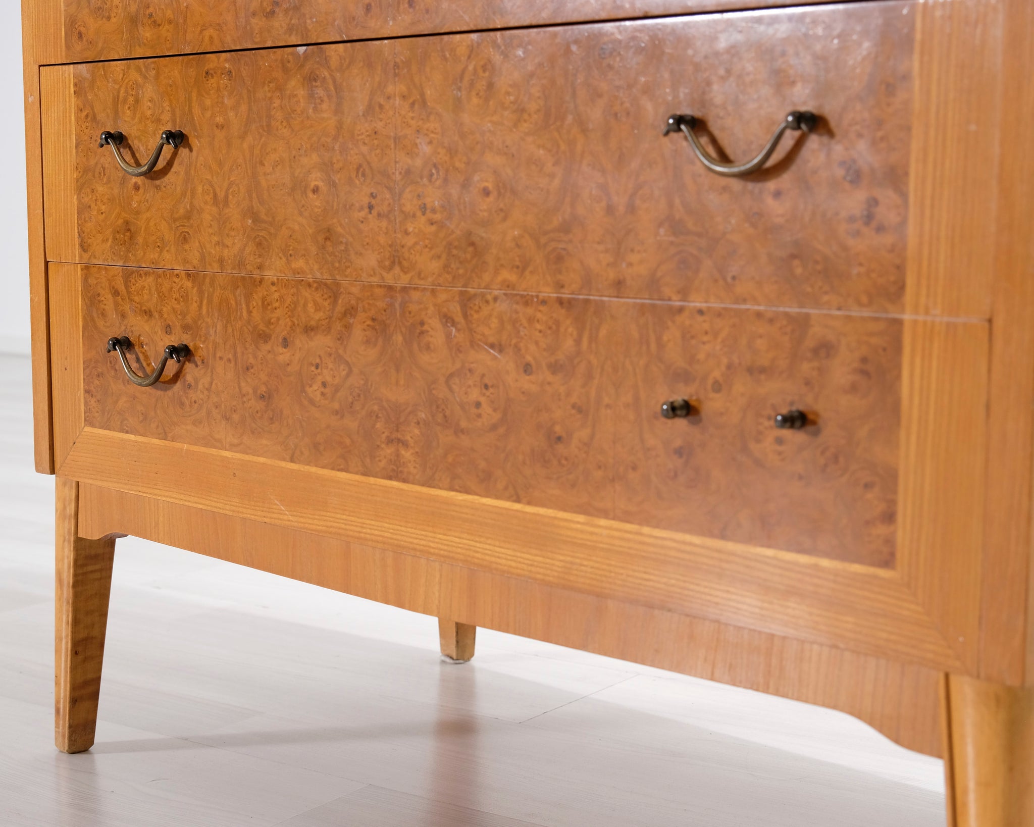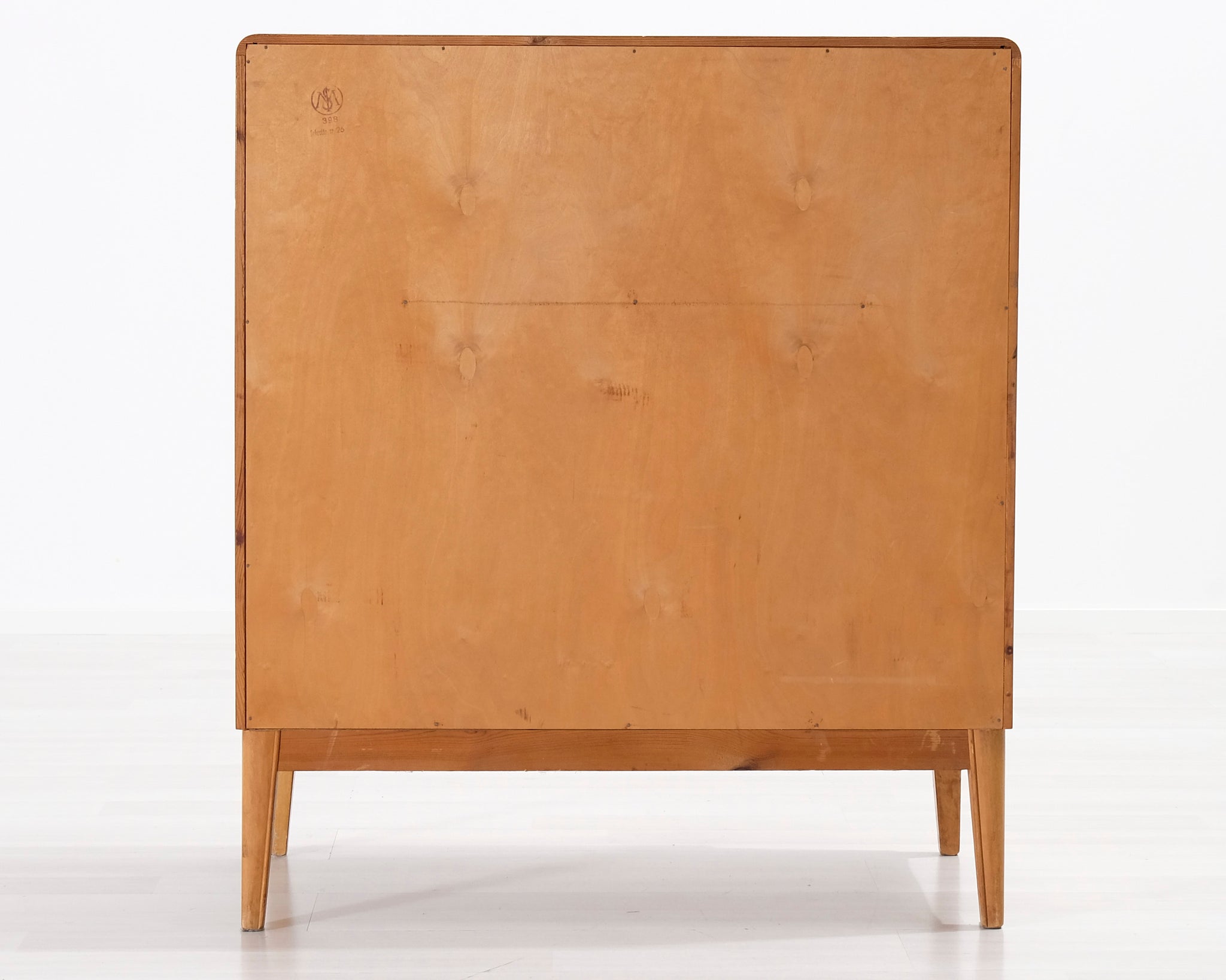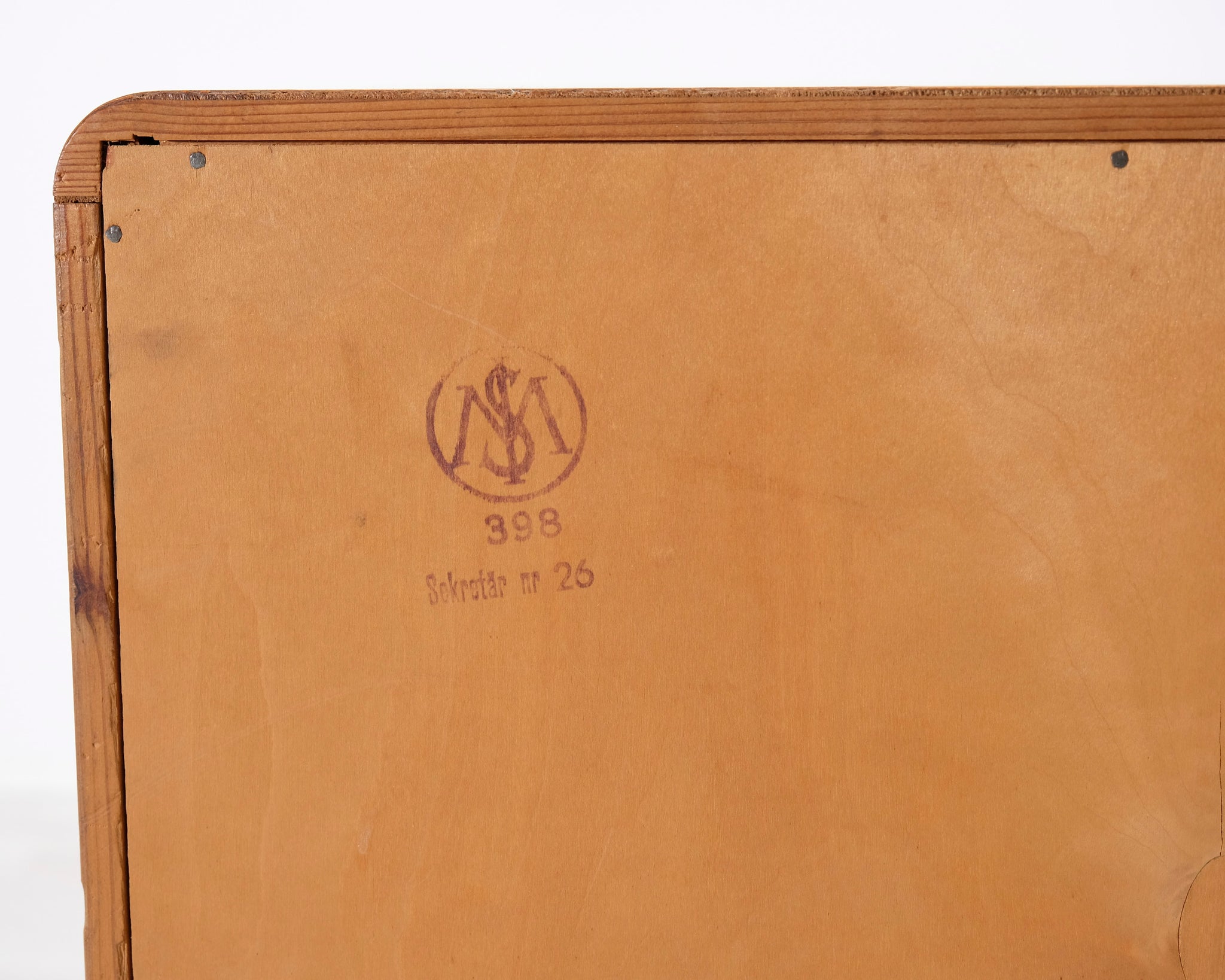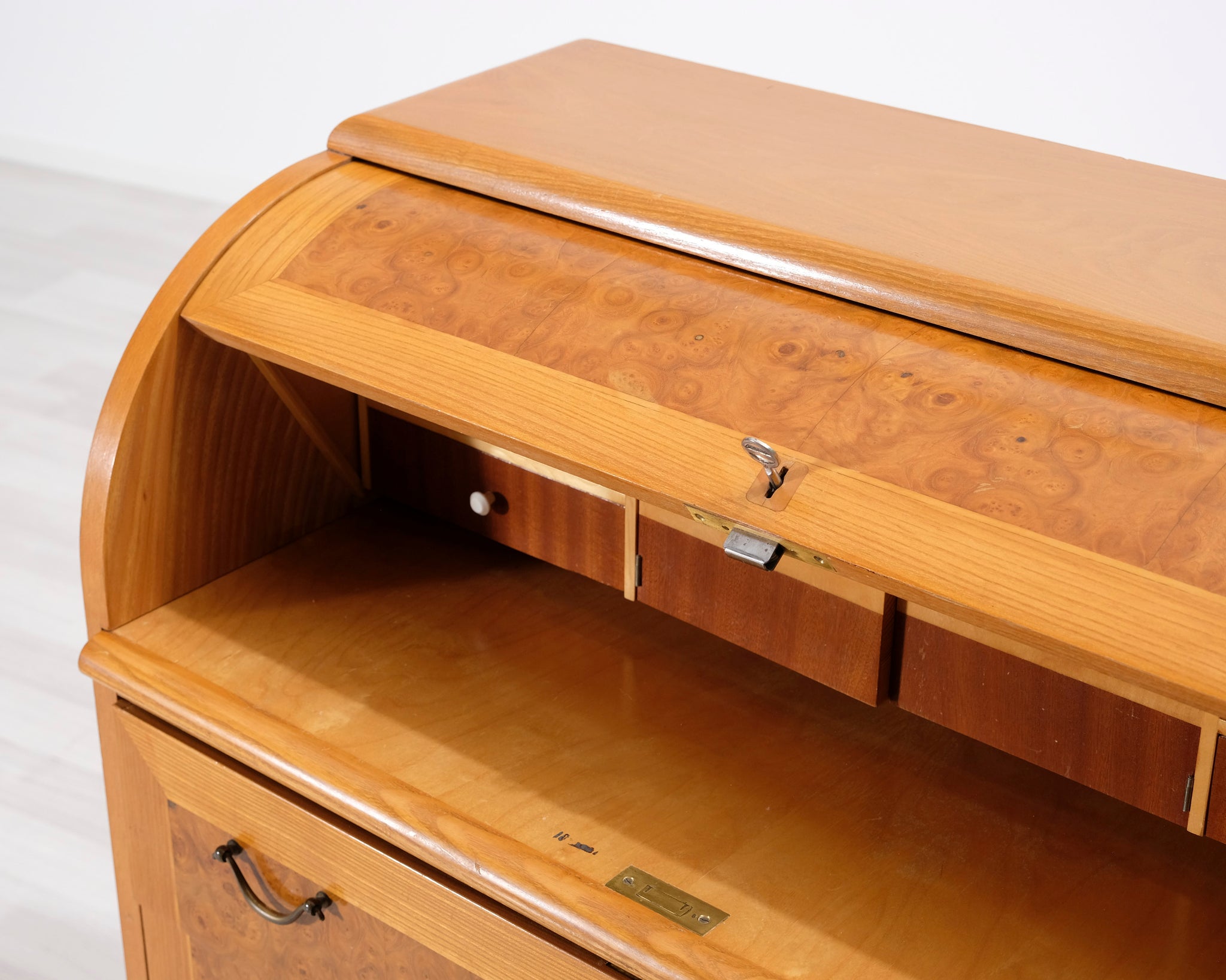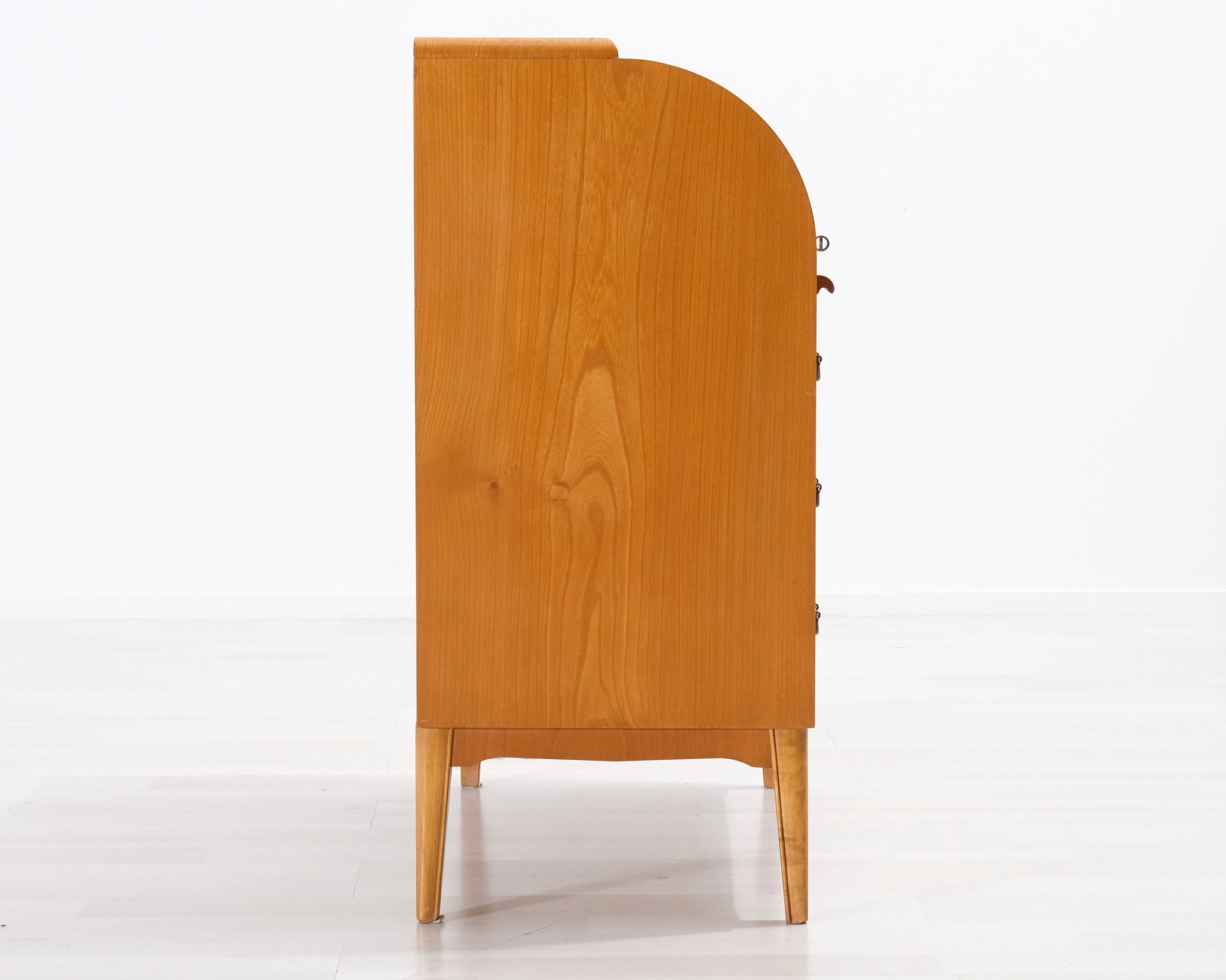 Antiikkinen lipasto kolmella vetolaatikolla. Lipaston yläosassa rulokaappi, jonka takana pieniä laatikoita ja lokeroita.
