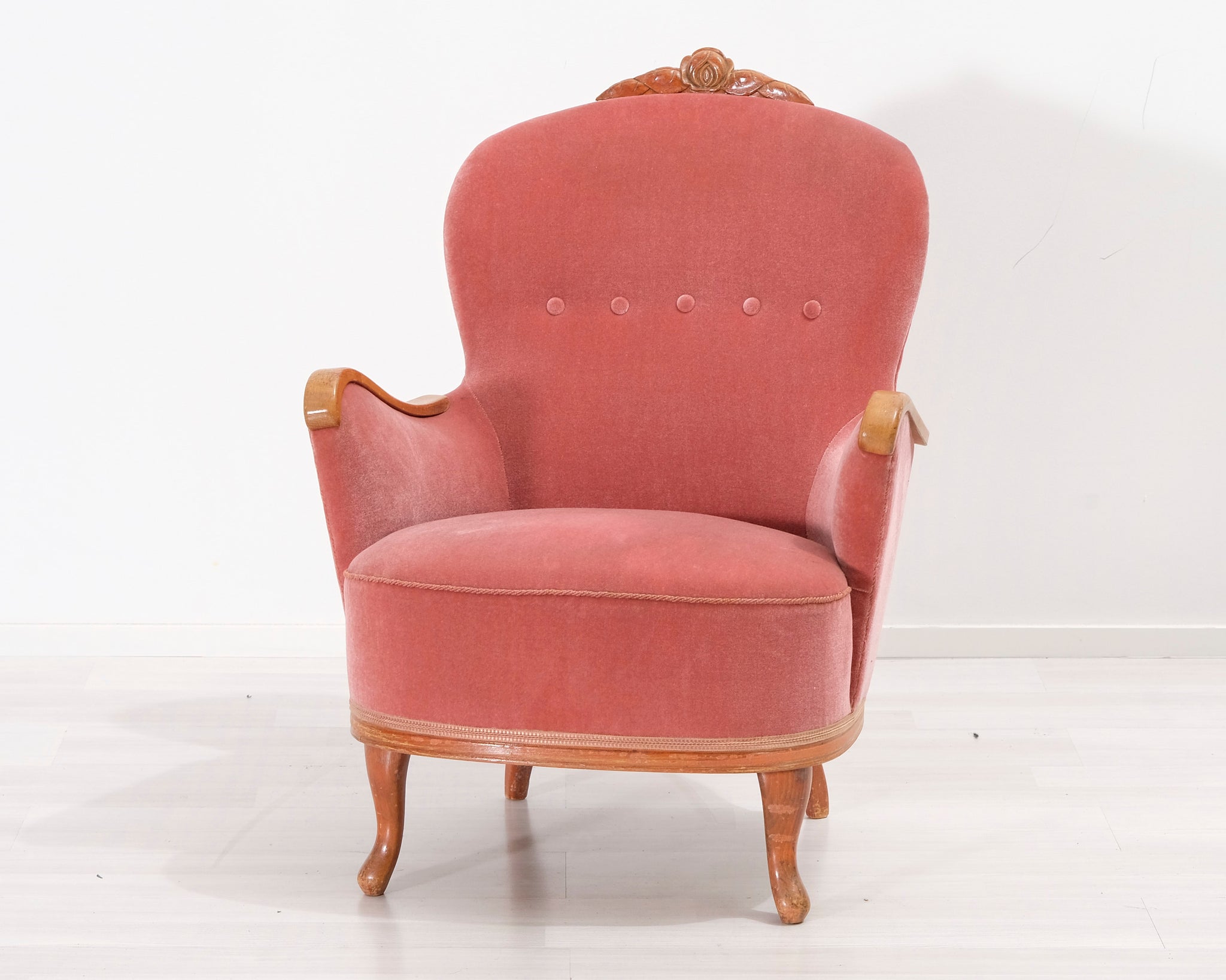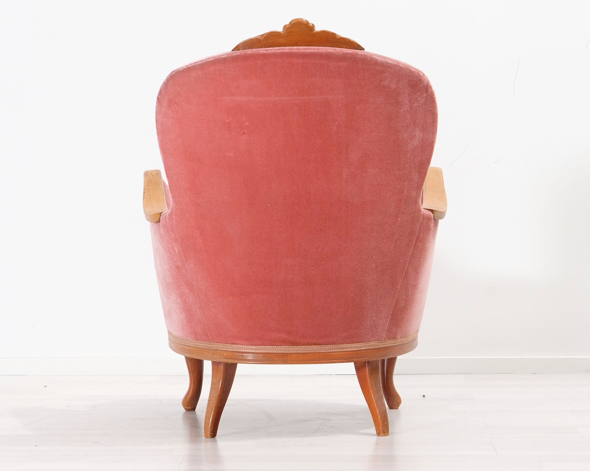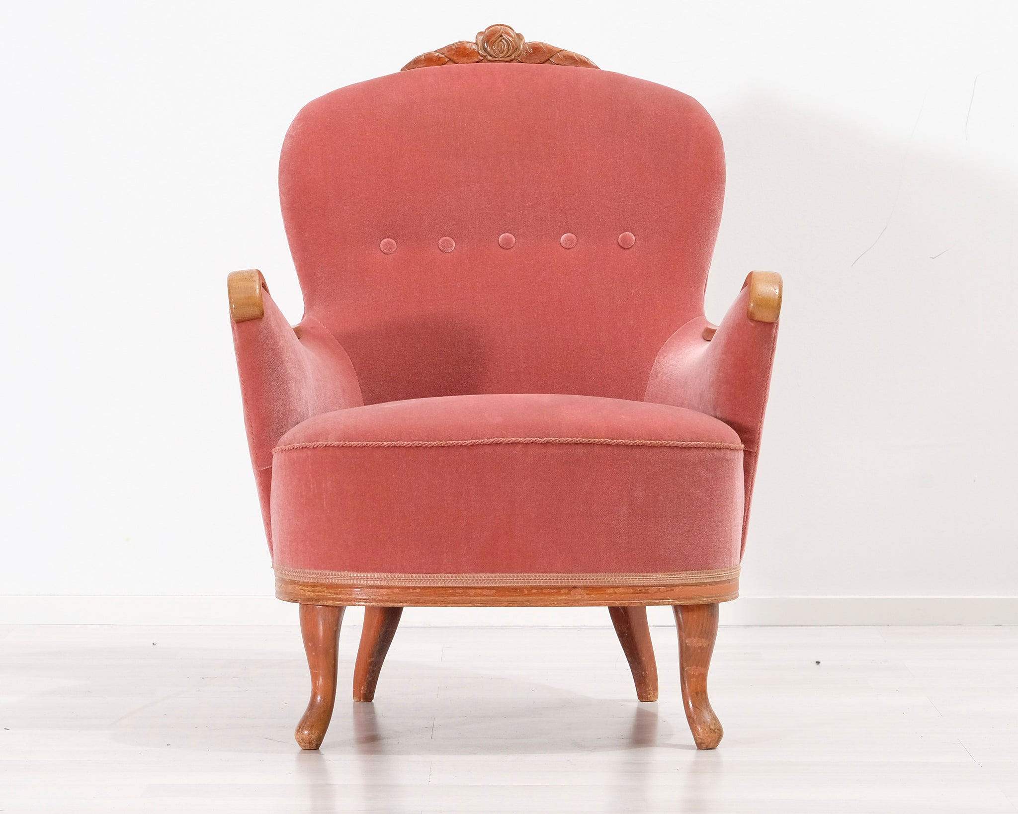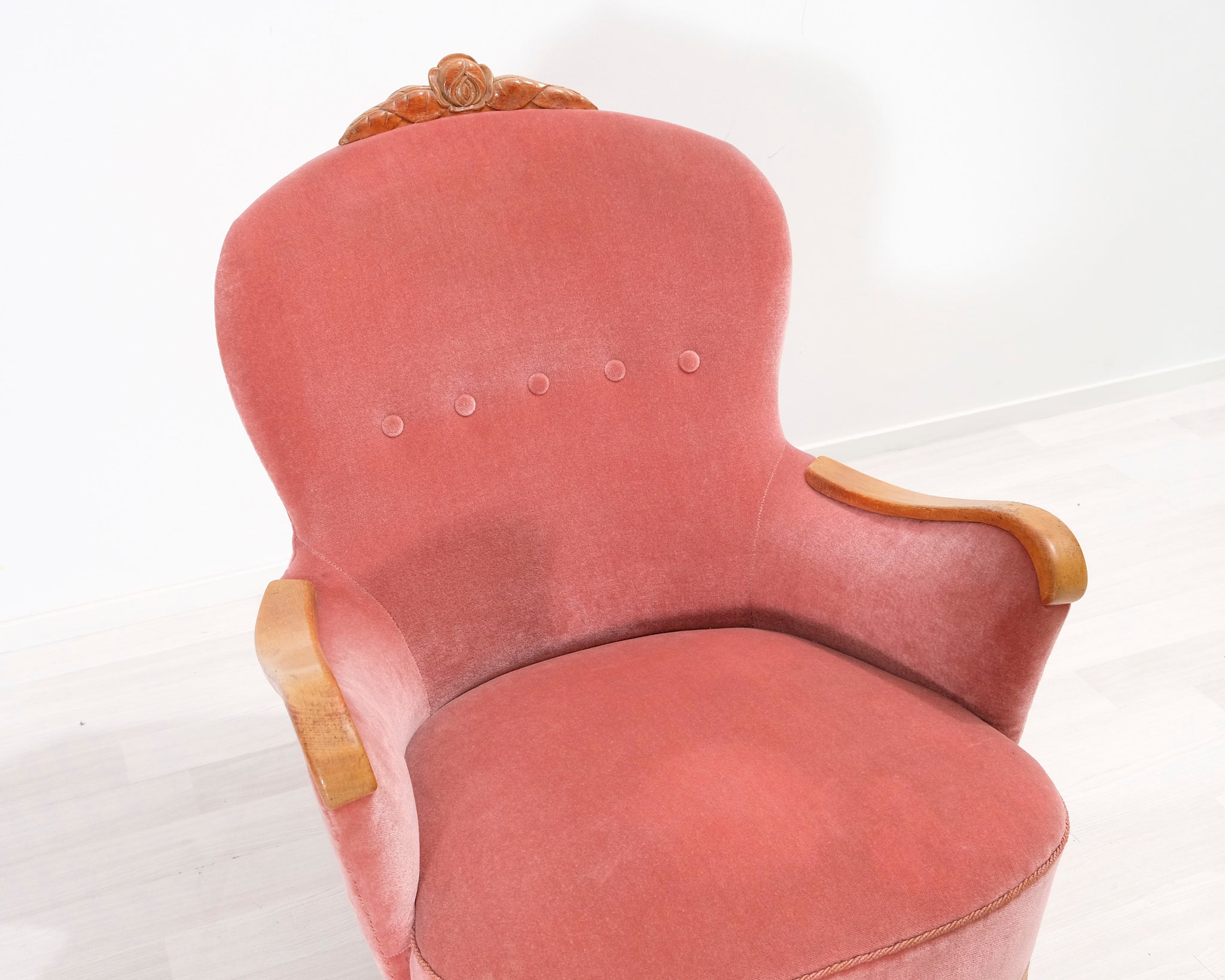 Marjapuuron värinen antiikkinen samettinojatuoli suloisilla ruusuornamenteilla.
