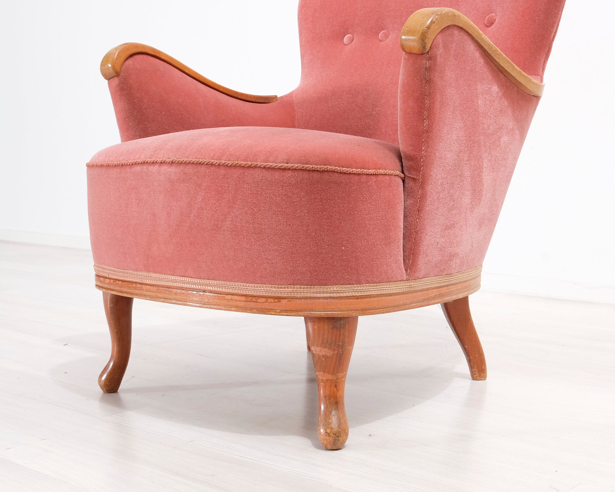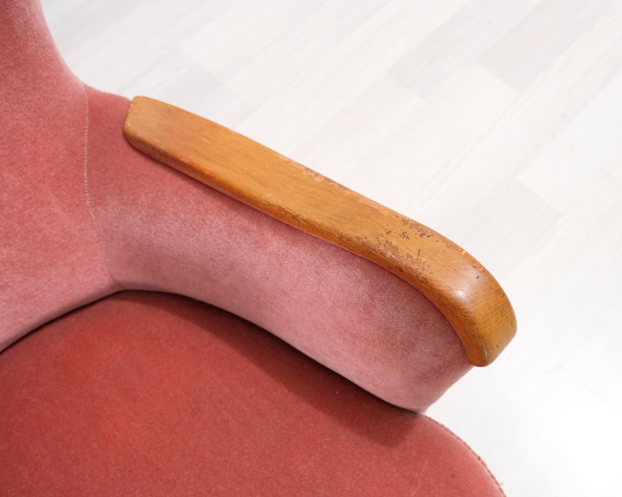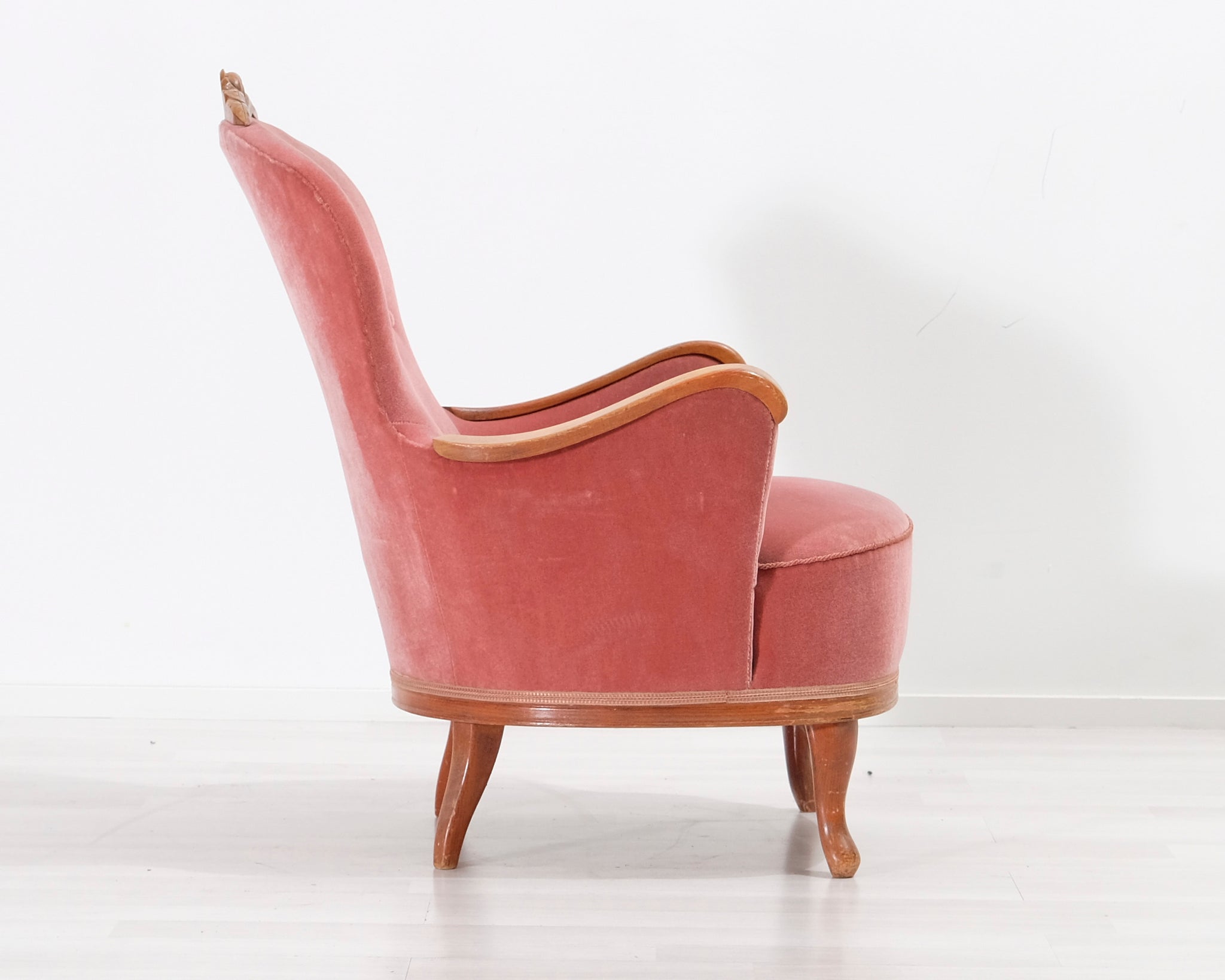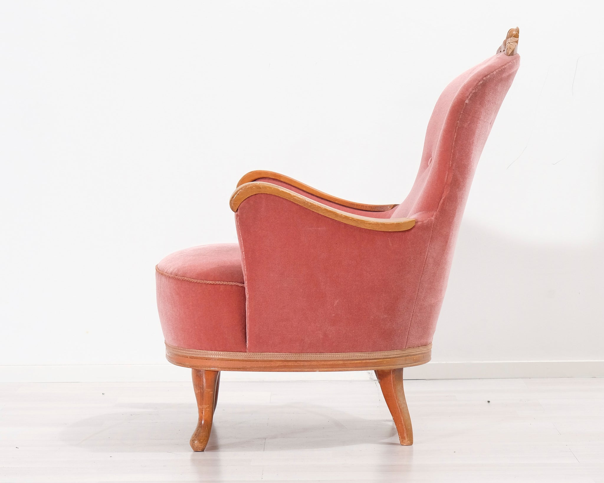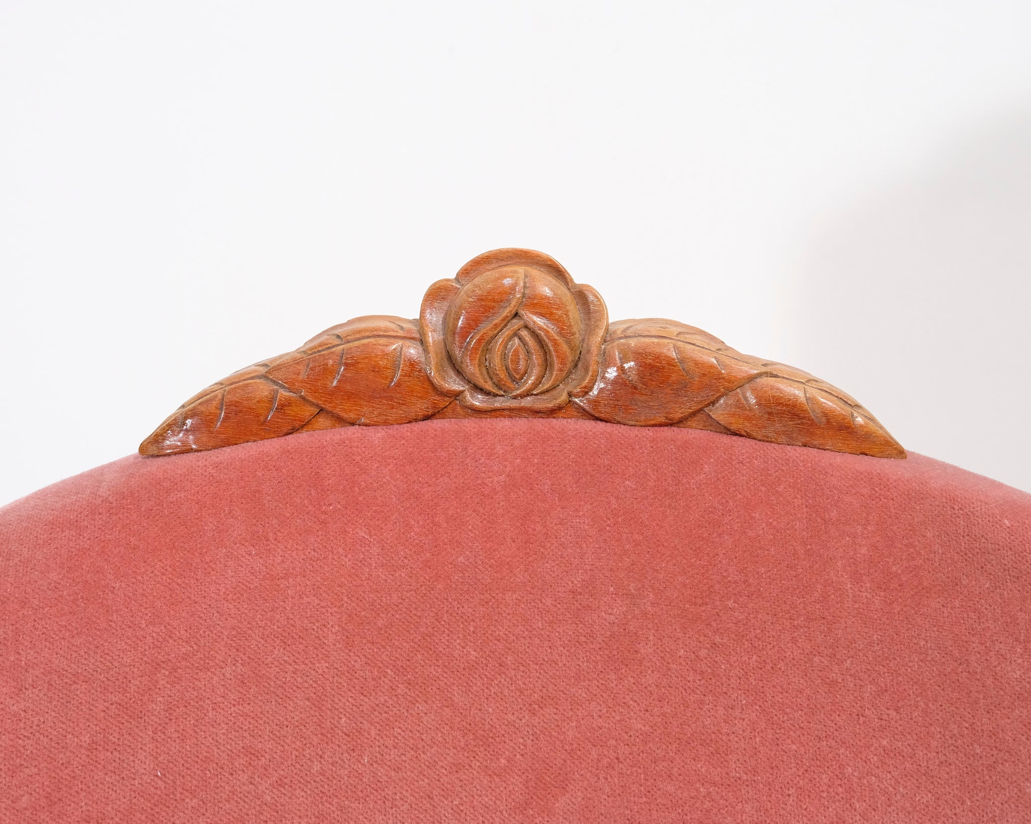 Marjapuuron värinen antiikkinen samettinojatuoli suloisilla ruusuornamenteilla.