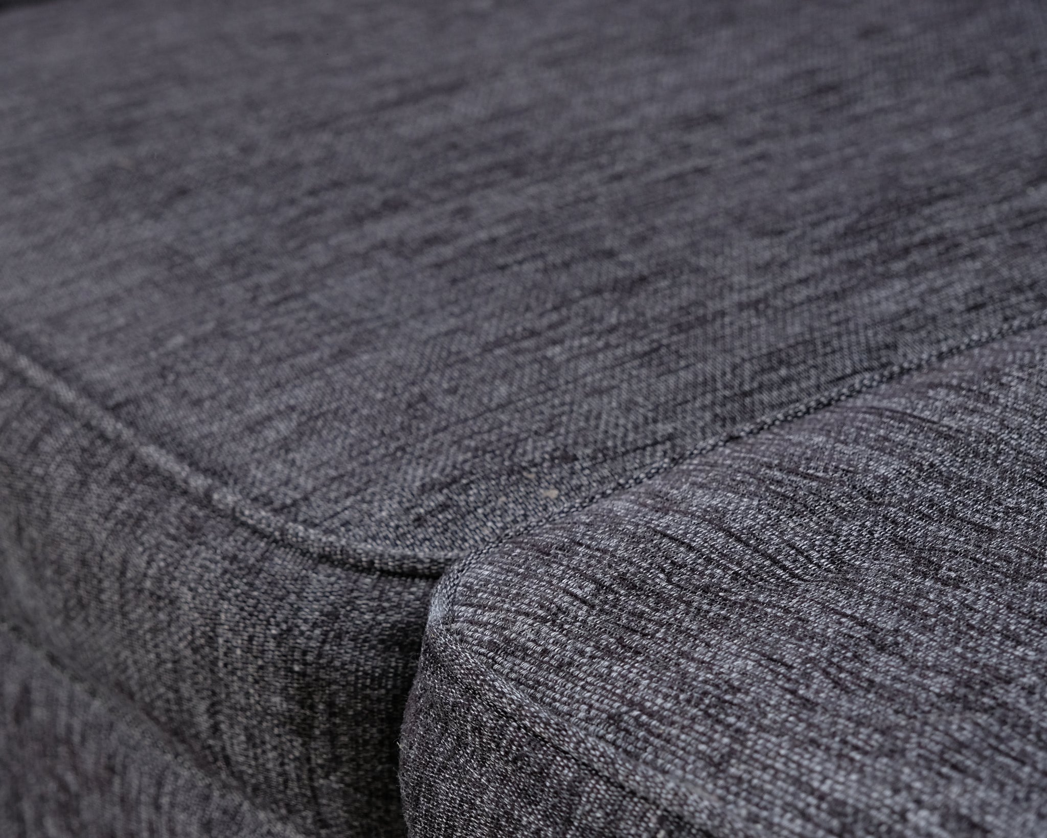 Harmaa divaanisohva kangasverhoilulla. Kukalliset heittotyynyt tuovat rentoutta sohvan ilmeeseen.