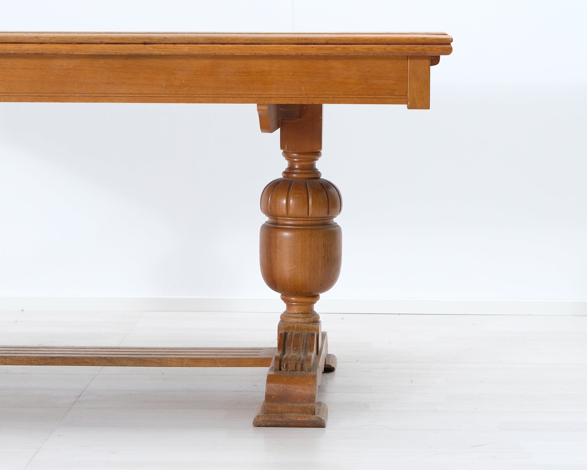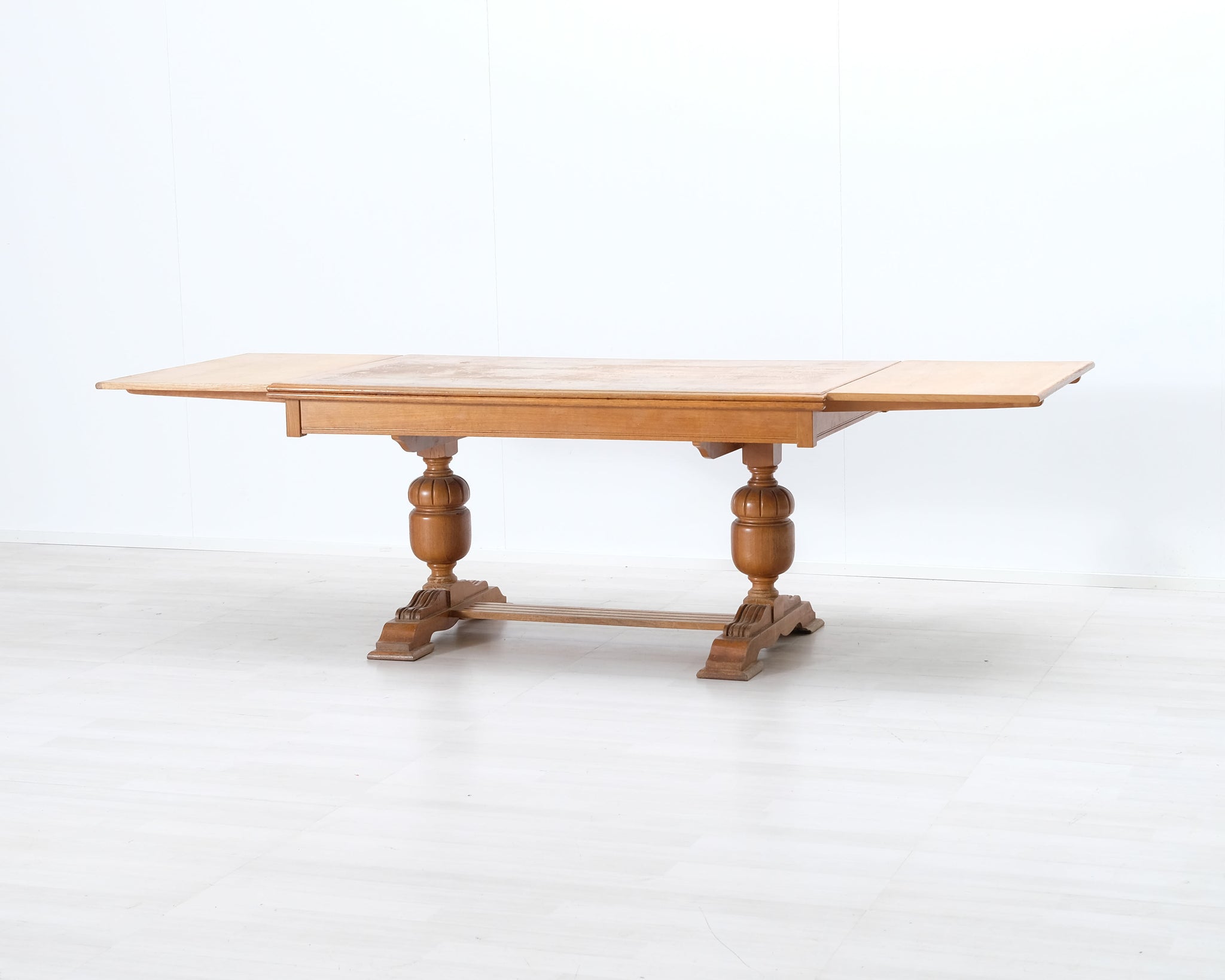 Antiikkinen tammesta valmistettu pöytä. Koristeelliset jalat. Pöytään saa lisää pituutta jatkopaloilla.
