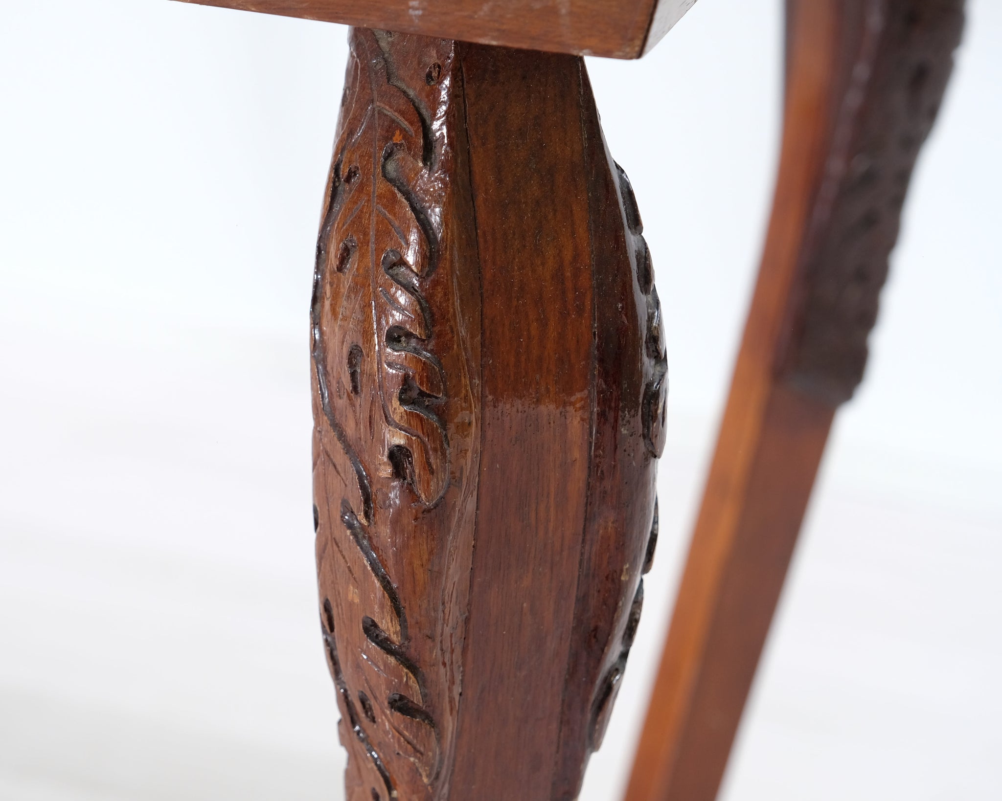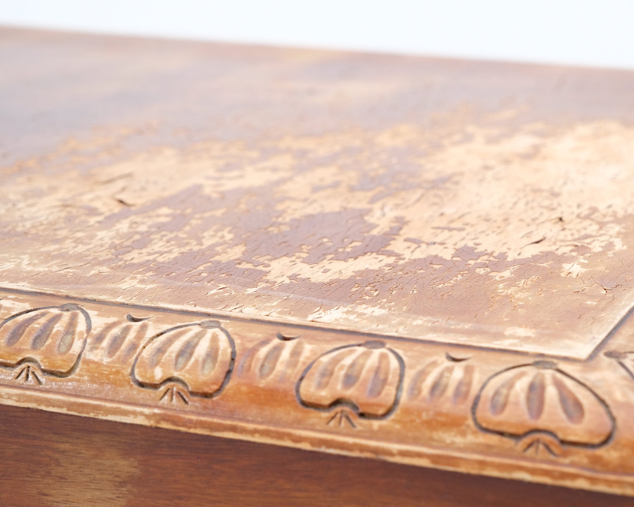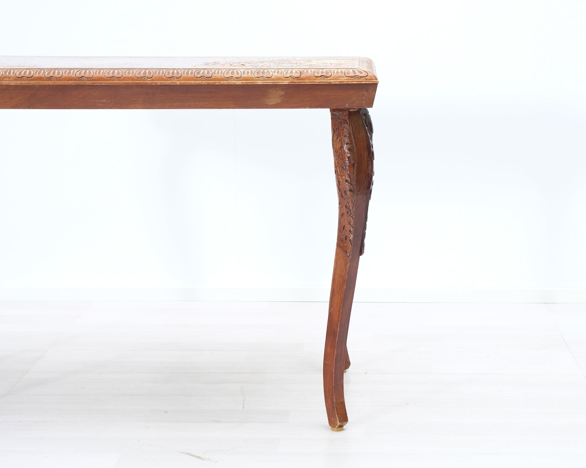 Antiikkinen sivupöytä. Koristeita pöydän jaloissa ja pöytälevyssä.
