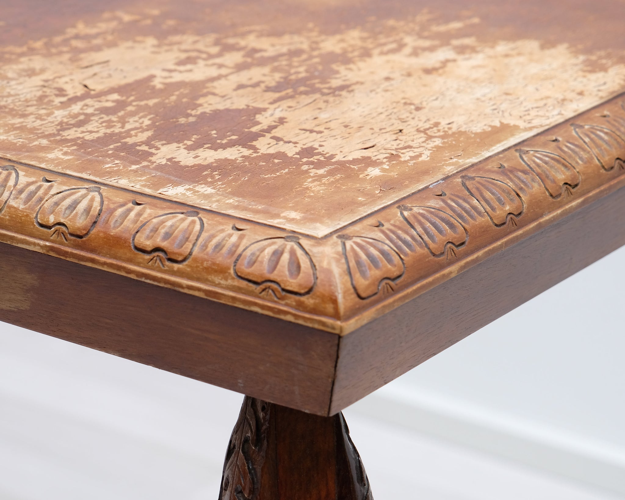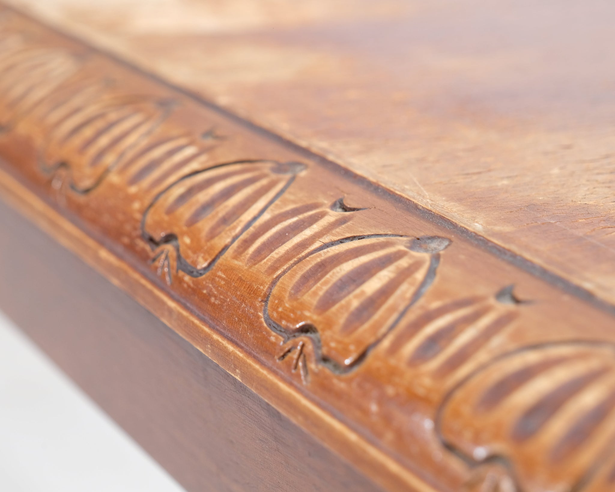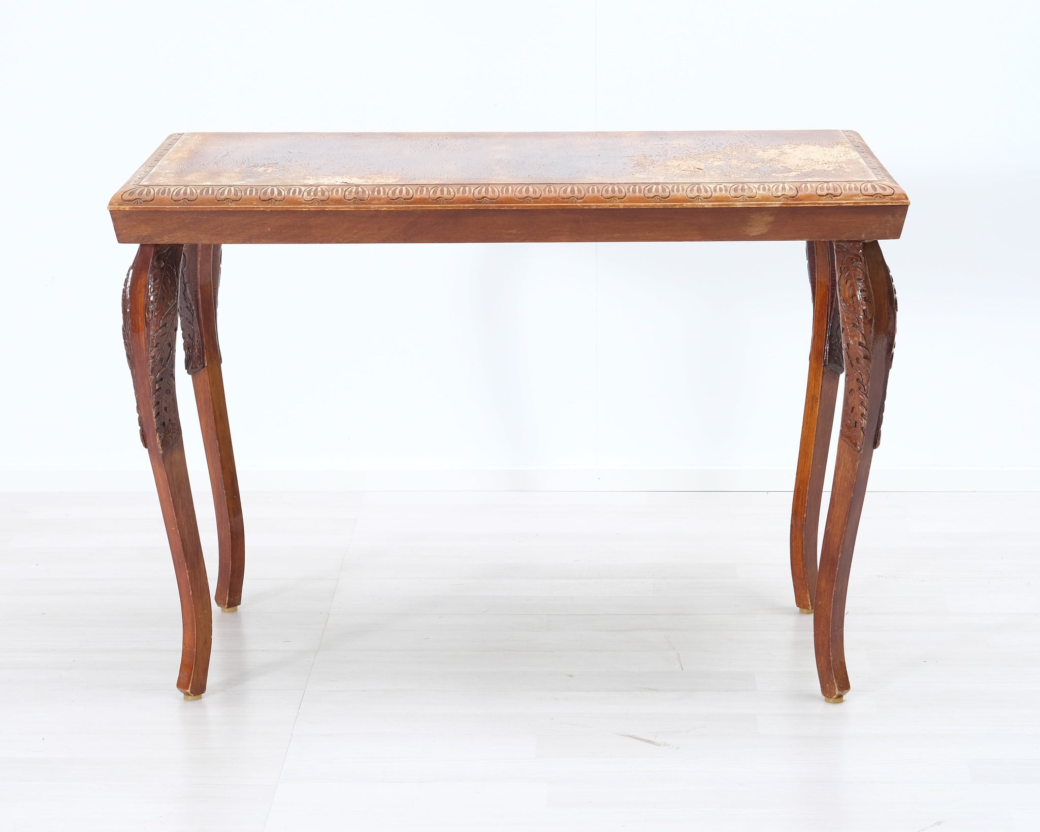 Antiikkinen sivupöytä. Koristeita pöydän jaloissa ja pöytälevyssä.