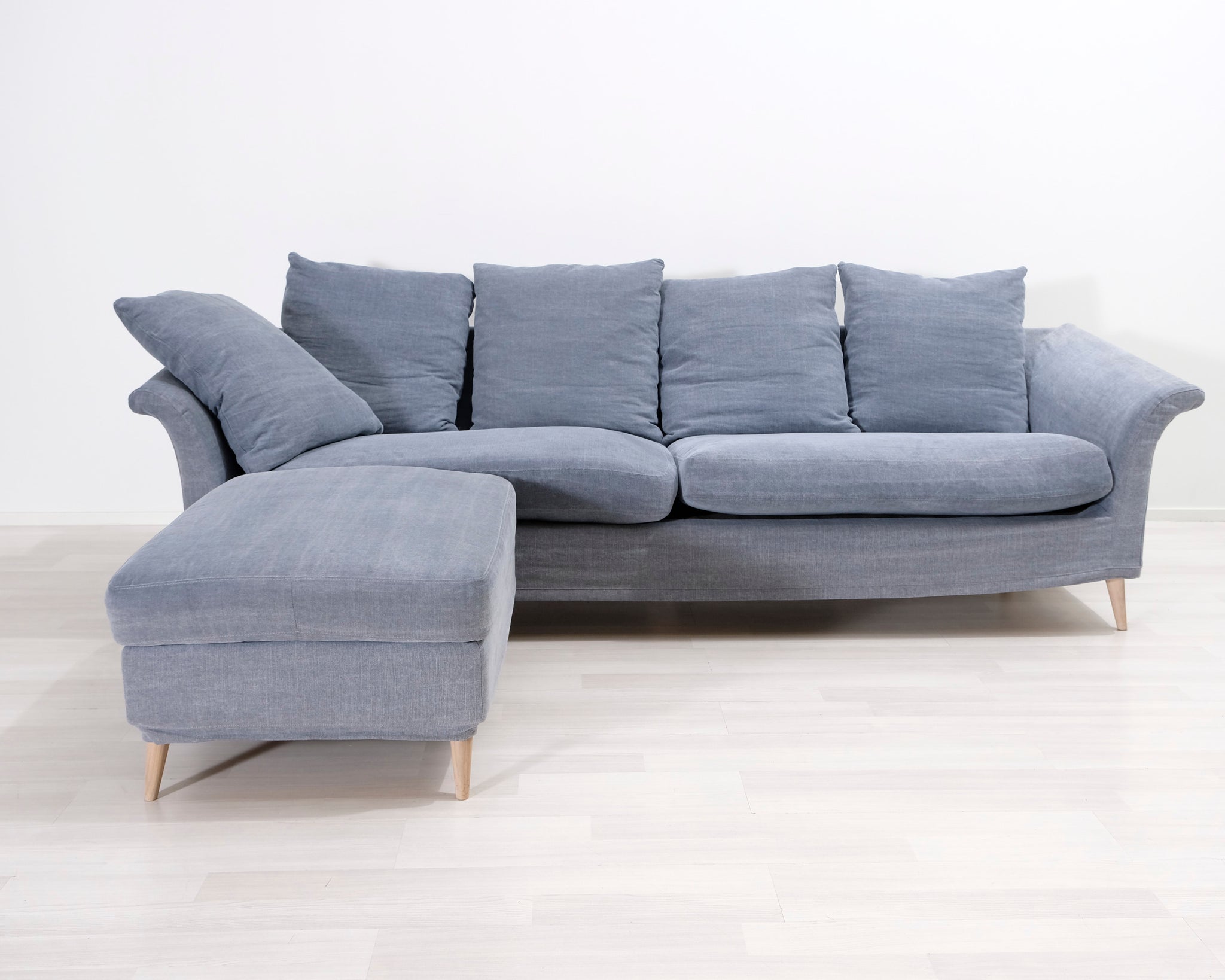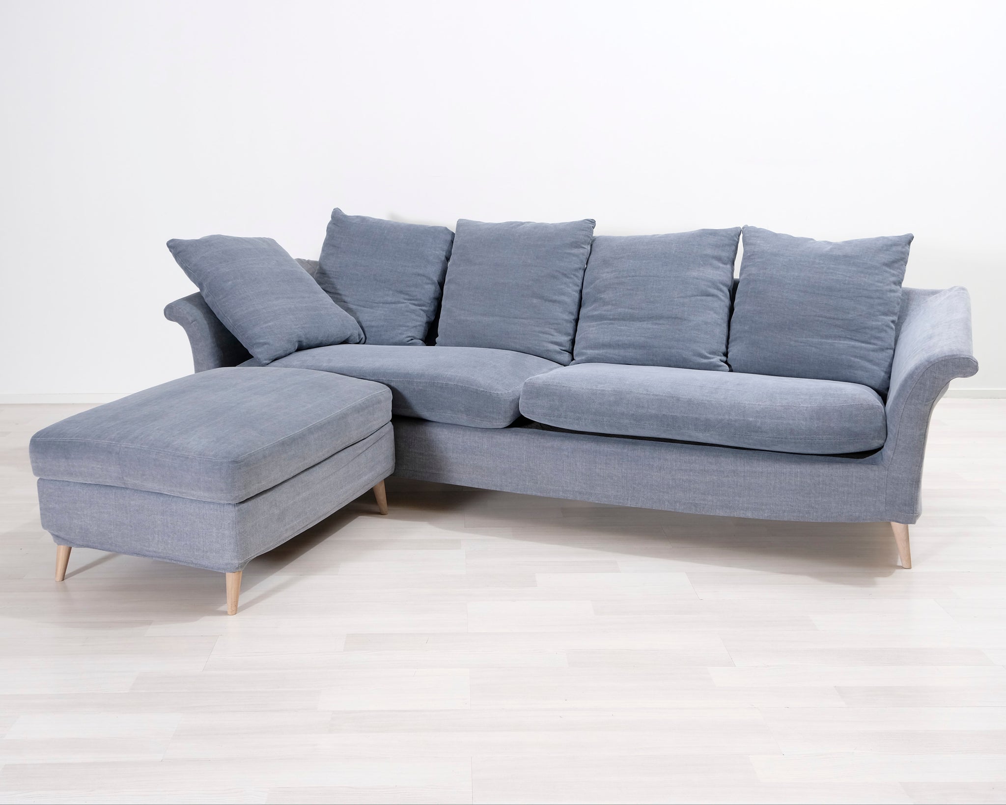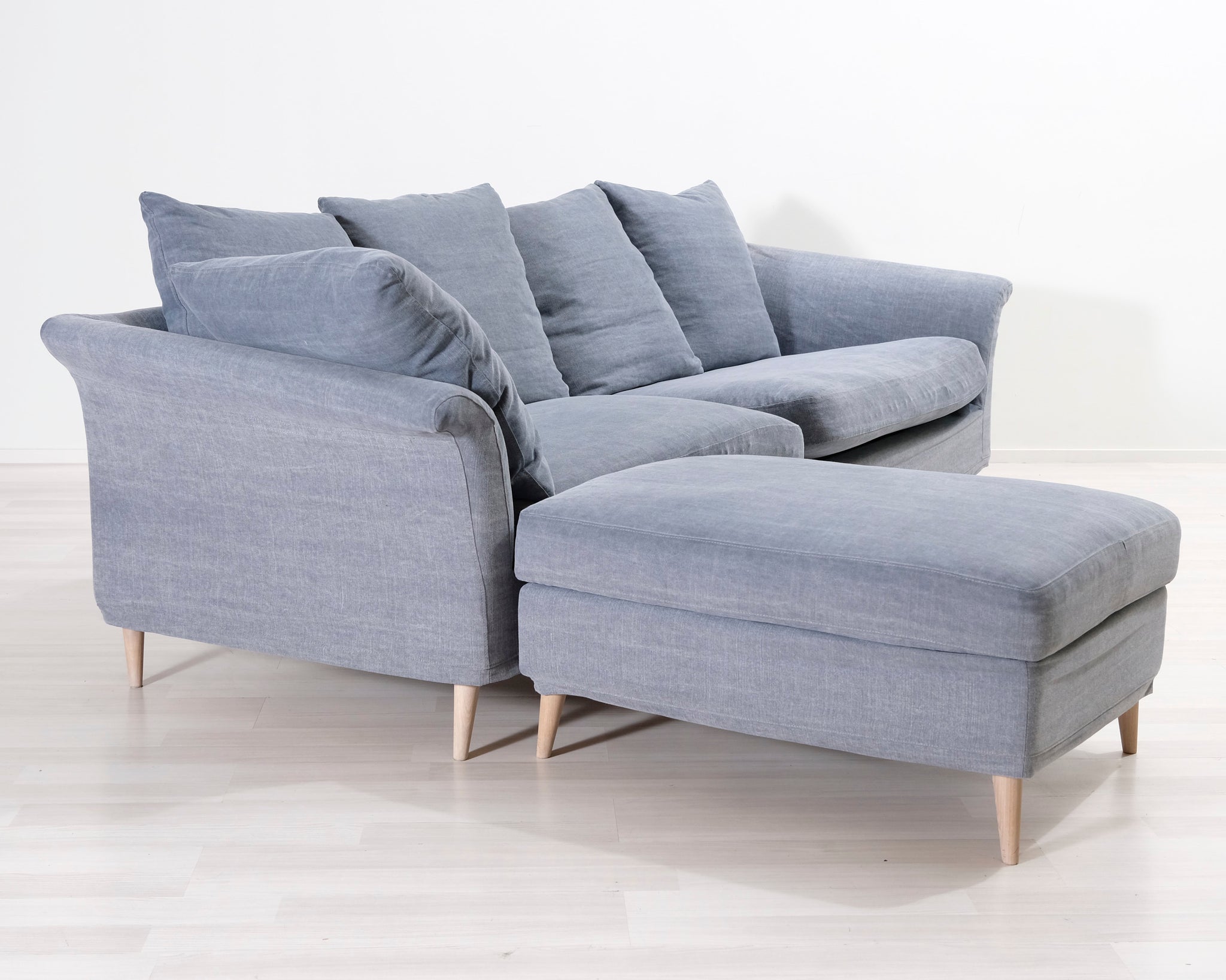 Kauniin siniharmaan sävyinen kangassohva ja yhteensopiva rahi. Irtotyynyt antavat sohvalle rennon olemuksen. Irrotettavat päälliset.