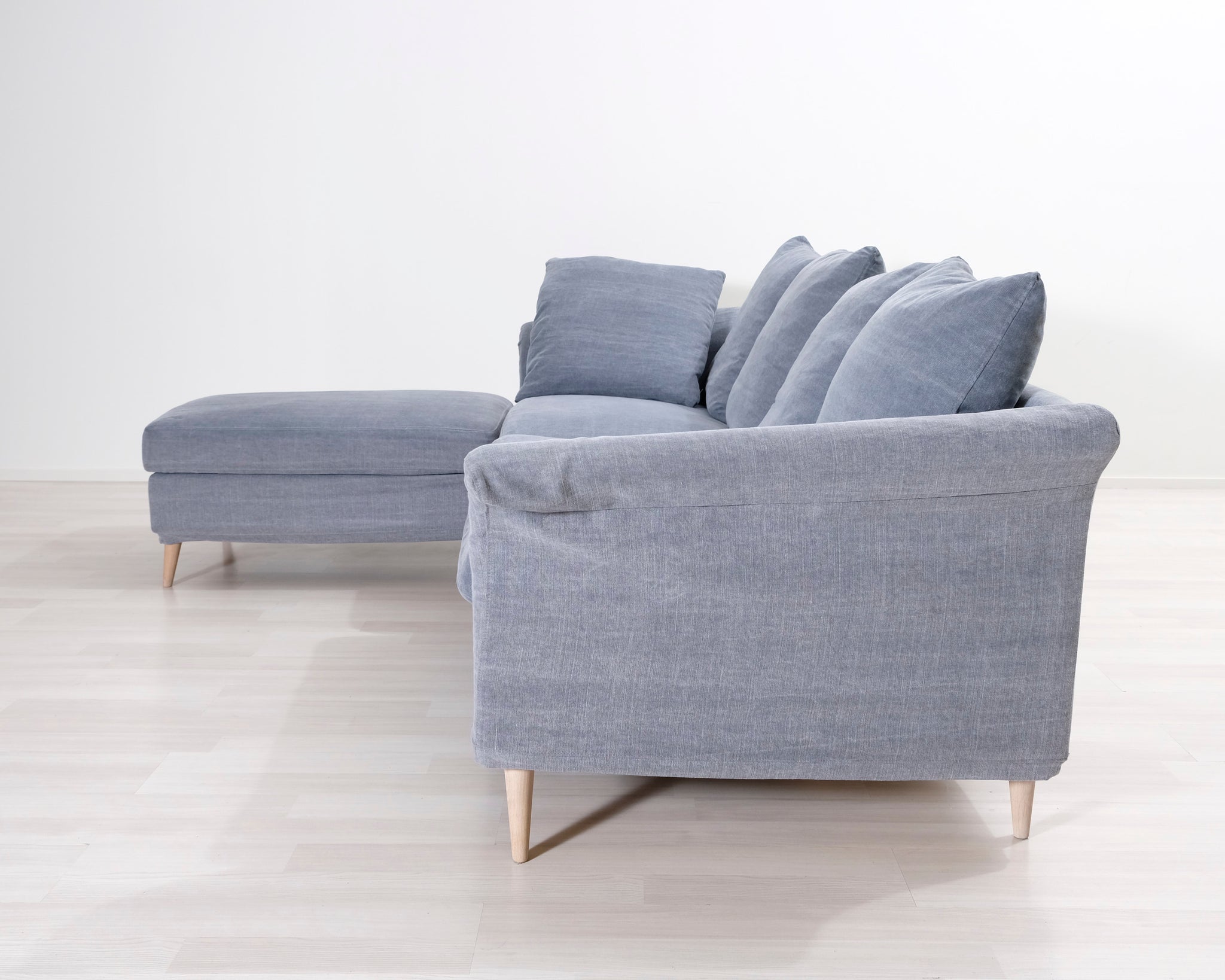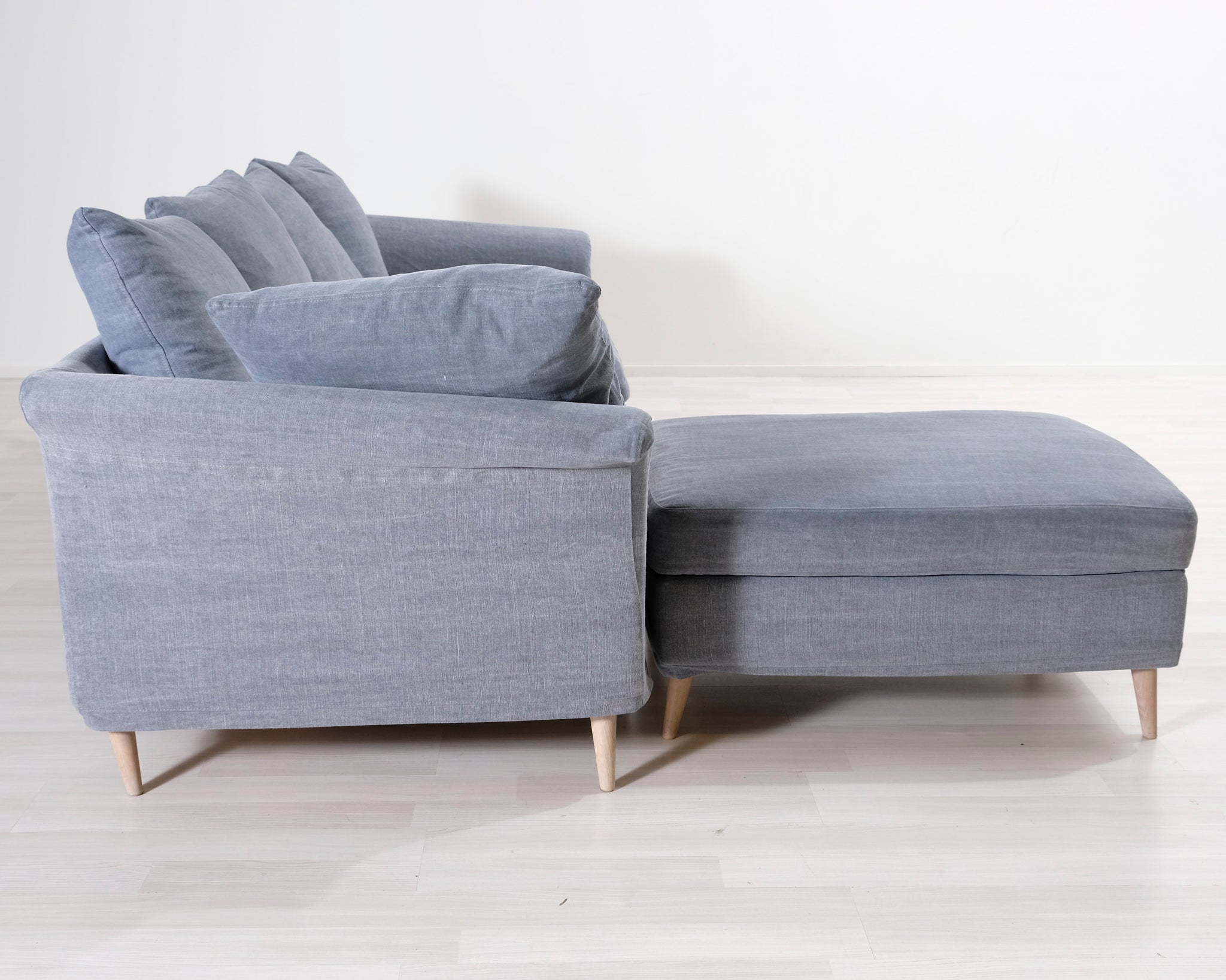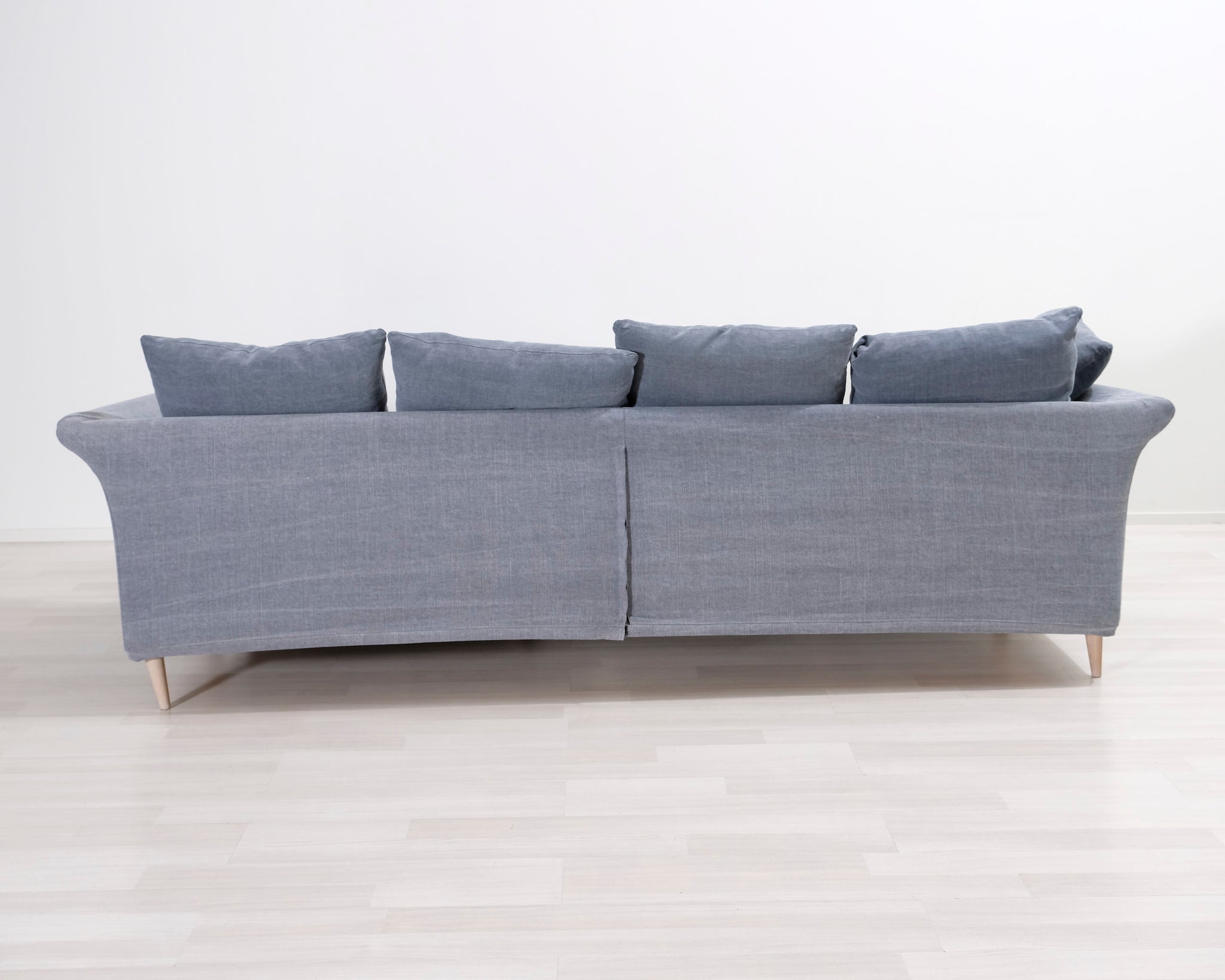Kauniin siniharmaan sävyinen kangassohva ja yhteensopiva rahi. Irtotyynyt antavat sohvalle rennon olemuksen. Irrotettavat päälliset.