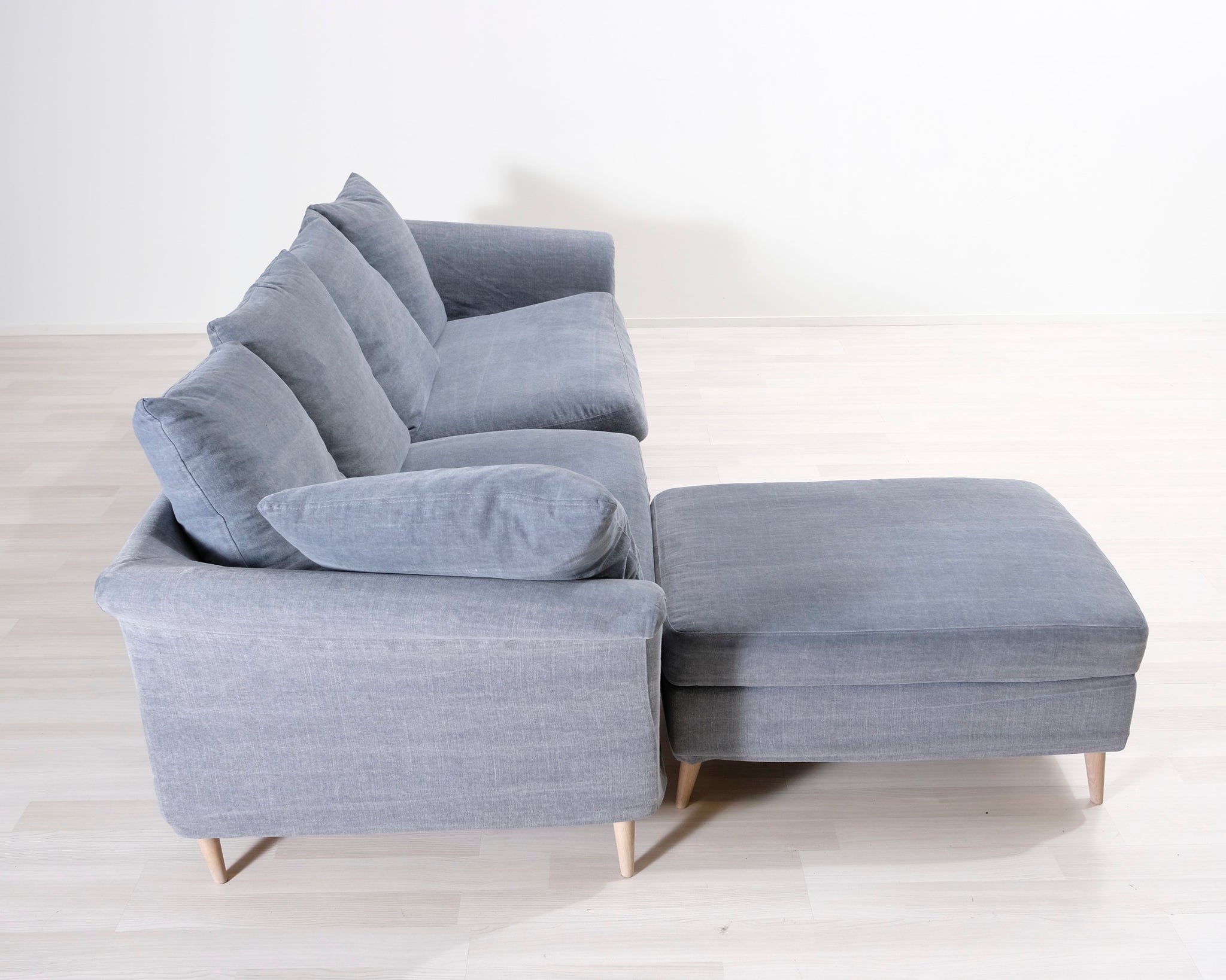 3-istuttava kangassohva ja jalkarahi siniharmaa