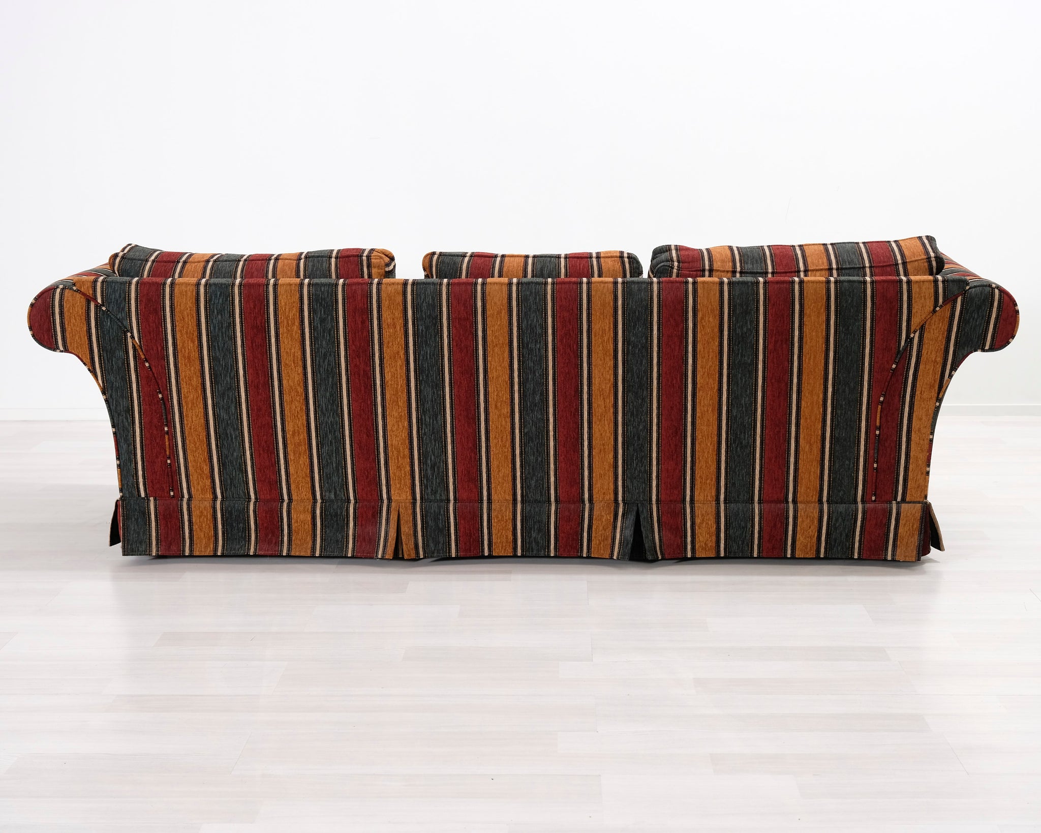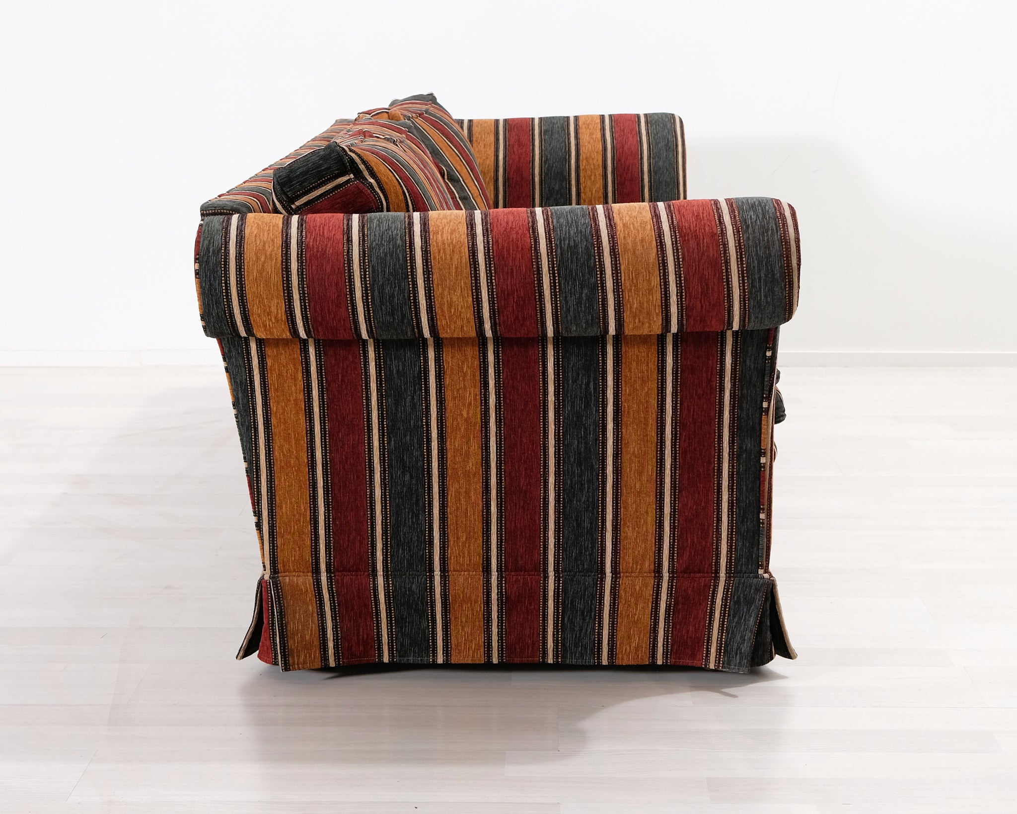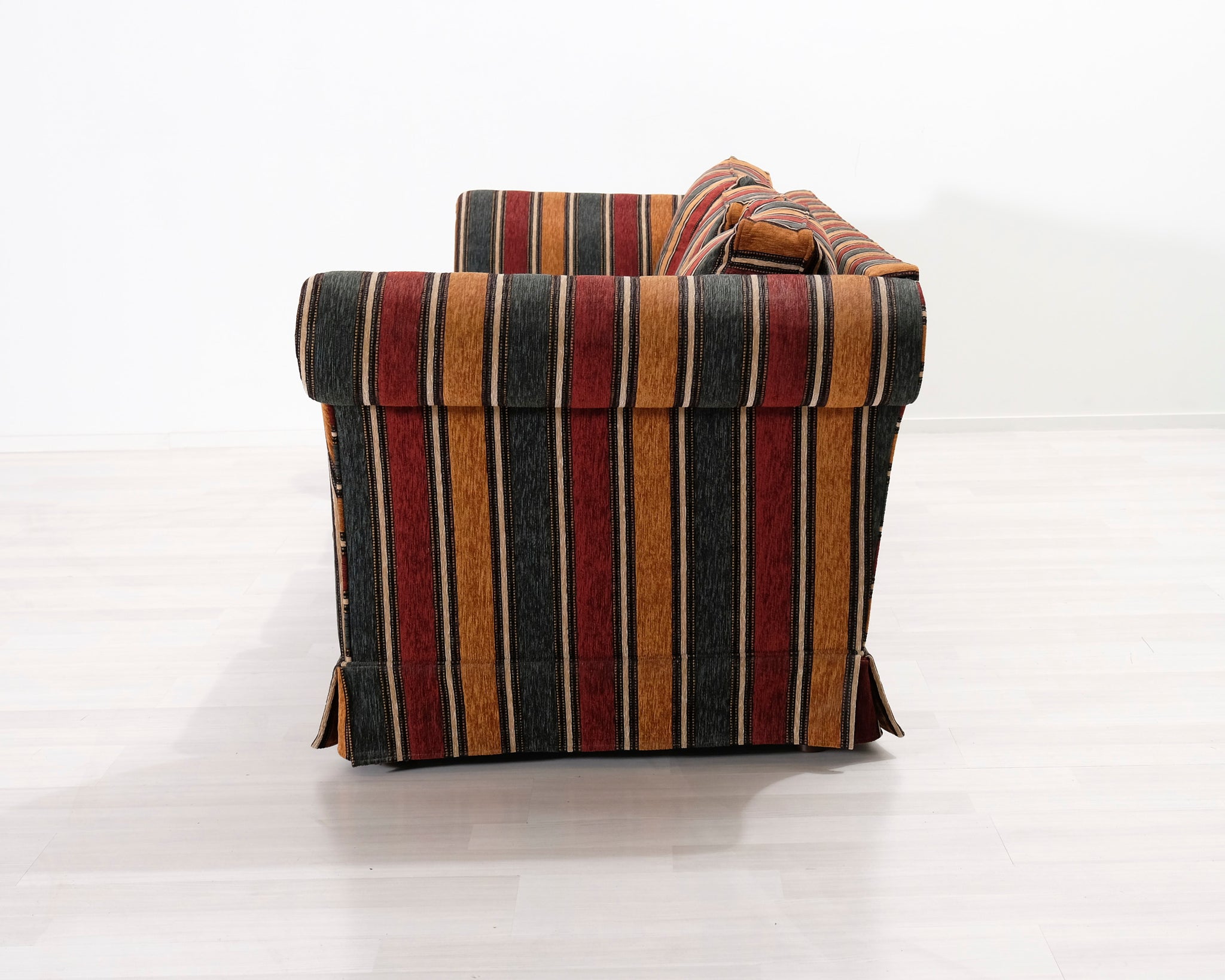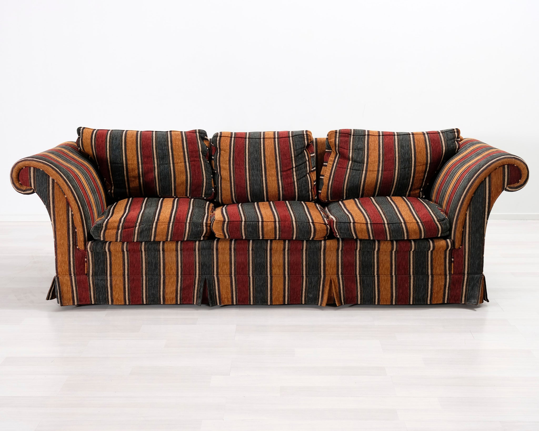Kolmen istuttava kangassohva. Raidallinen verhoilu ja pöyristetyt käsinojat antavat sohvalle uniikin ulkomuodon.