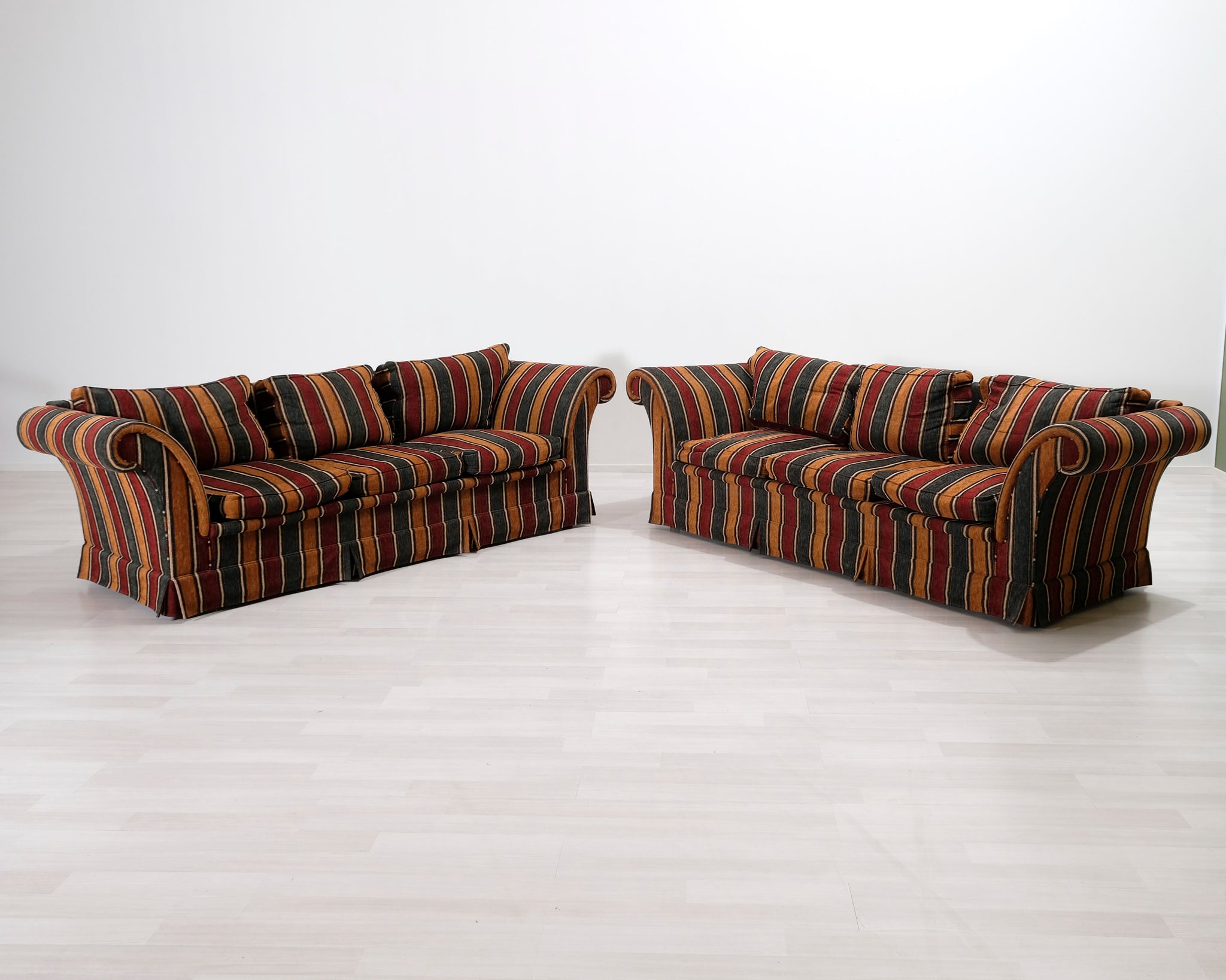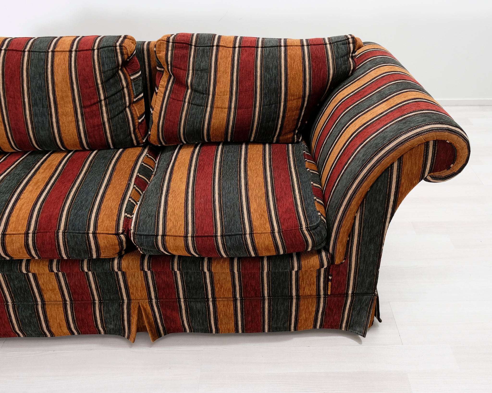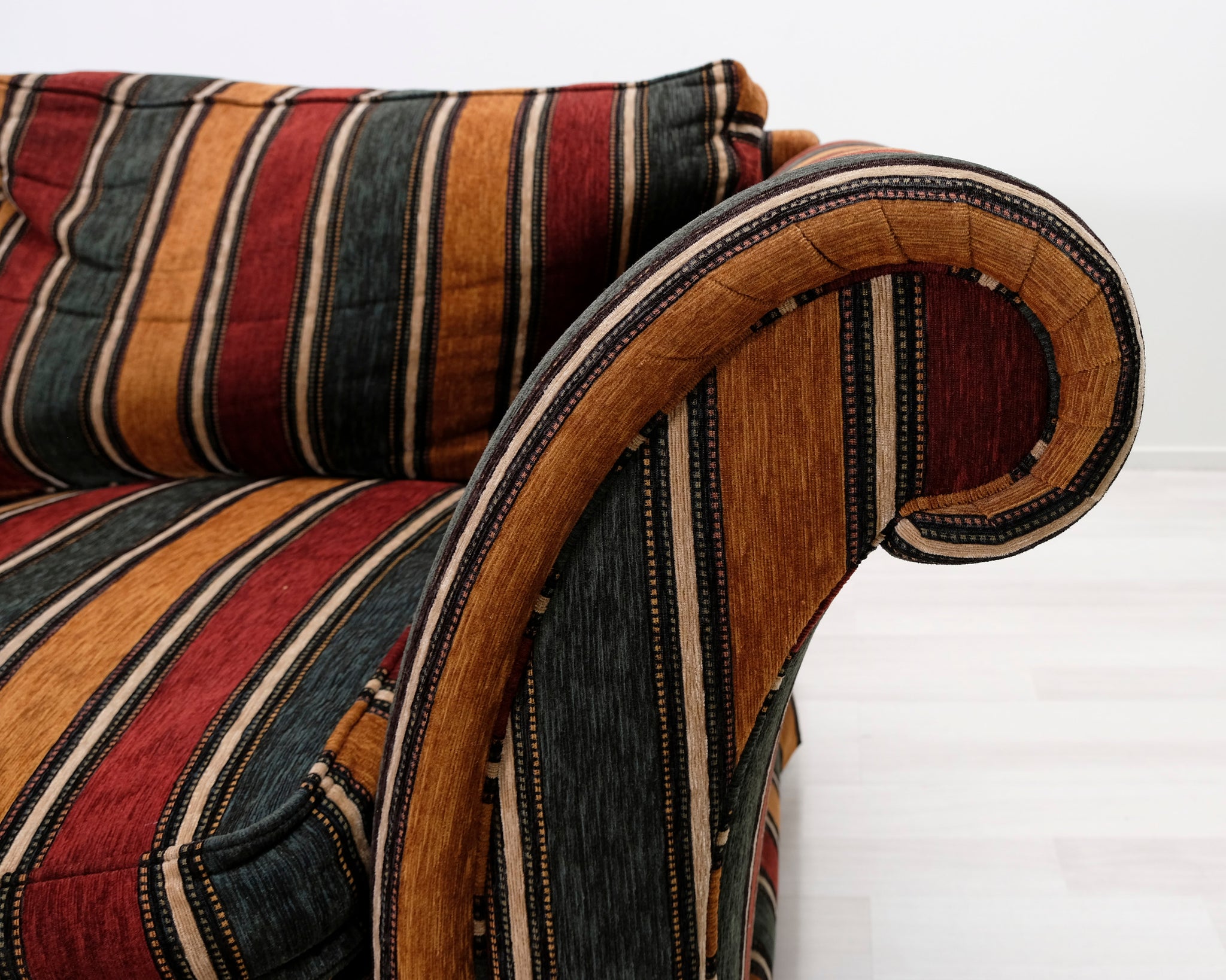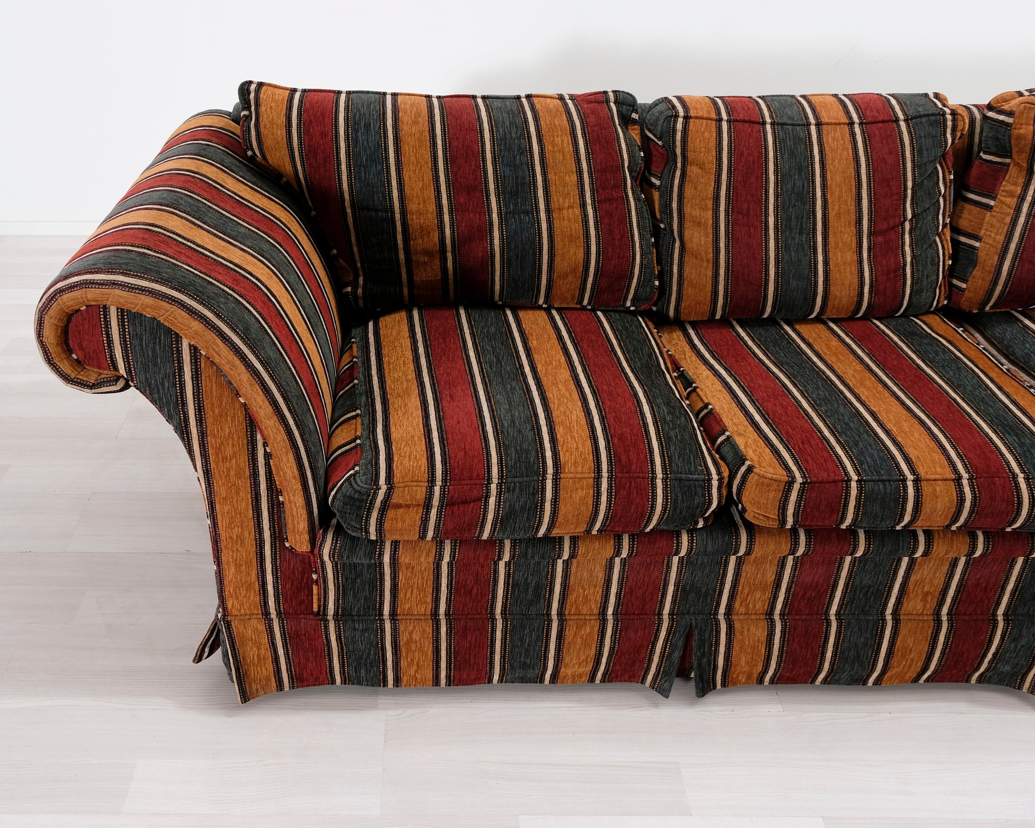 Kolmen istuttava kangassohva. Raidallinen verhoilu ja pöyristetyt käsinojat antavat sohvalle uniikin ulkomuodon.