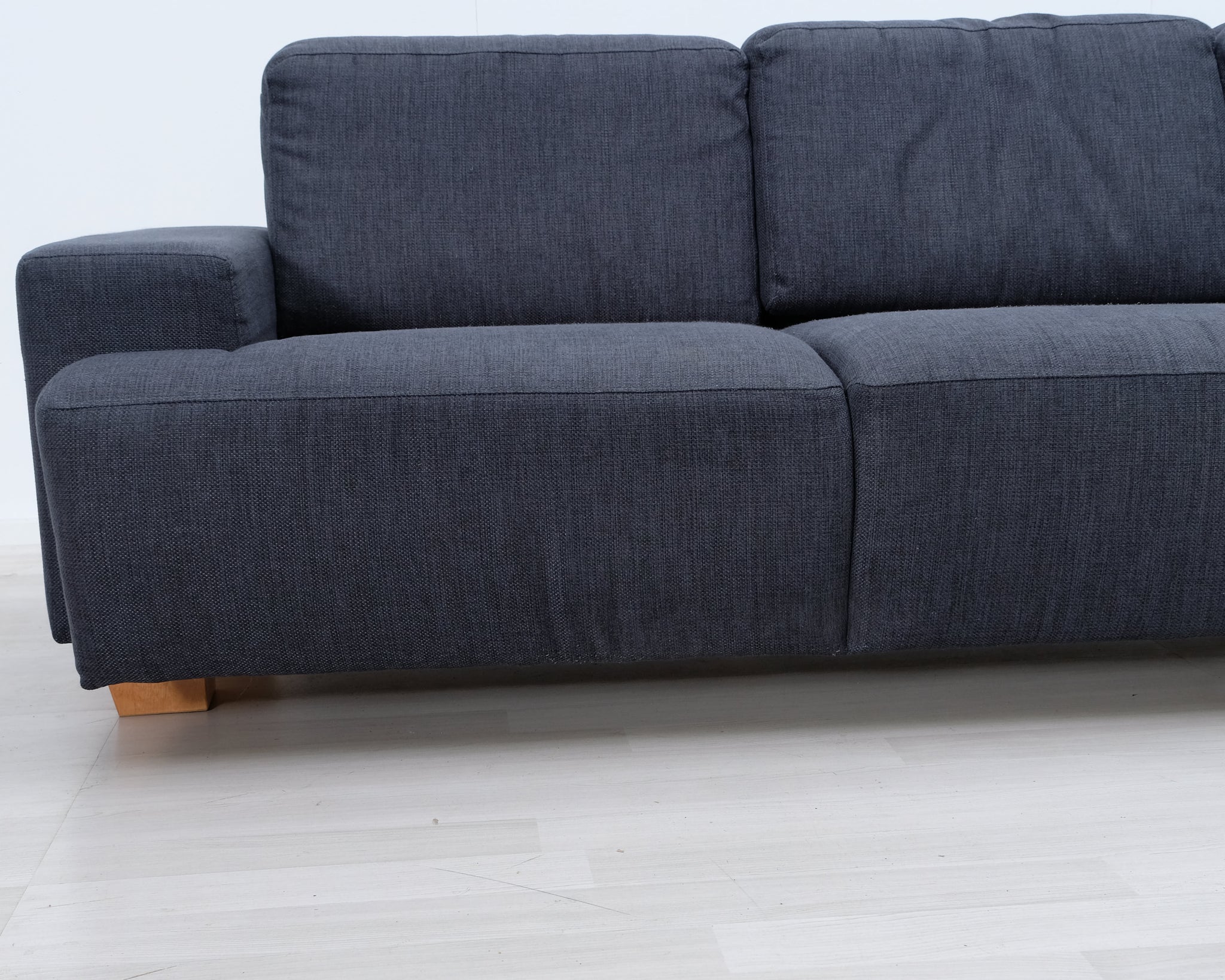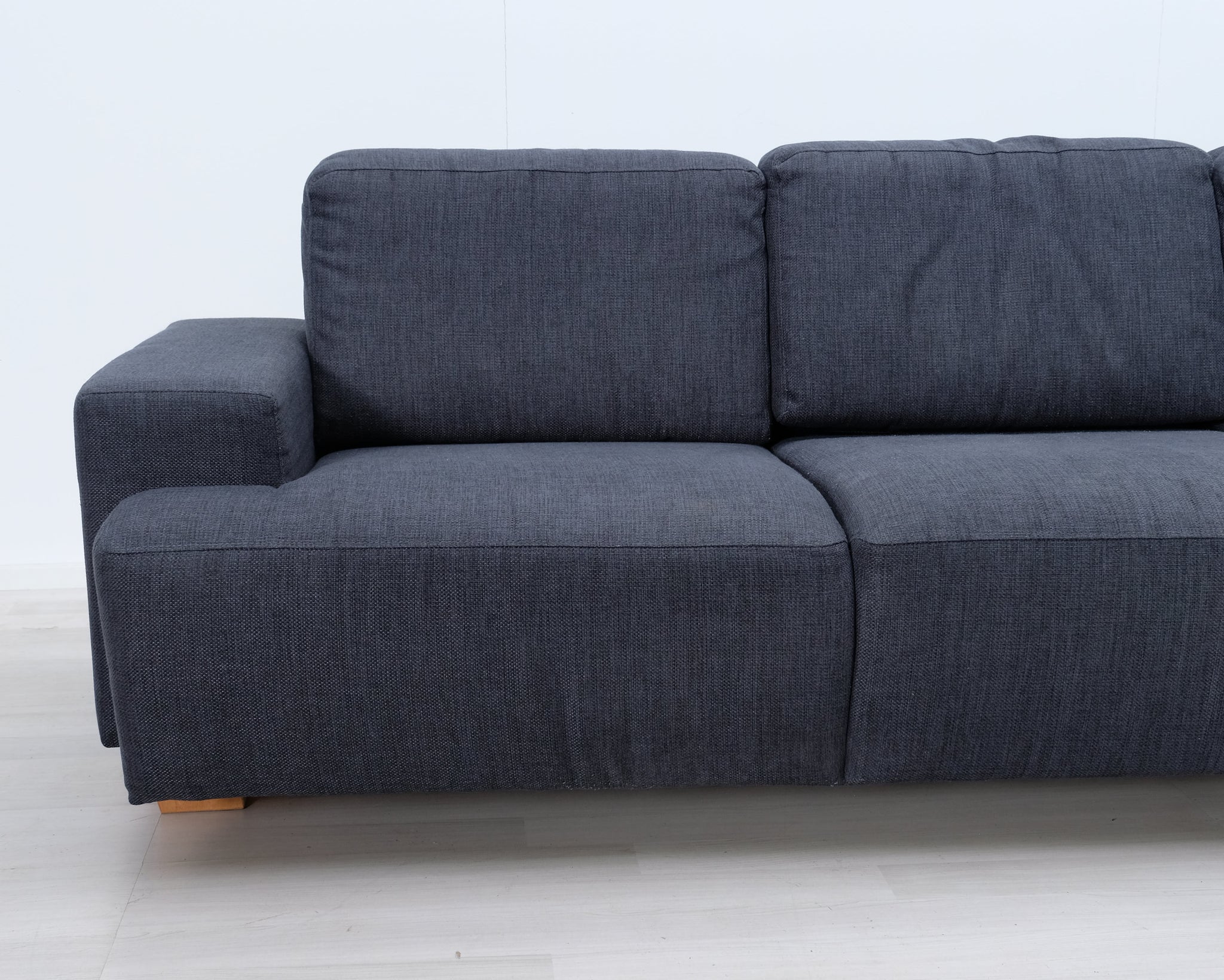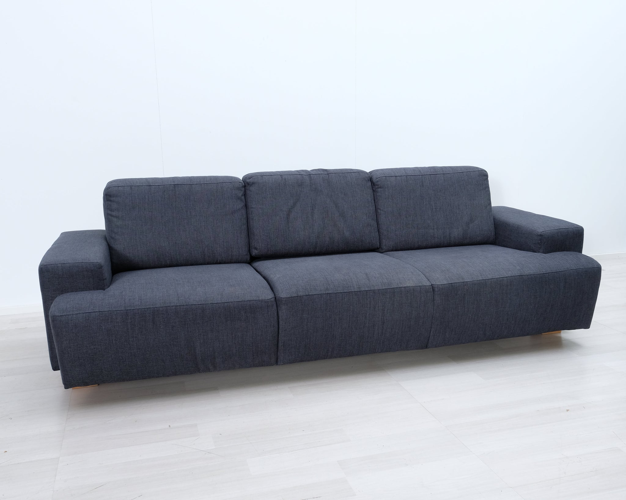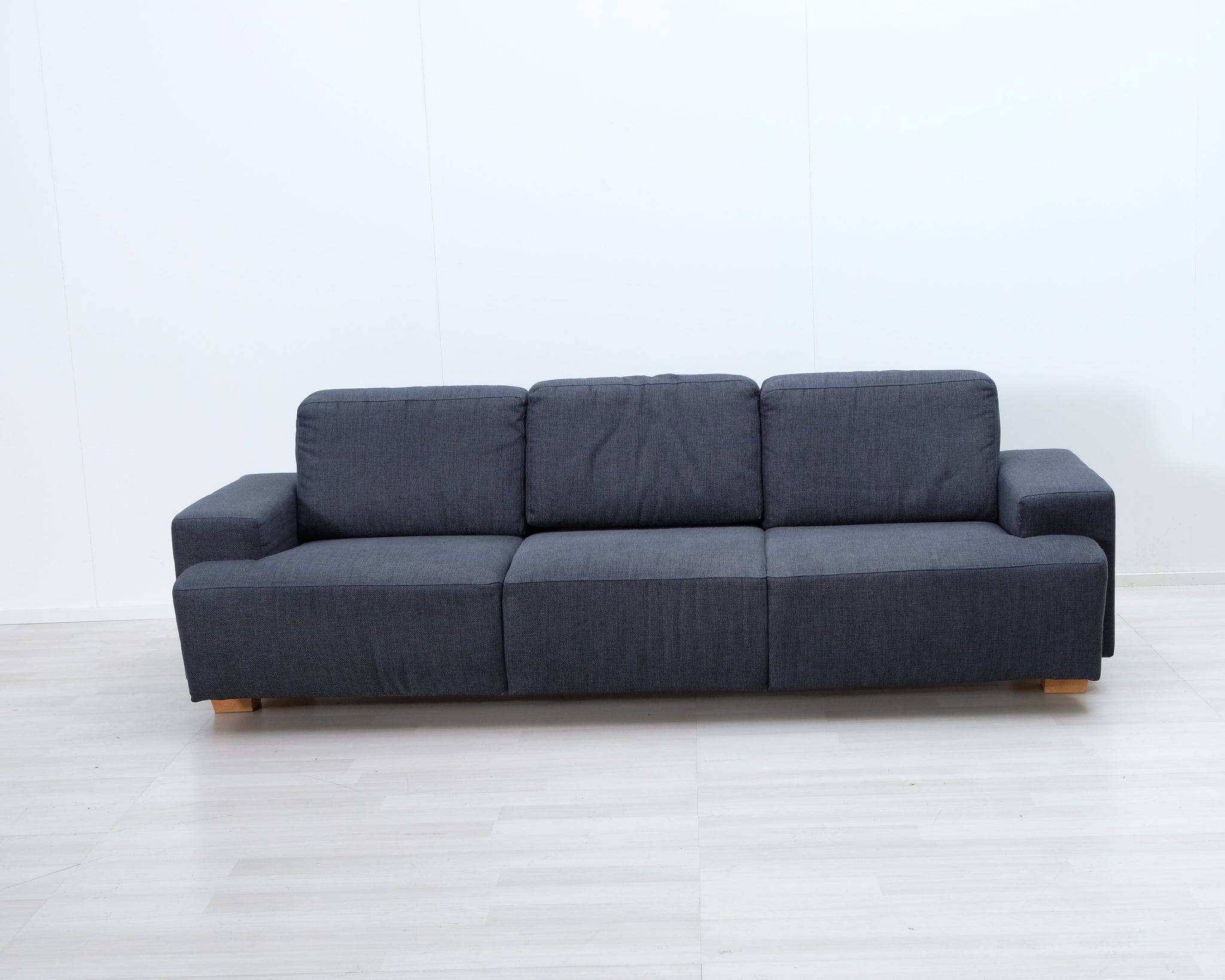 Kolmen istuttava moderni sohva. Tummansininen kangasverhoilu.