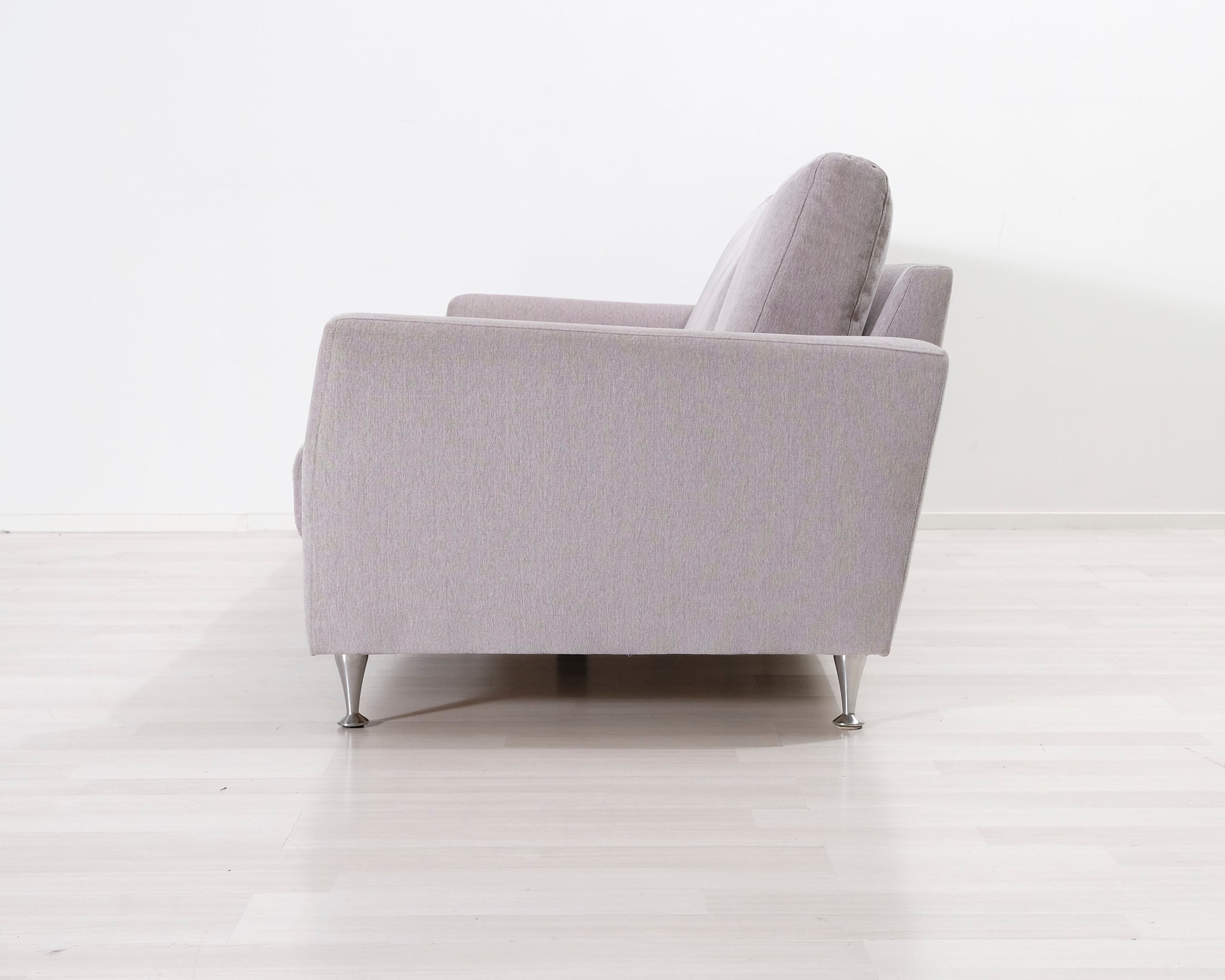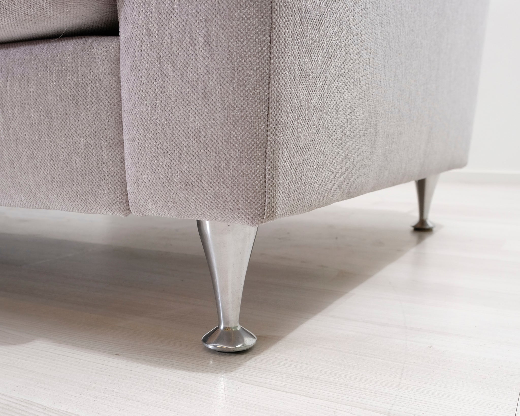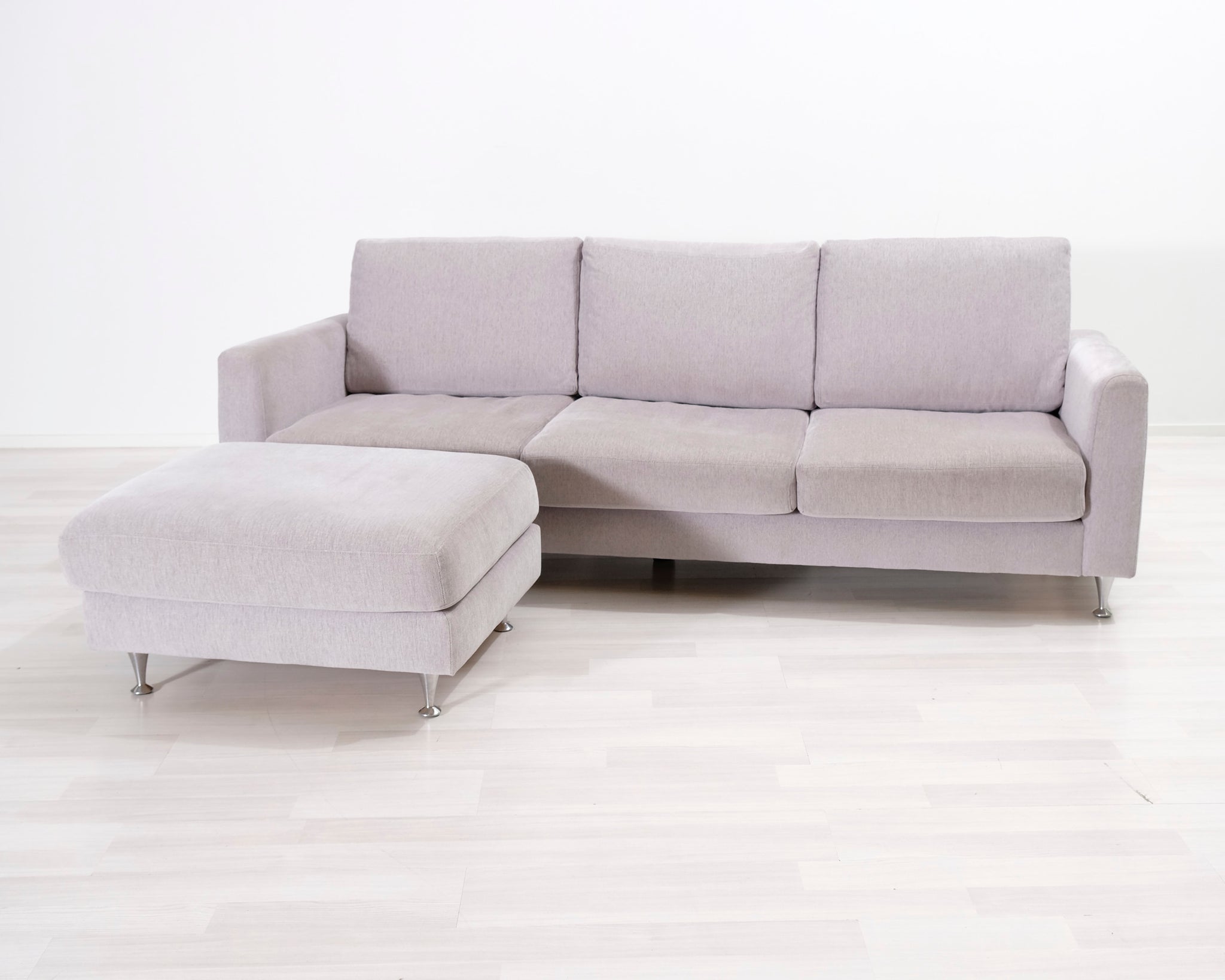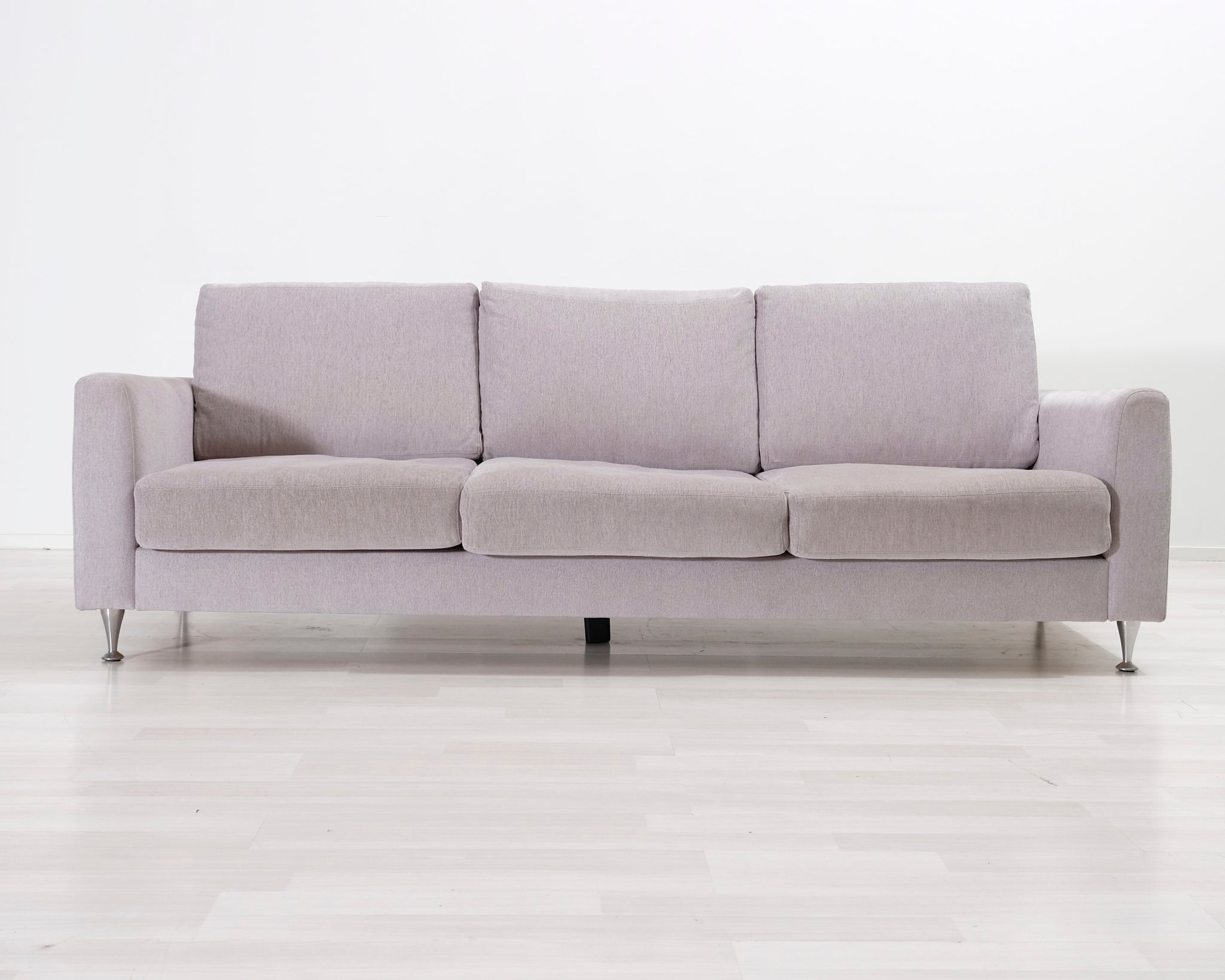 Kolmen istuttava kangassohva. Vaaleanharmaa verhoilu.