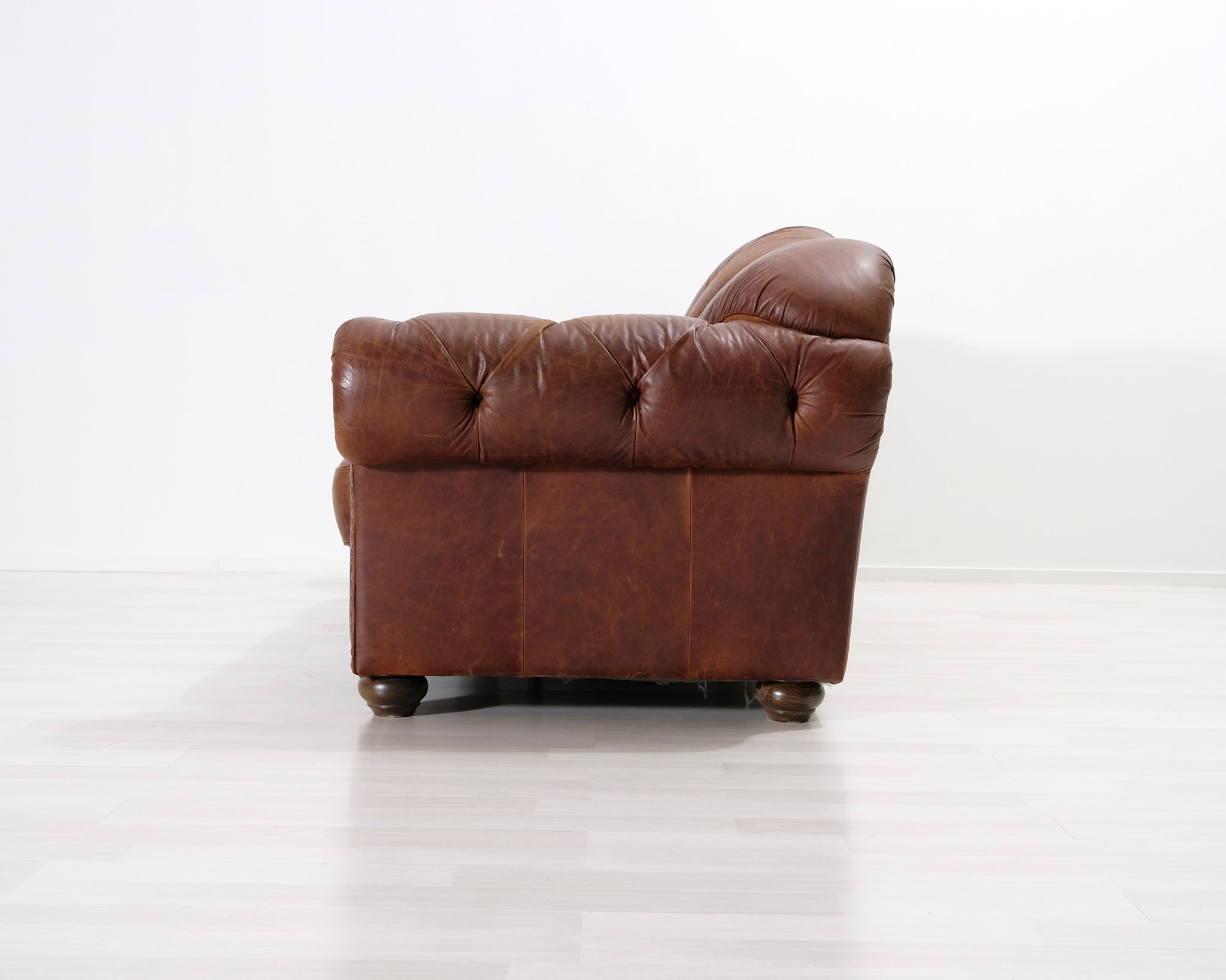 Kolmen istuttava chesterfield-tyylinen nahkasohva. Ruskea, hieman patinoitunut verhoilut. Yksityiskohtina tikattu selkämys, koristeniitit ja pyöristetyt käsinojat.