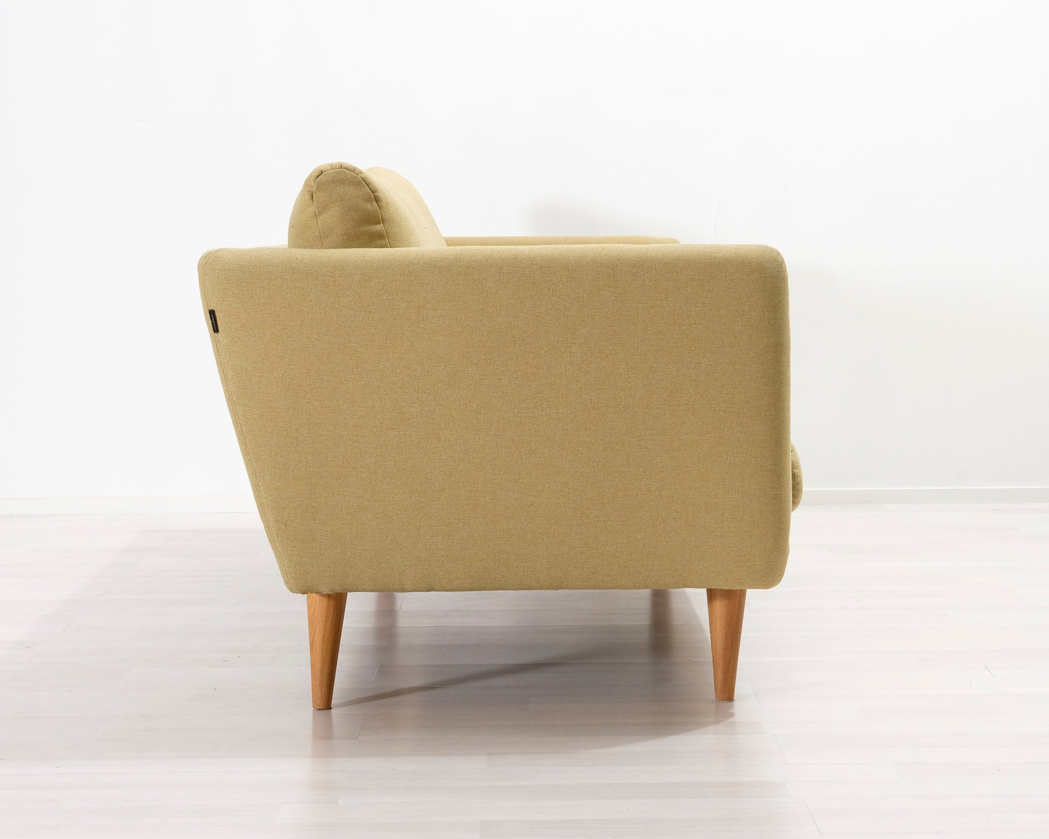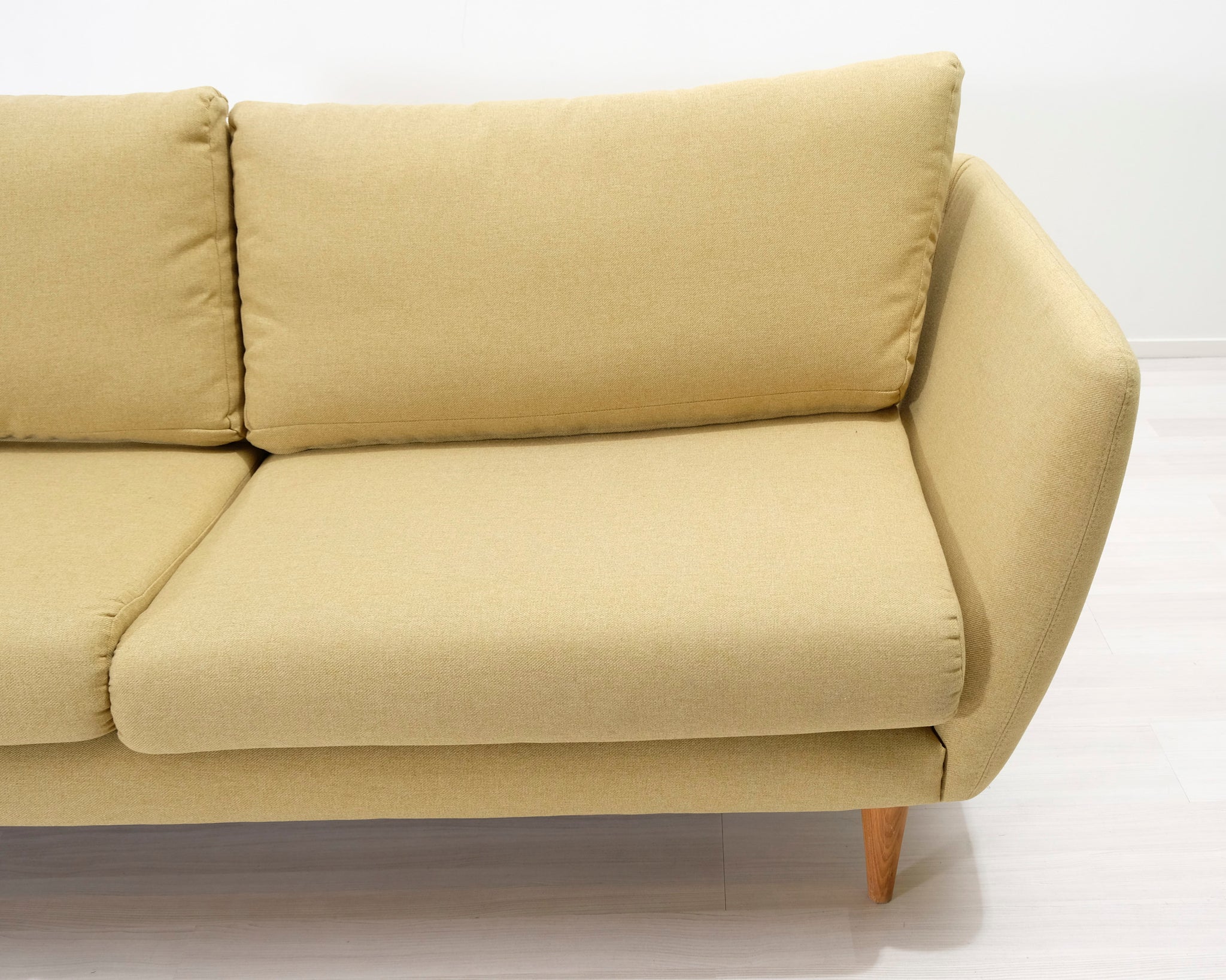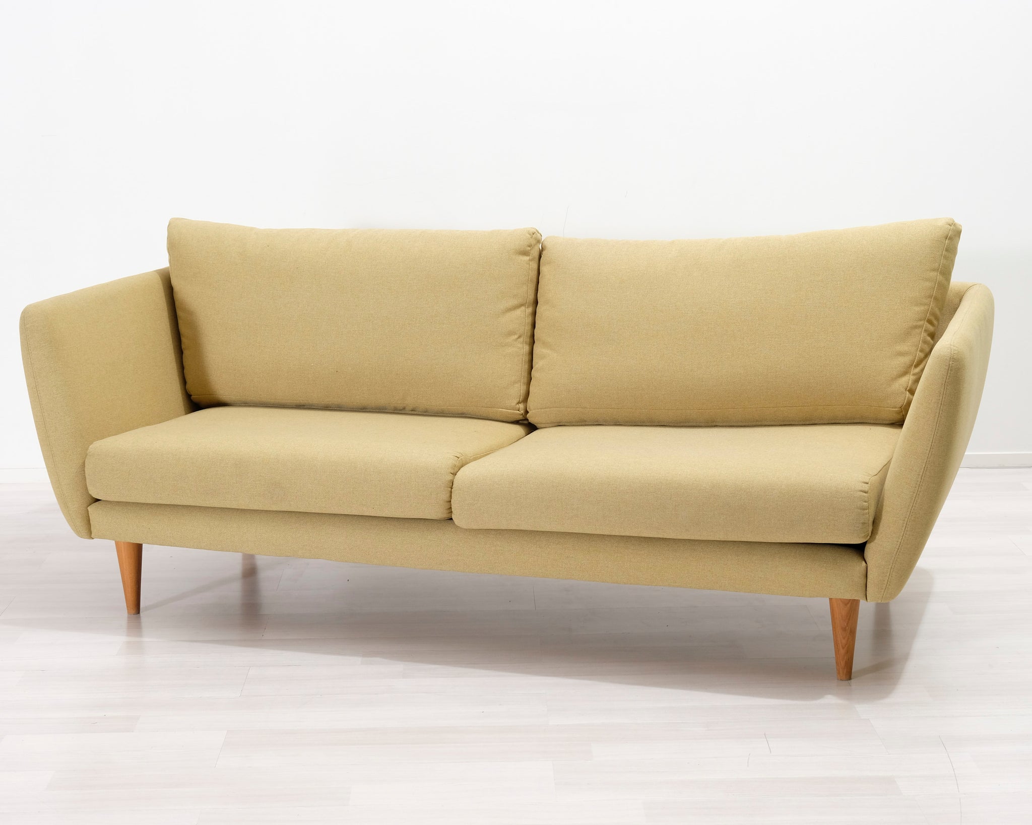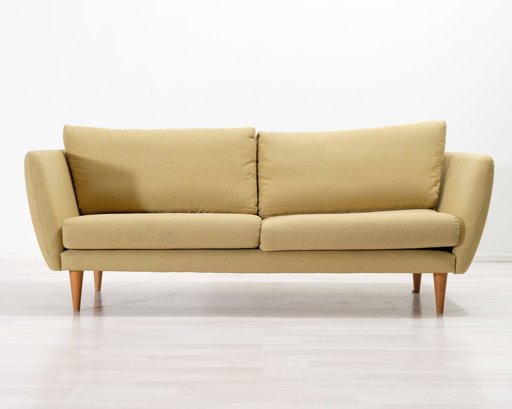 Kolmen istuttava kangassohva. Vihreä verhoilu ja tammijalat. Sohvassa on hieman 60-lukumainen muoto.