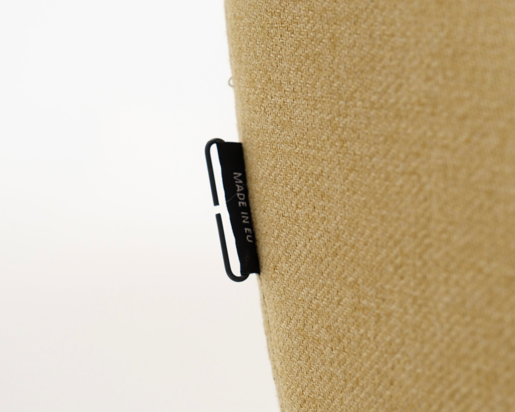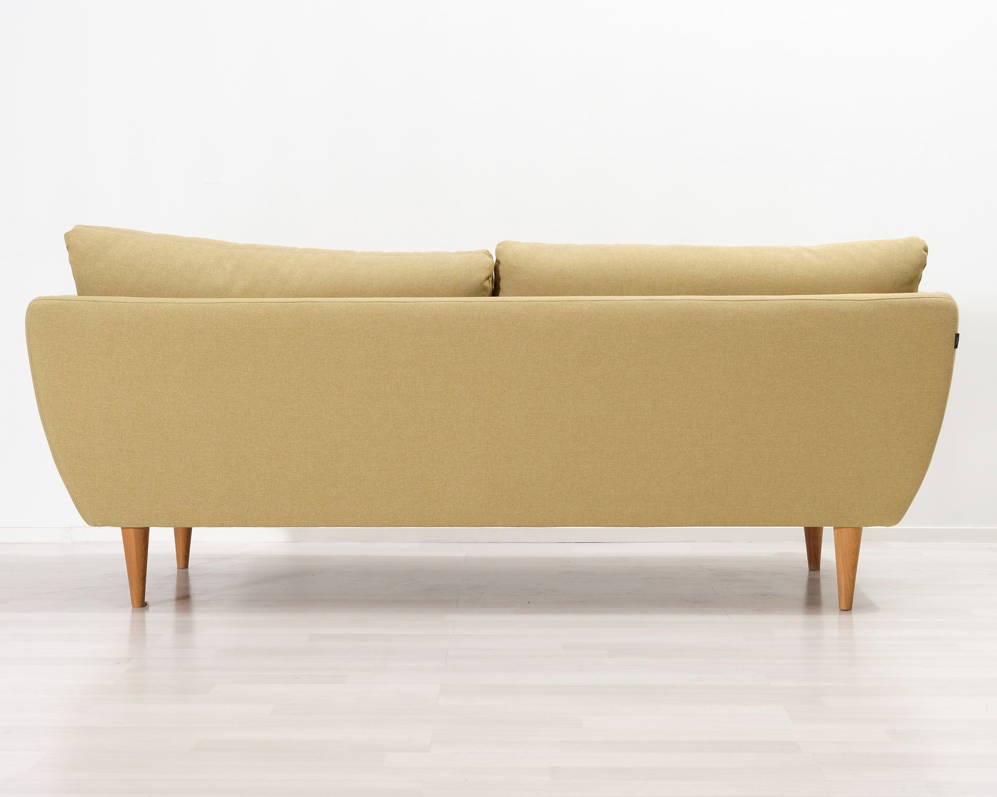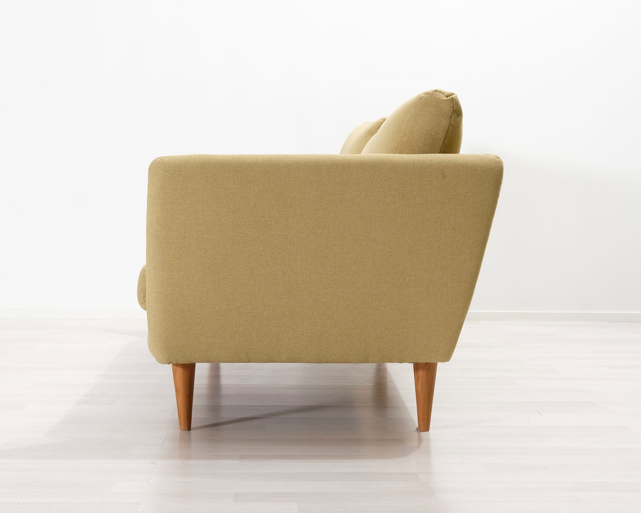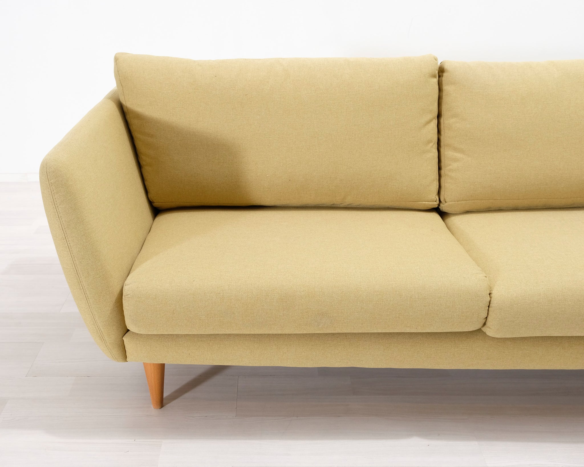 Kolmen istuttava kangassohva. Vihreä verhoilu ja tammijalat. Sohvassa on hieman 60-lukumainen muoto.