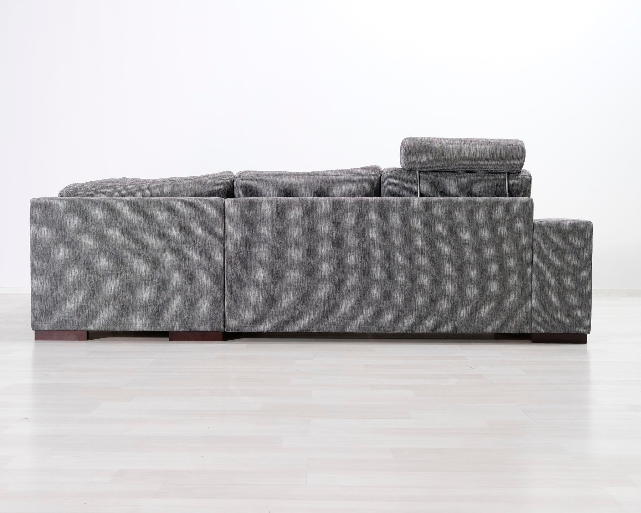 Neljän istuttava avokulmasohva. Harmaa kangasverhoilu ja niskatuki.