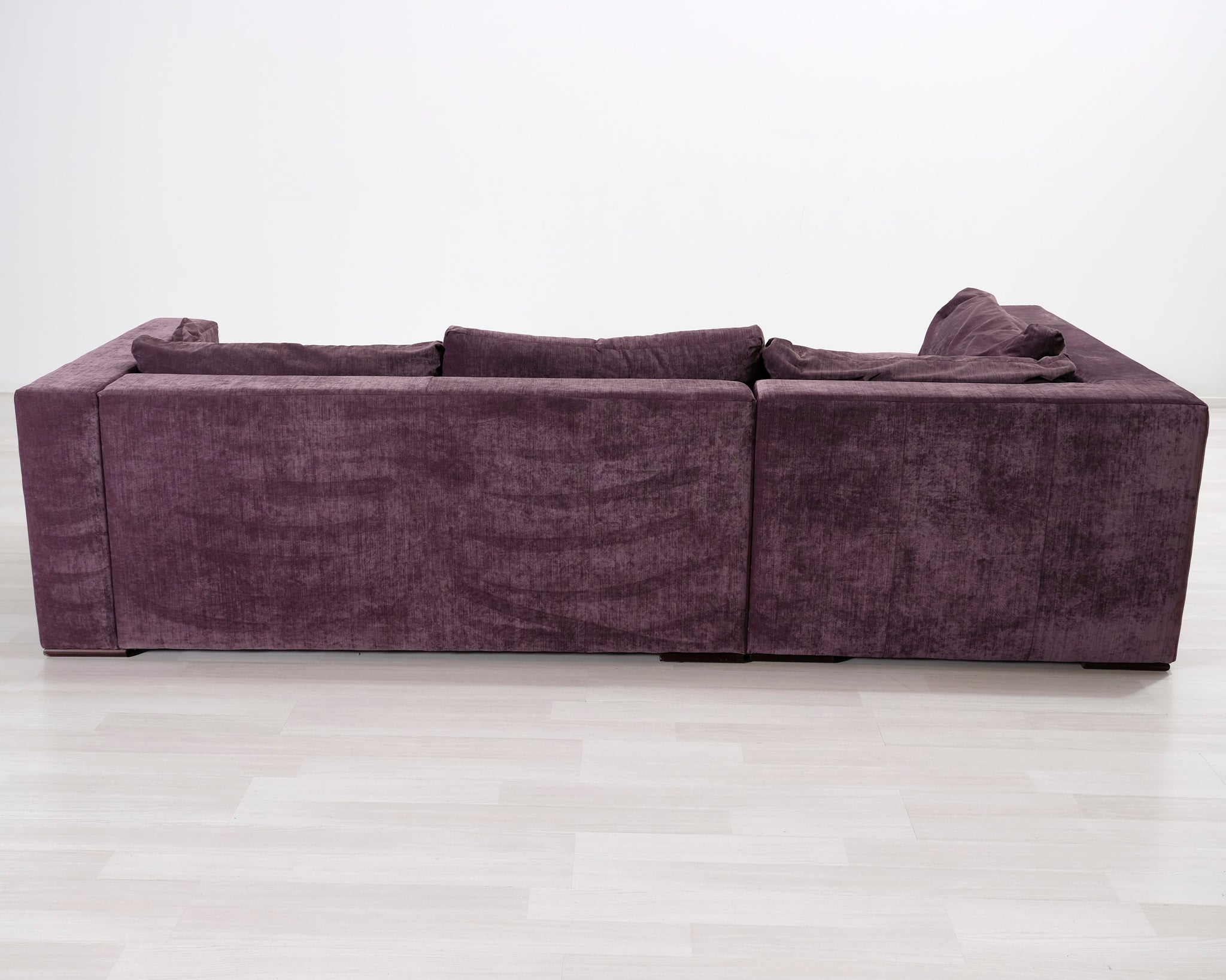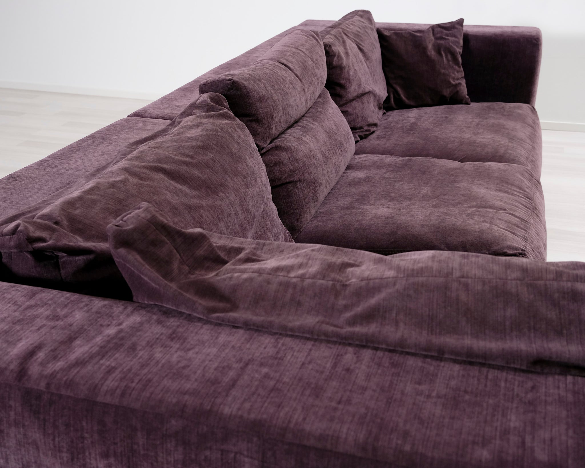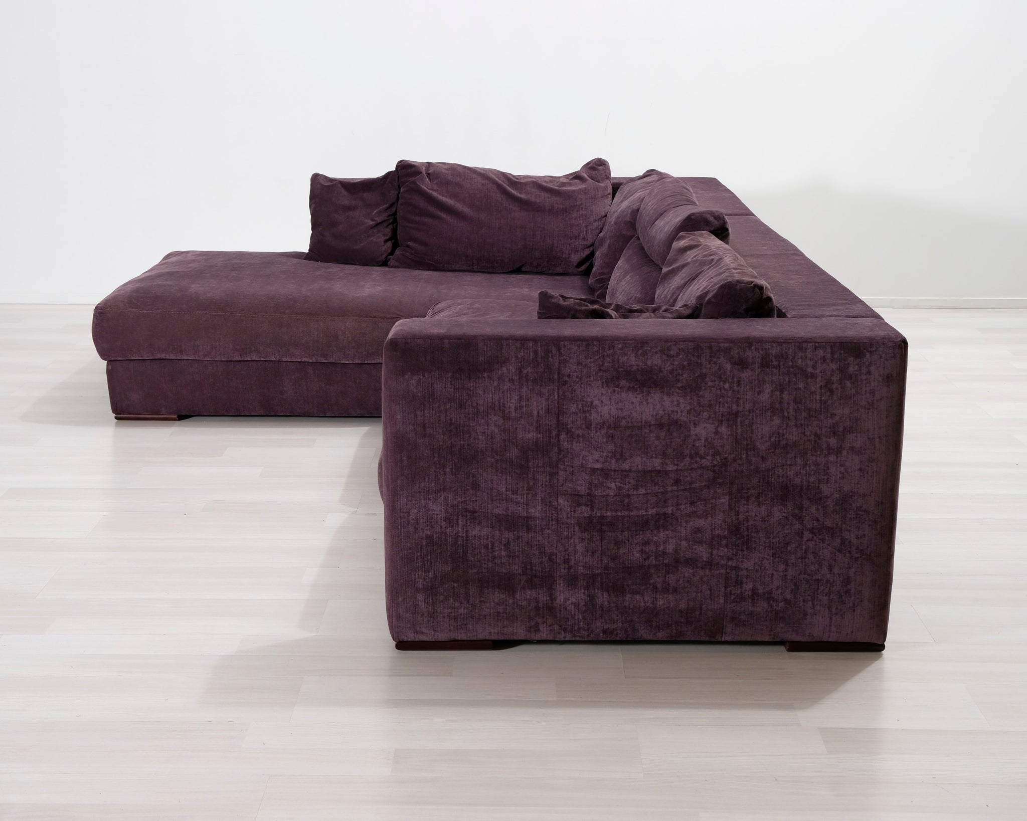 Suurikokoinen liila kulmasohva irrotettavilla päällisillä. Leveä avokulma tekee sohvasta erittäin mukavan.