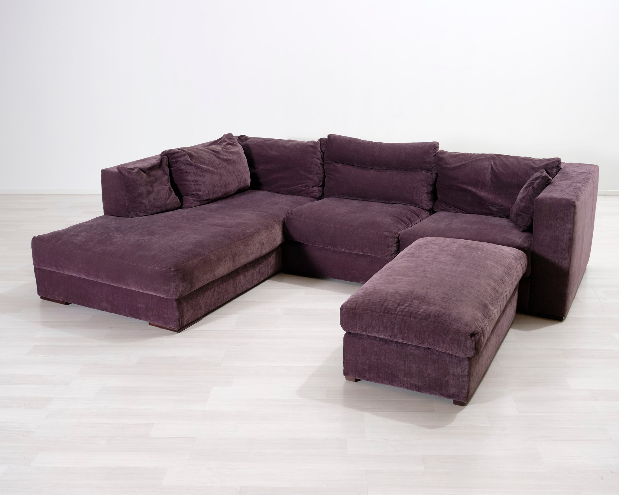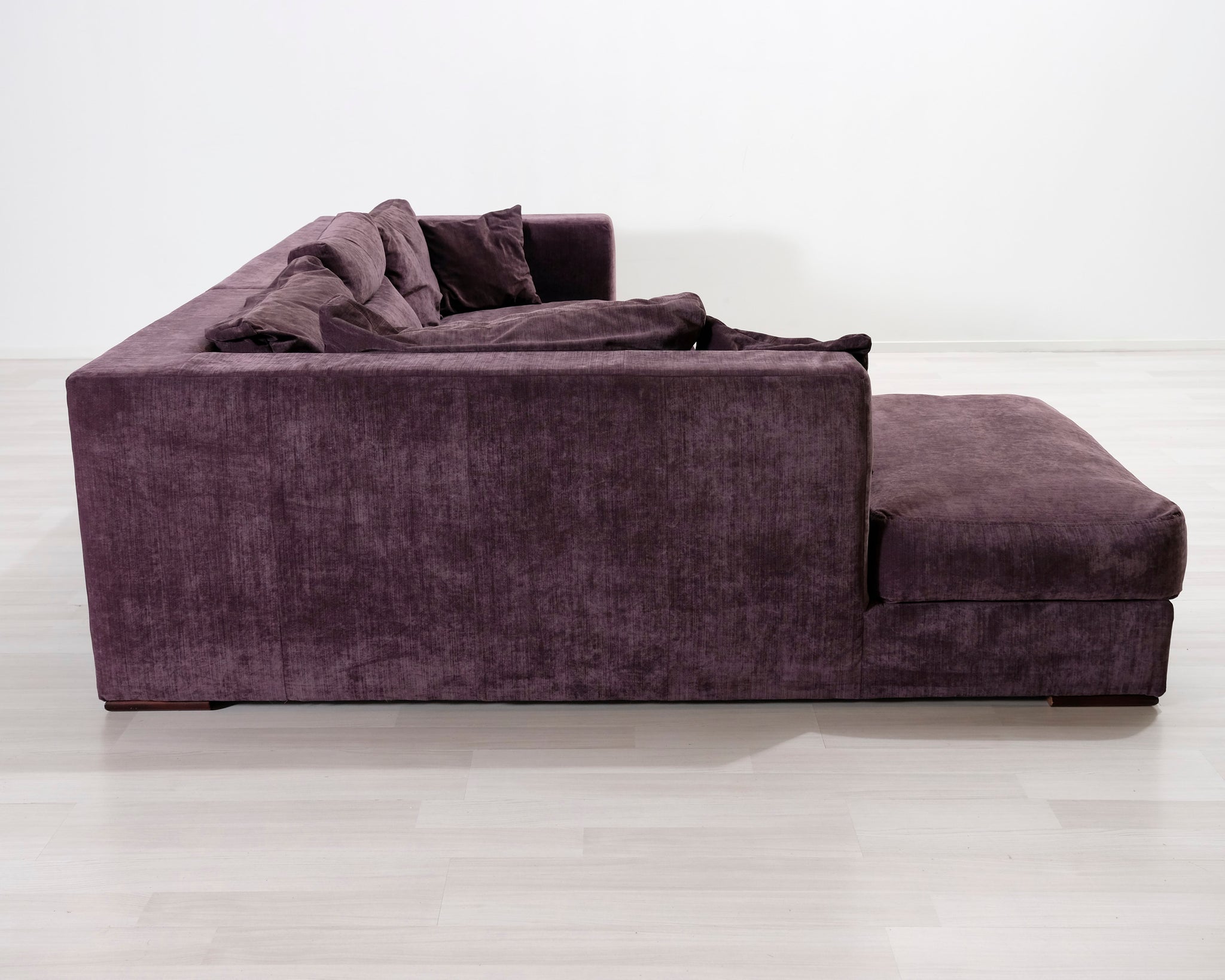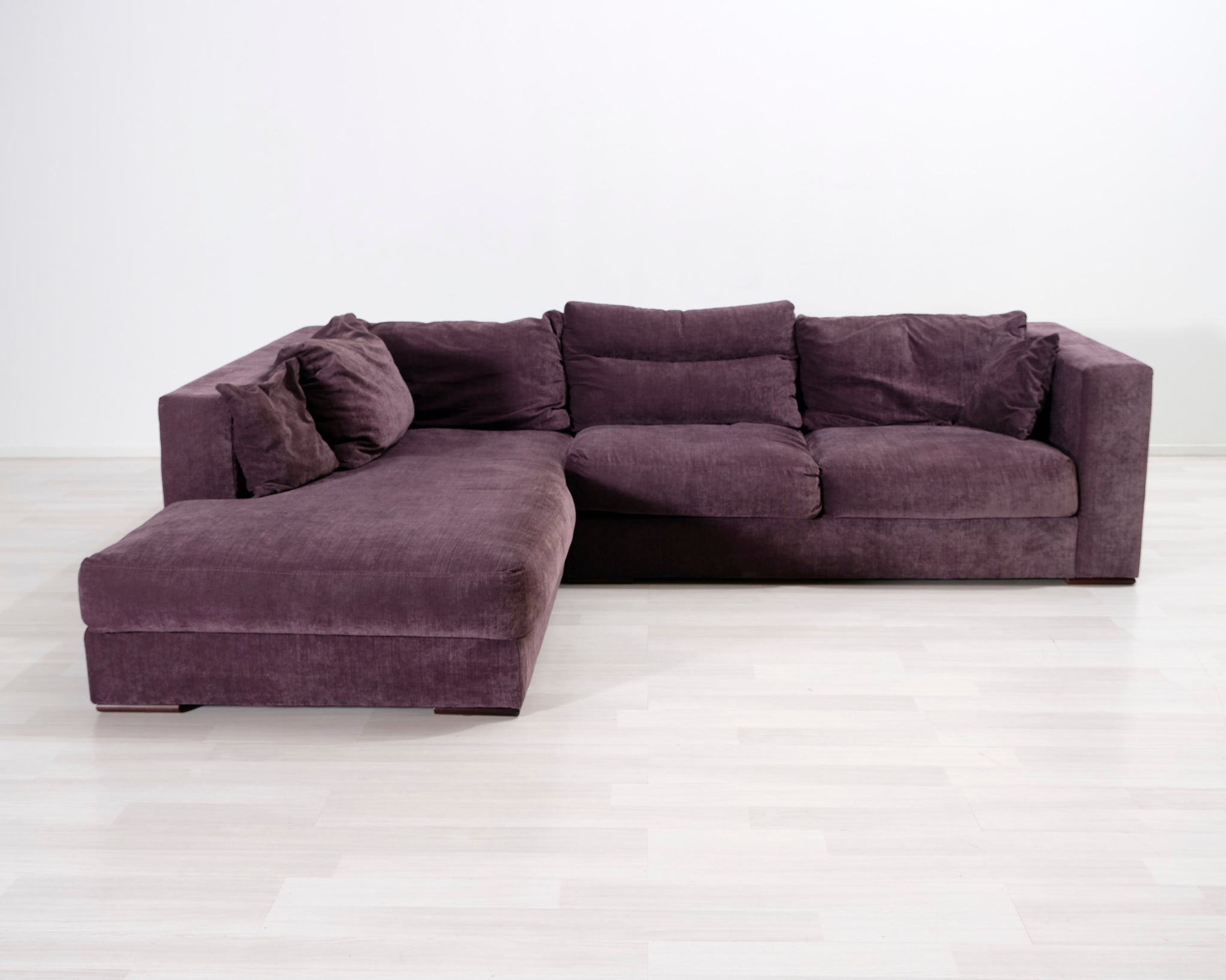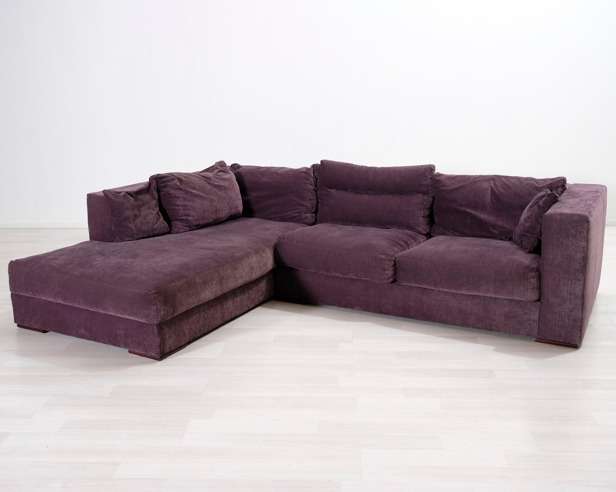 Suurikokoinen liila kulmasohva irrotettavilla päällisillä. Leveä avokulma tekee sohvasta erittäin mukavan.