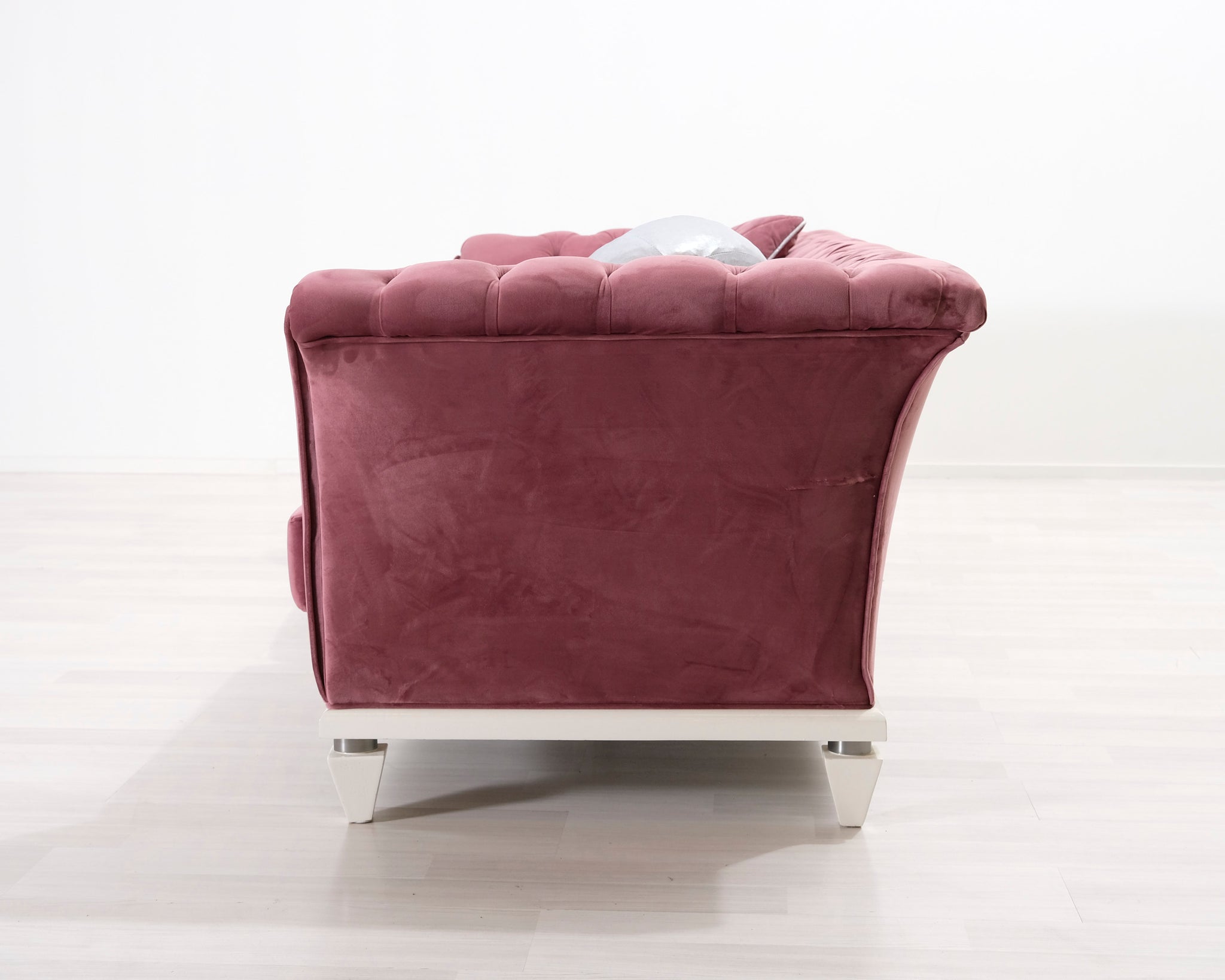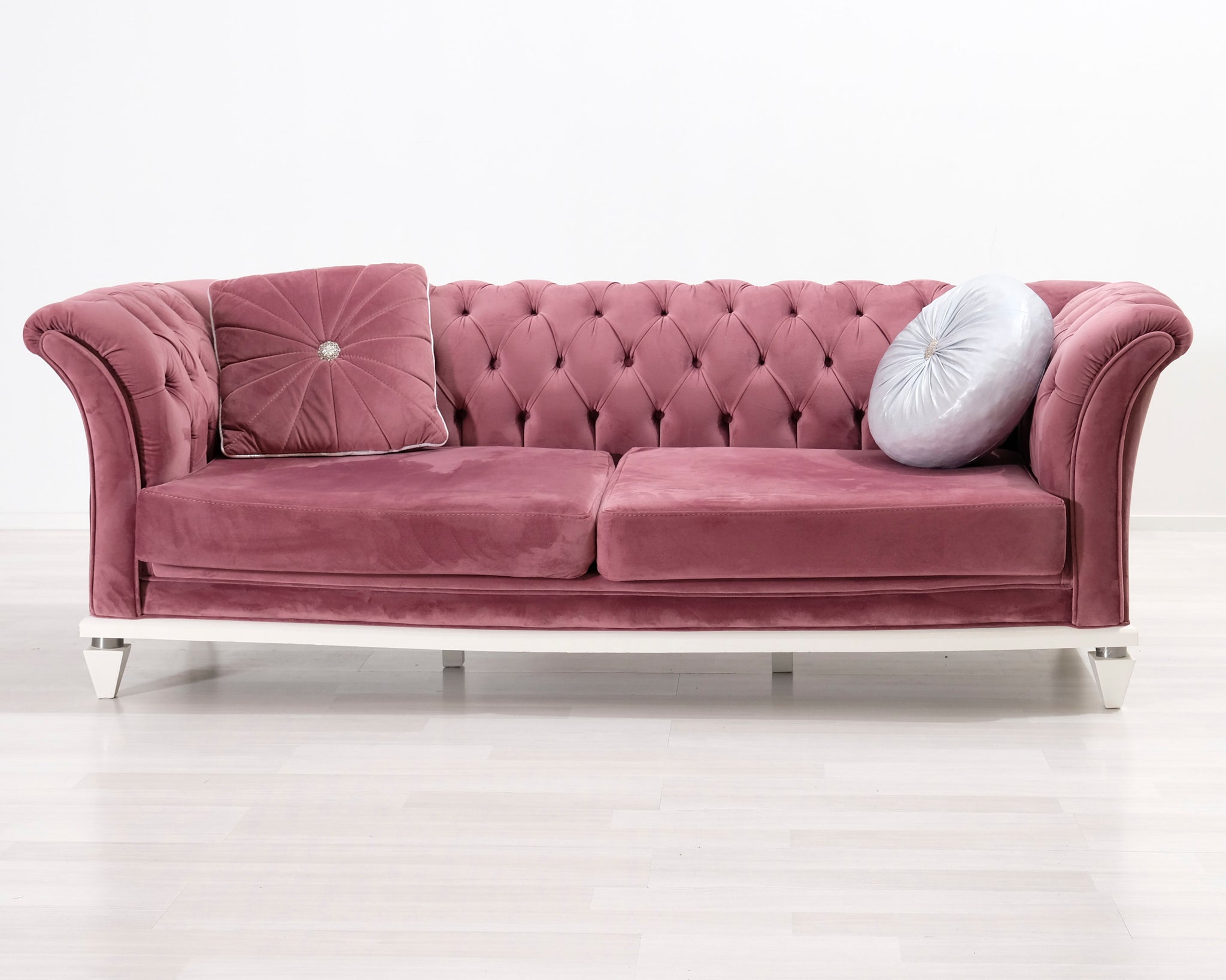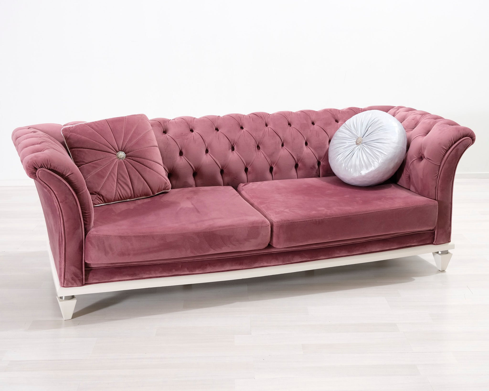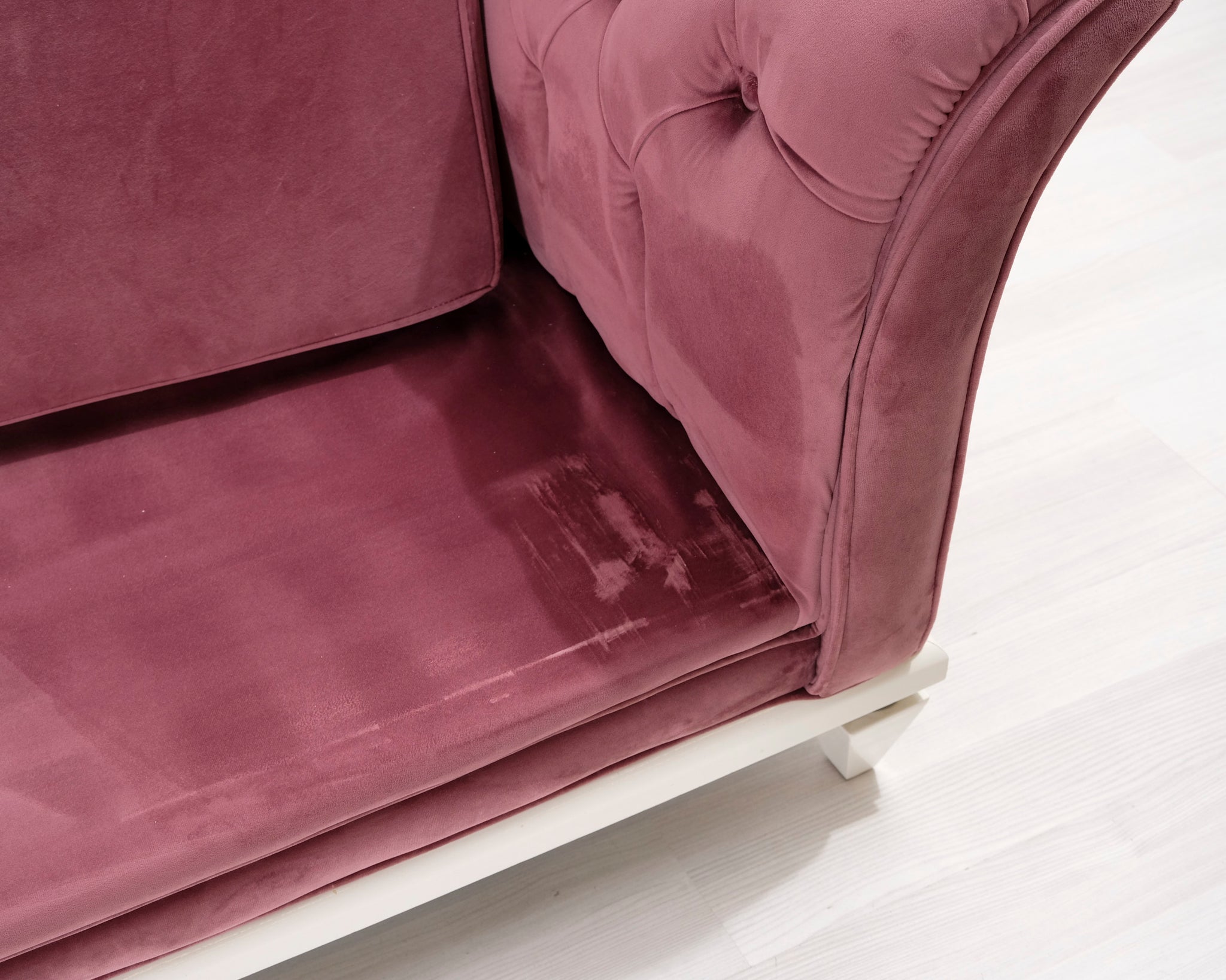 Kolmen istuttava vaaleanpunainen sohva. Tikattu selkänoja, pyöristetyt käsinojat ja irtotyynyt. Alcantara-verhoilu.