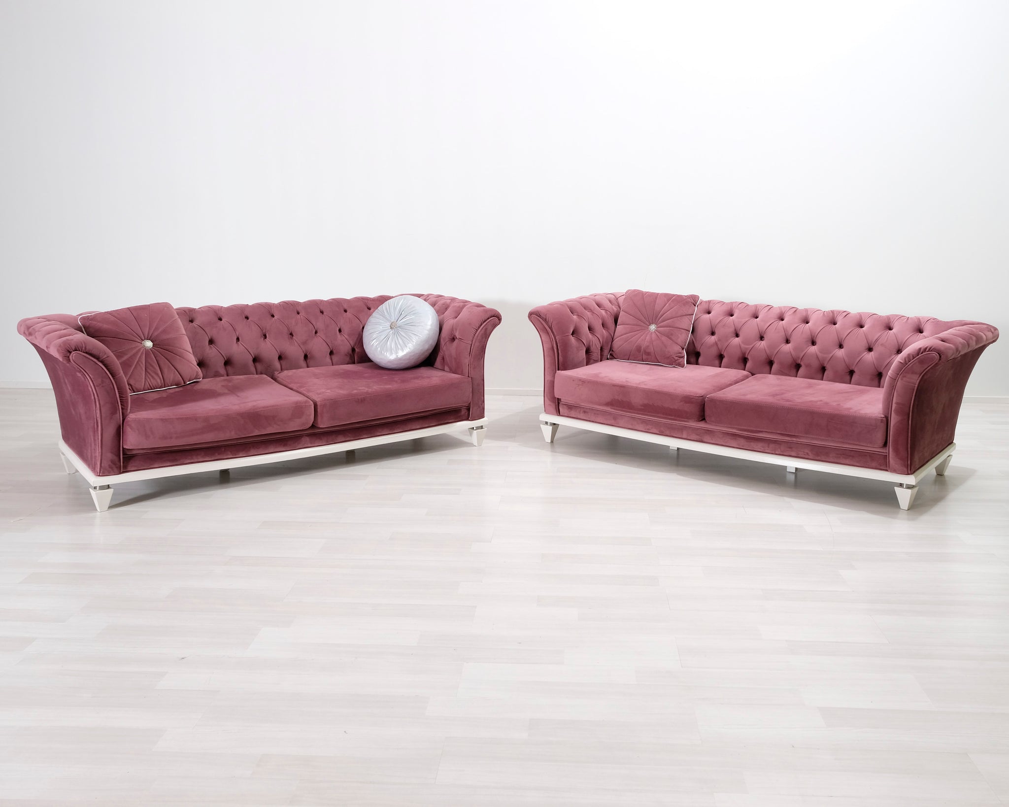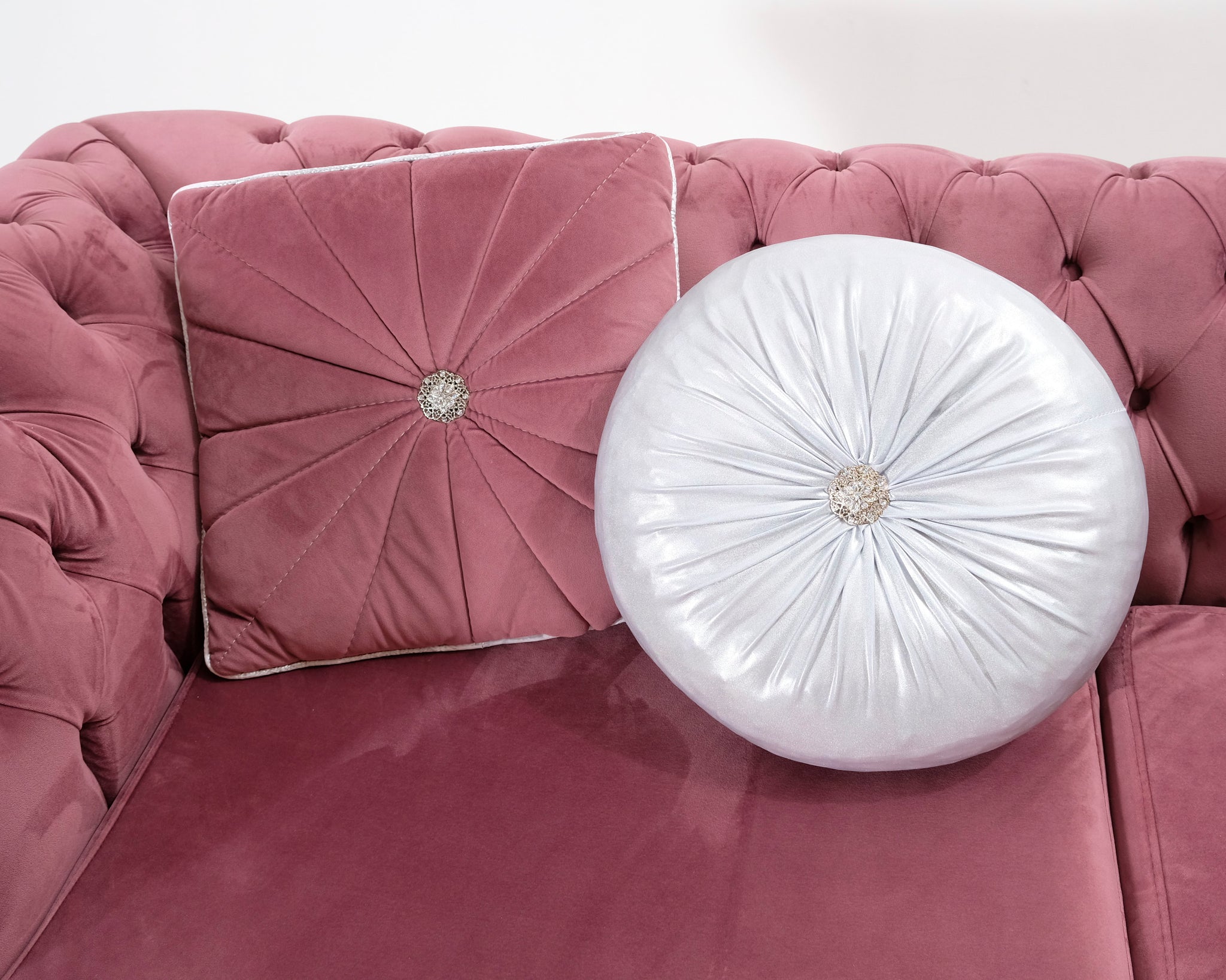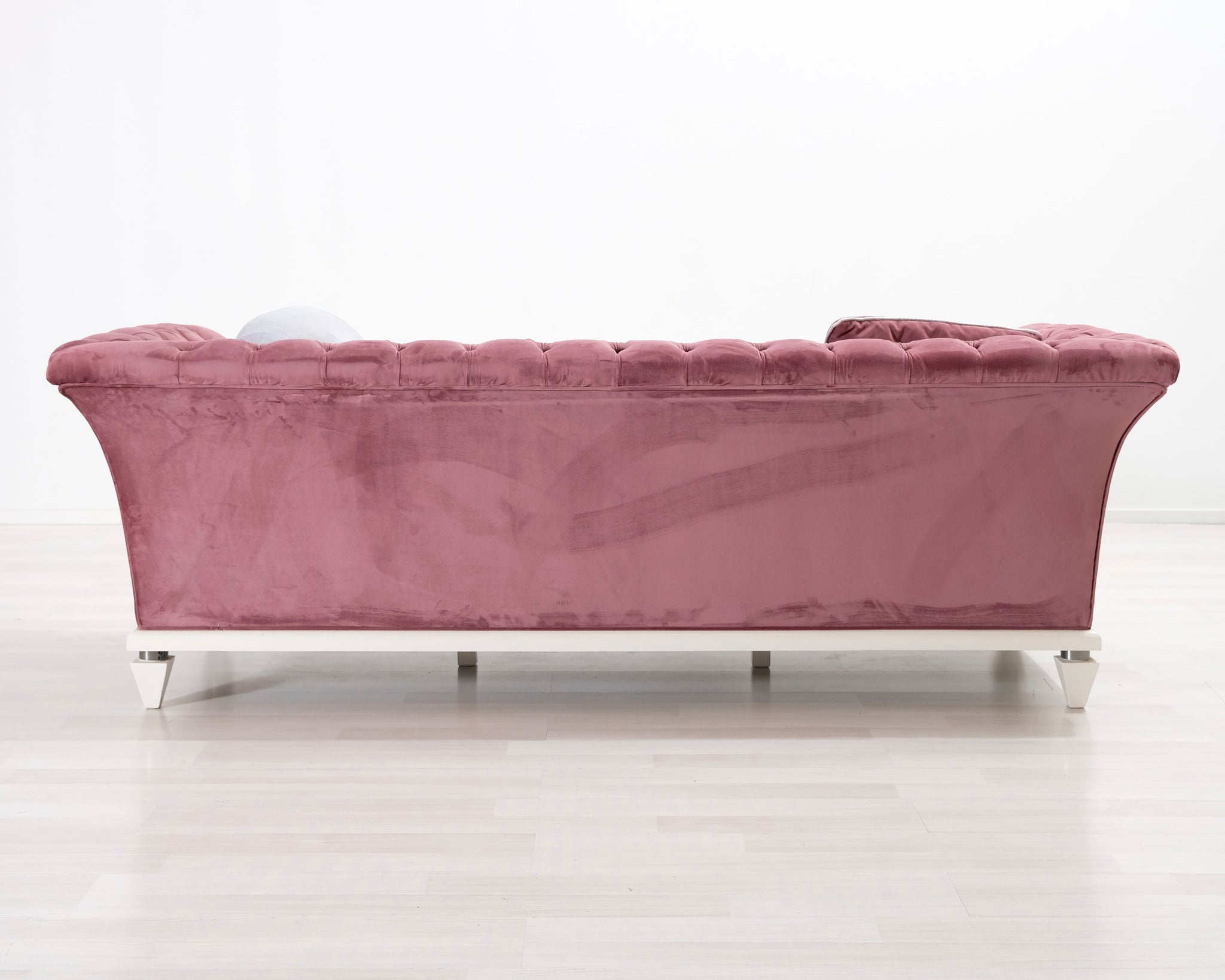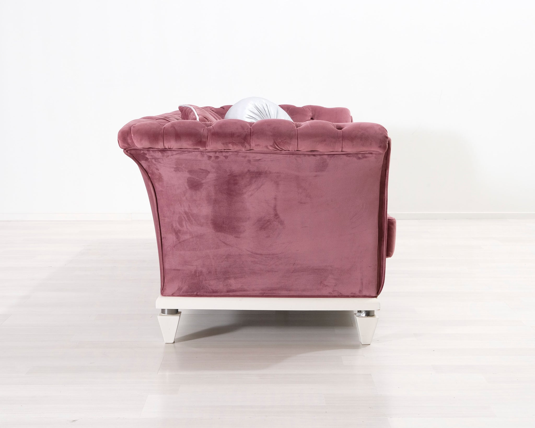 Kolmen istuttava vaaleanpunainen sohva. Tikattu selkänoja, pyöristetyt käsinojat ja irtotyynyt. Alcantara-verhoilu.