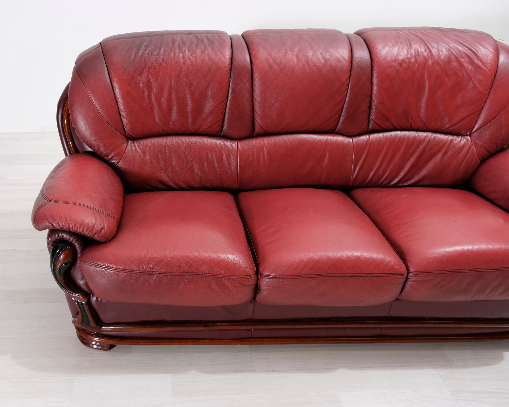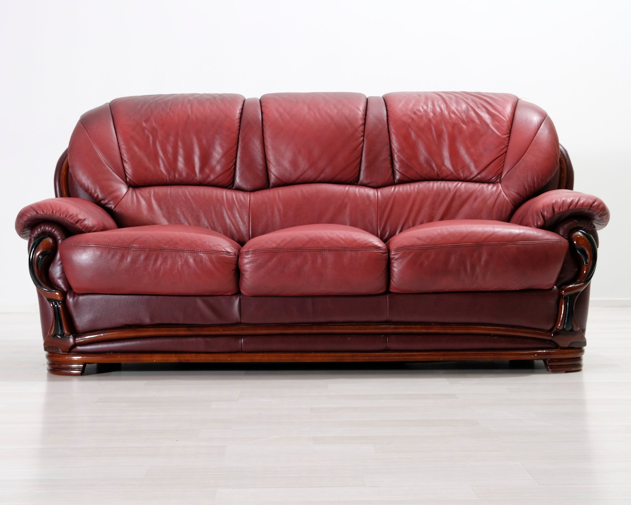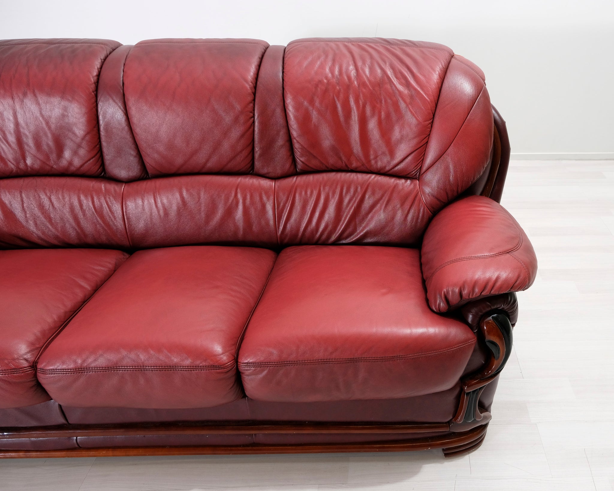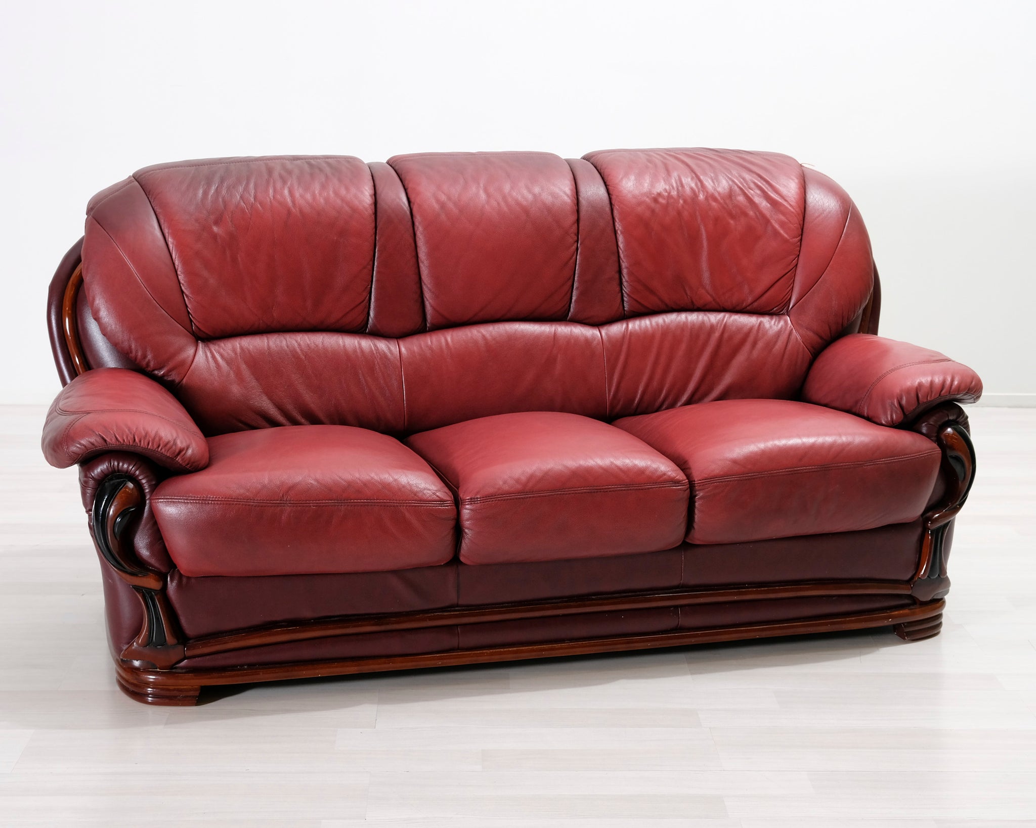 Kolmen istuttava nahkasohva. Punainen verhoilu. Puiset yksityiskohdat.