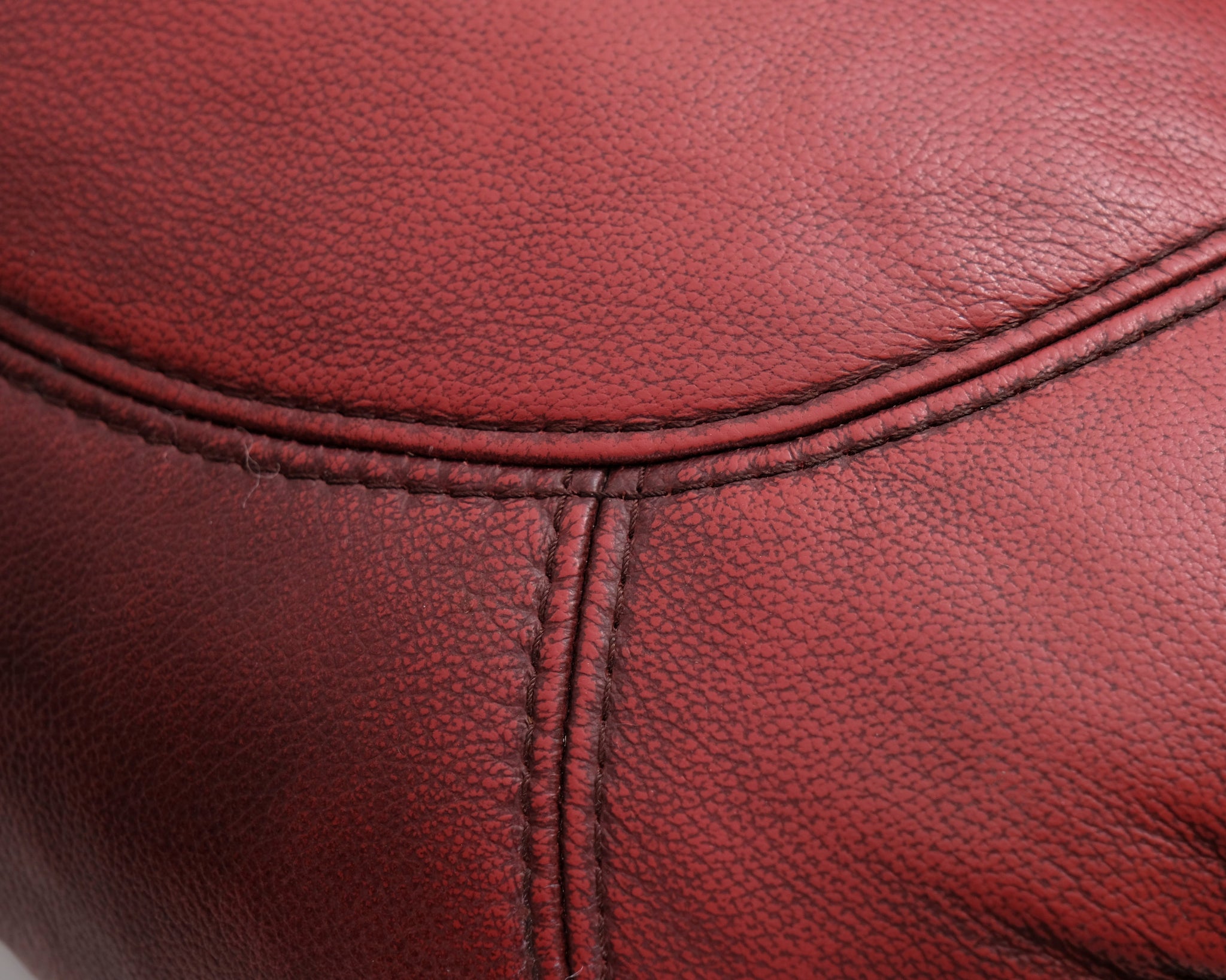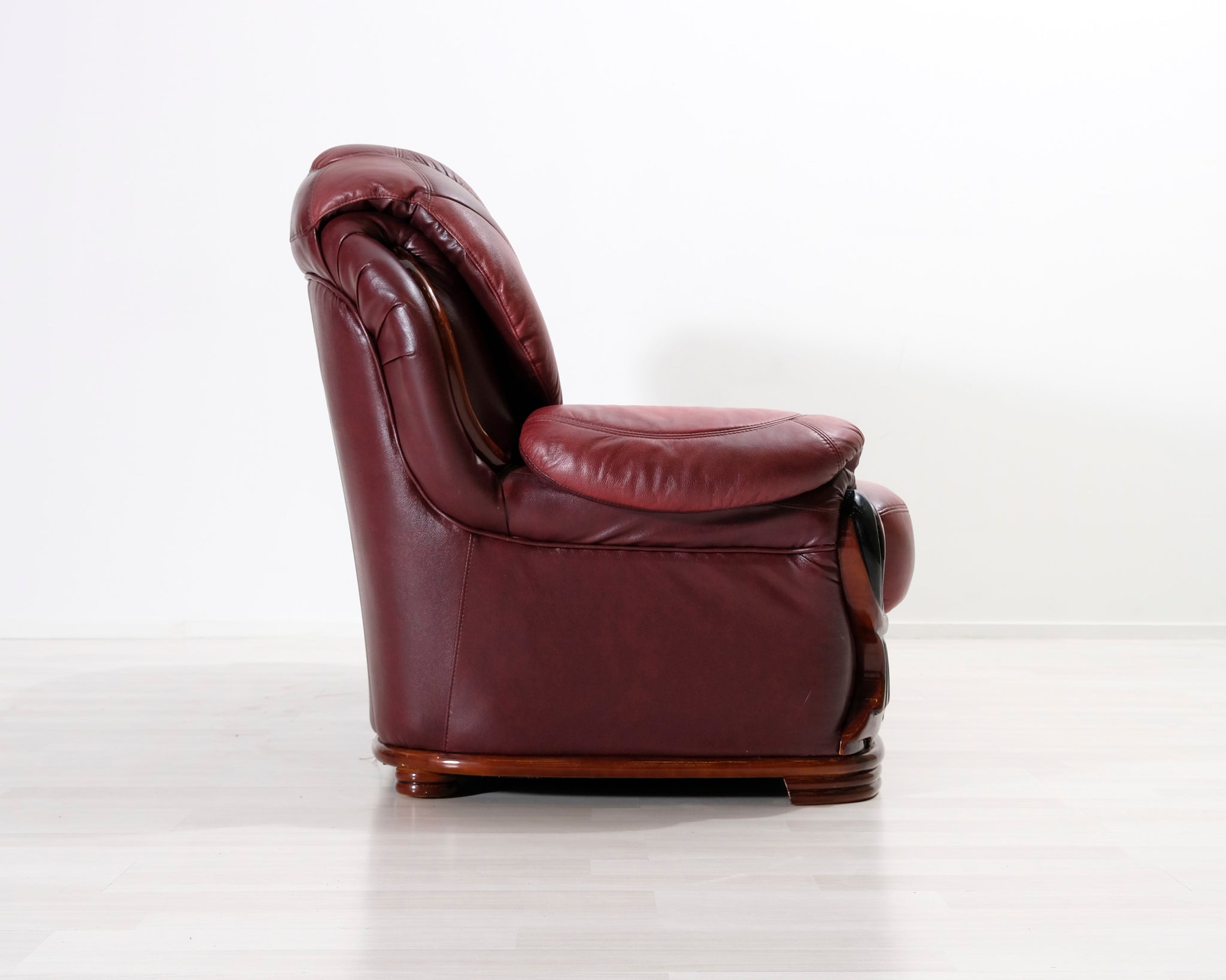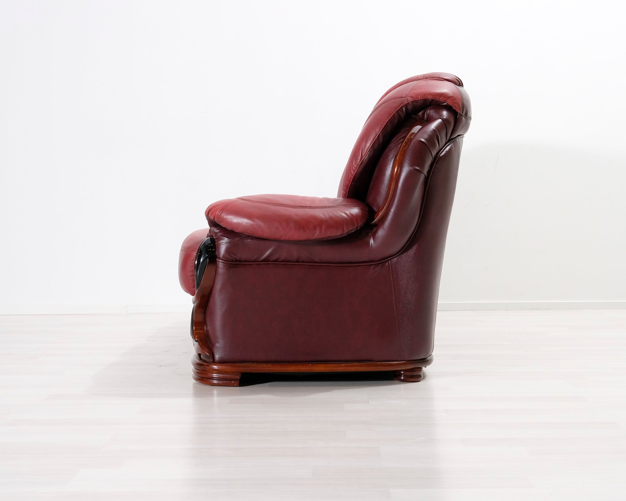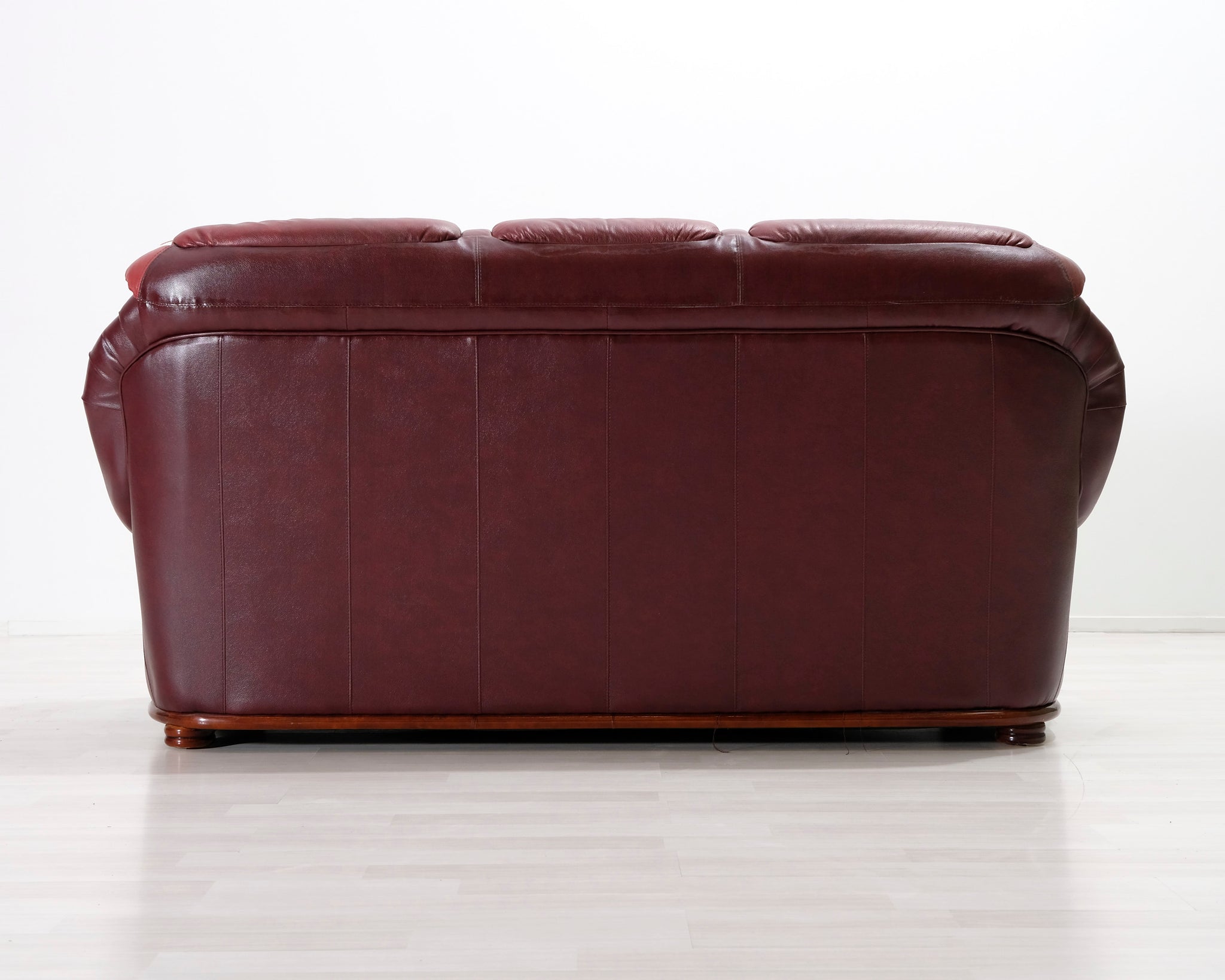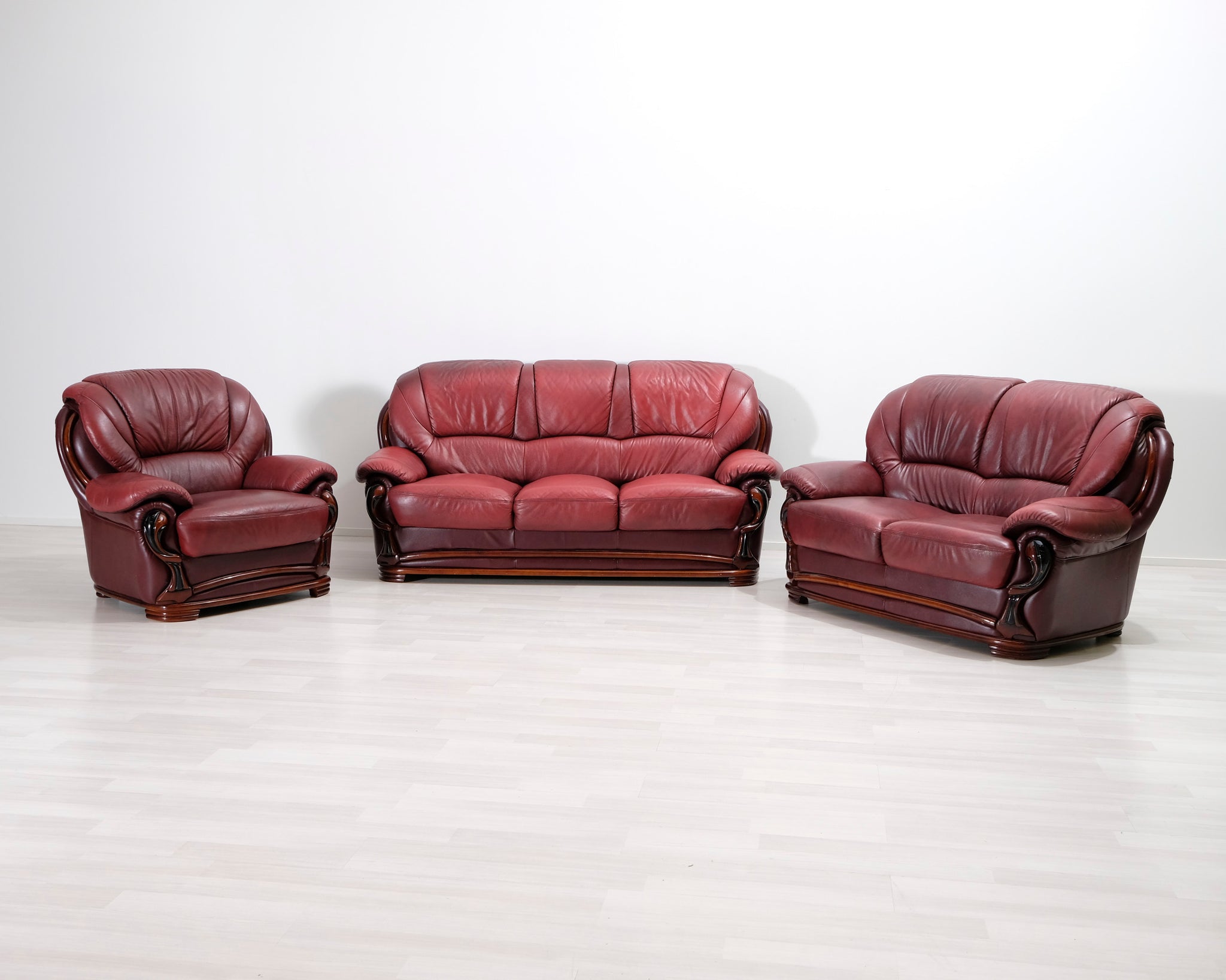 Kolmen istuttava nahkasohva. Punainen verhoilu. Puiset yksityiskohdat.