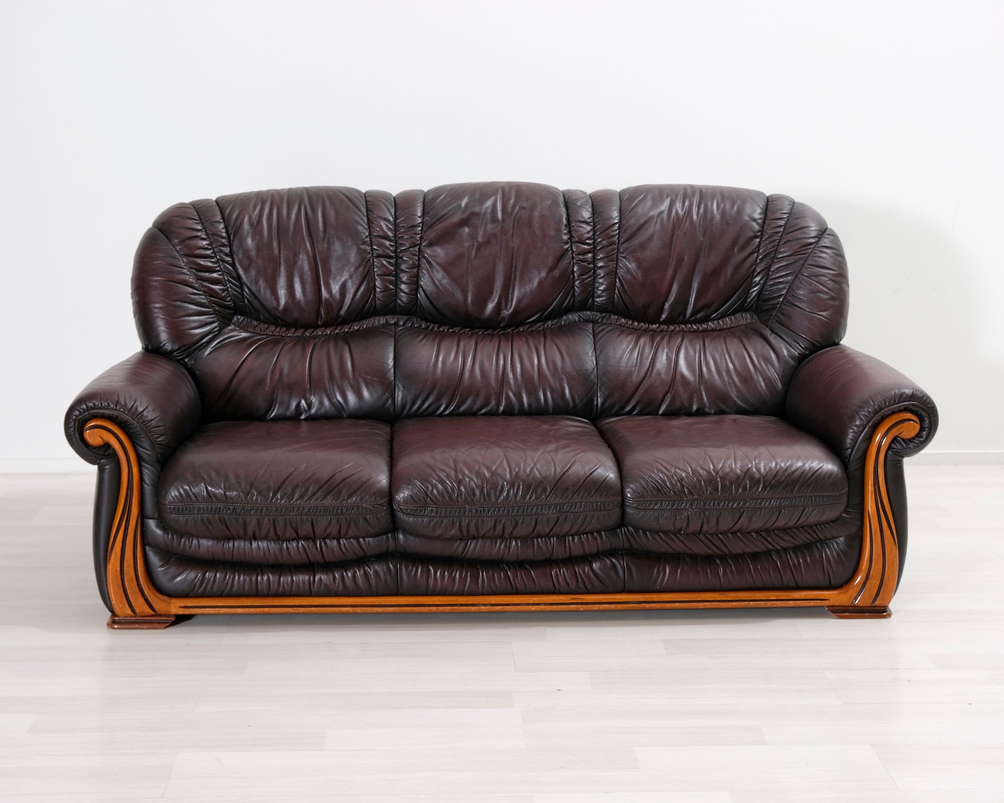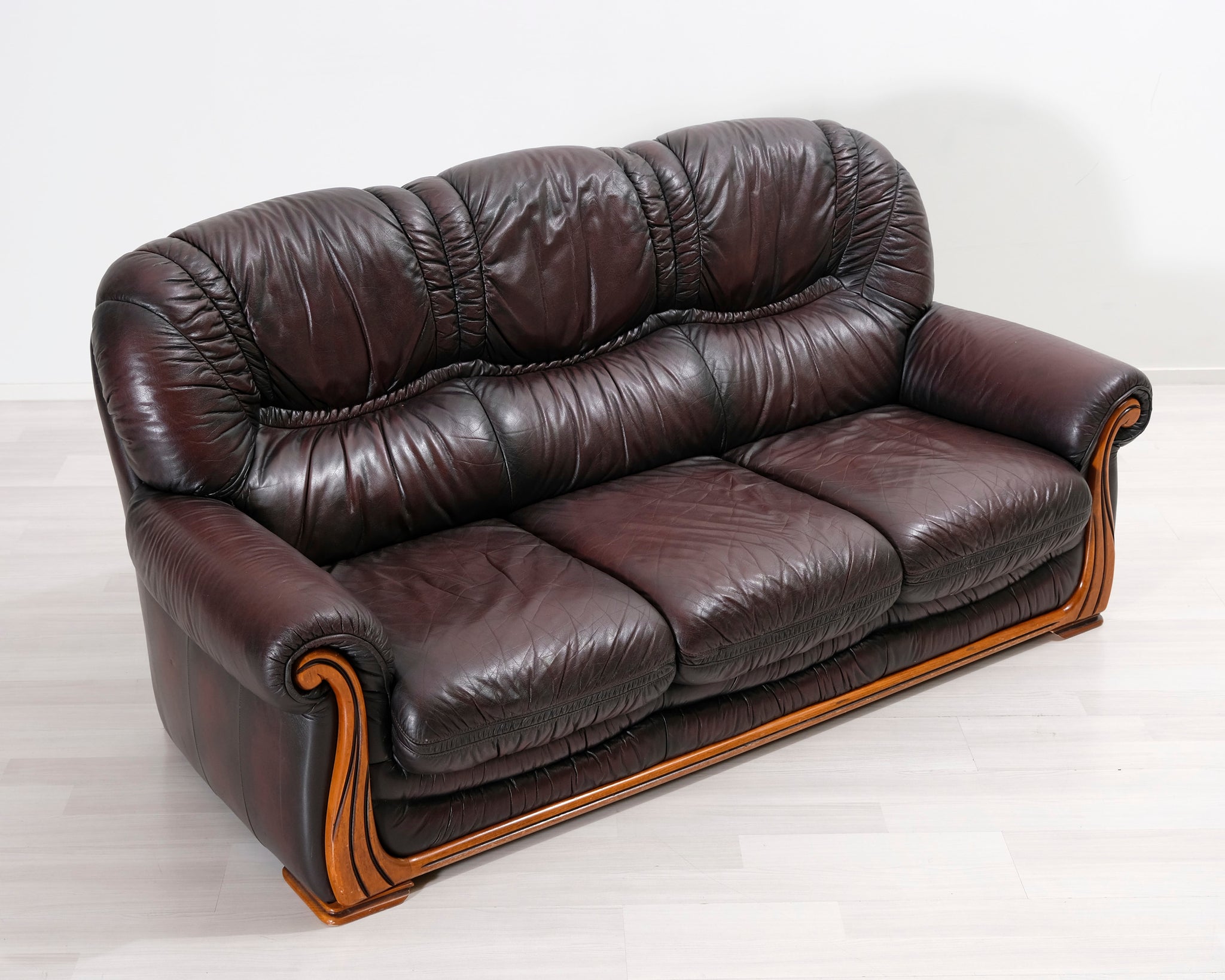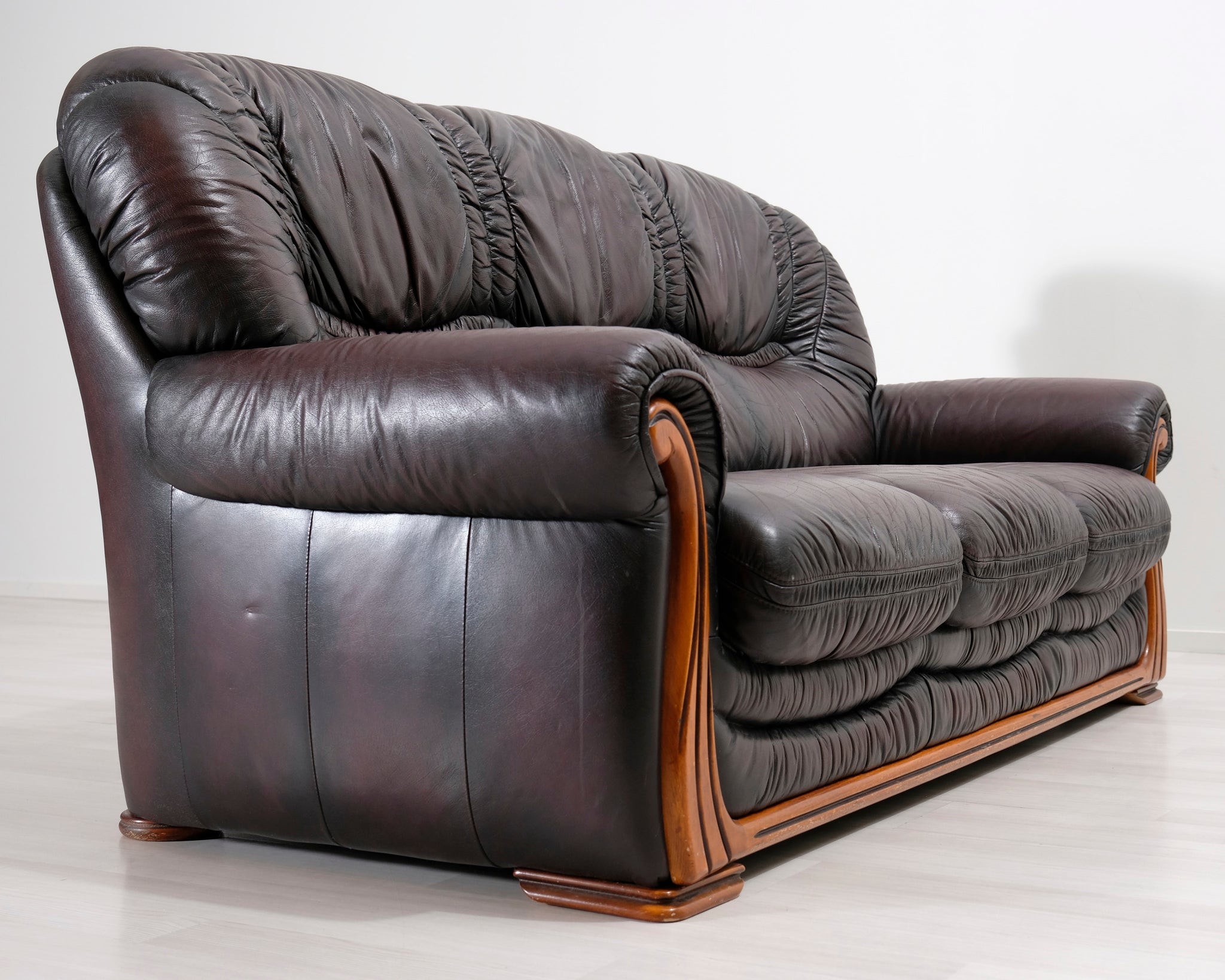 Kolmen istuttava nahkasohva. Puusta valmistetut yksityiskohdat.