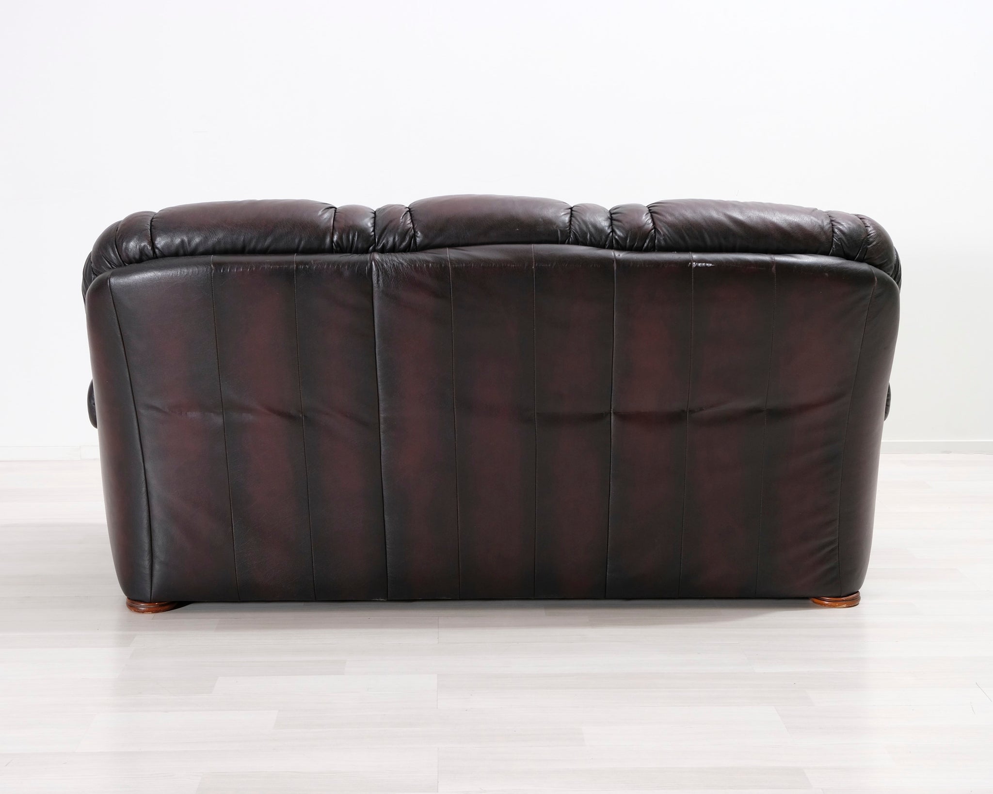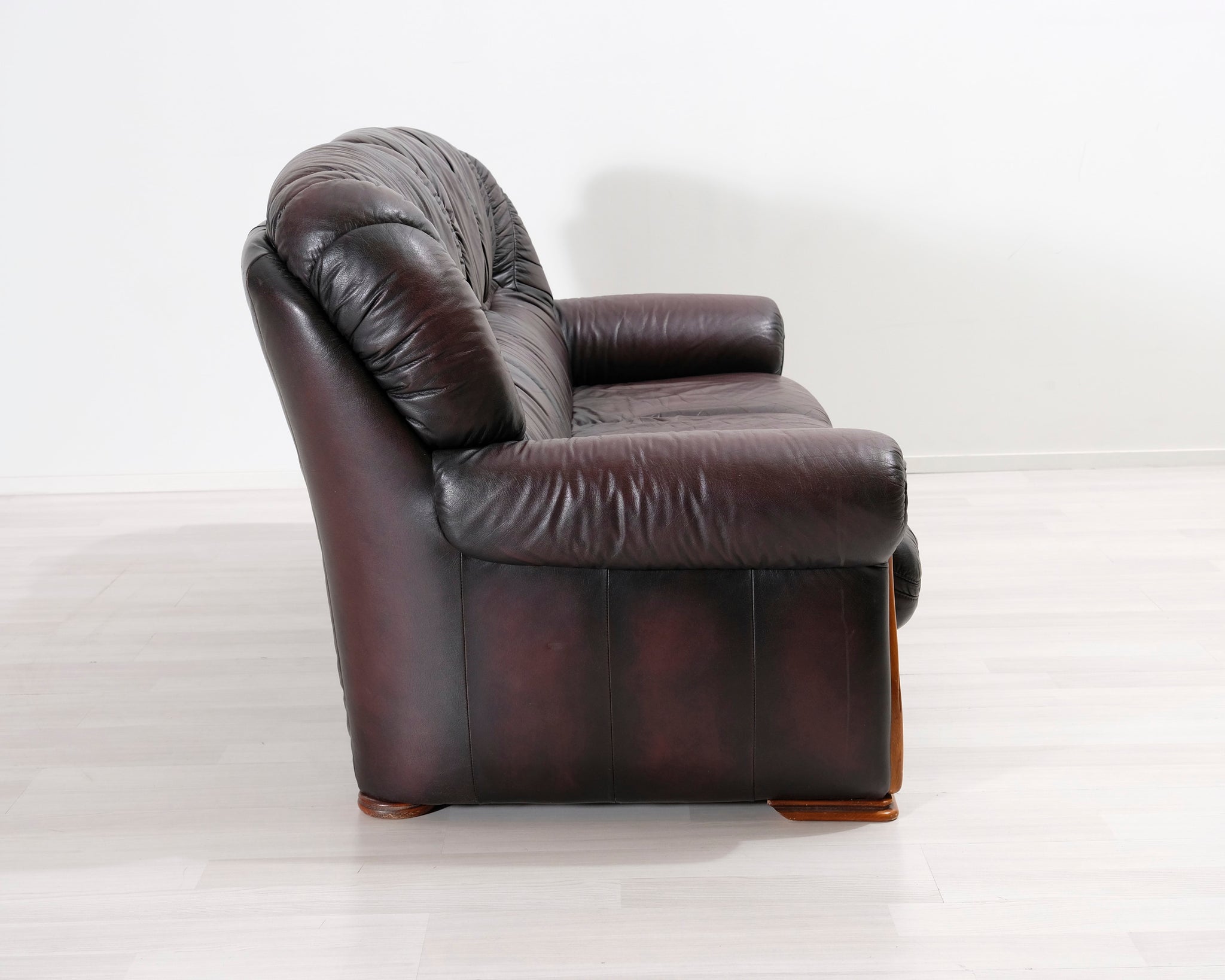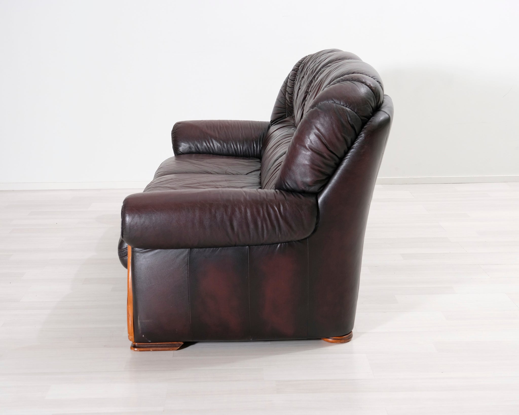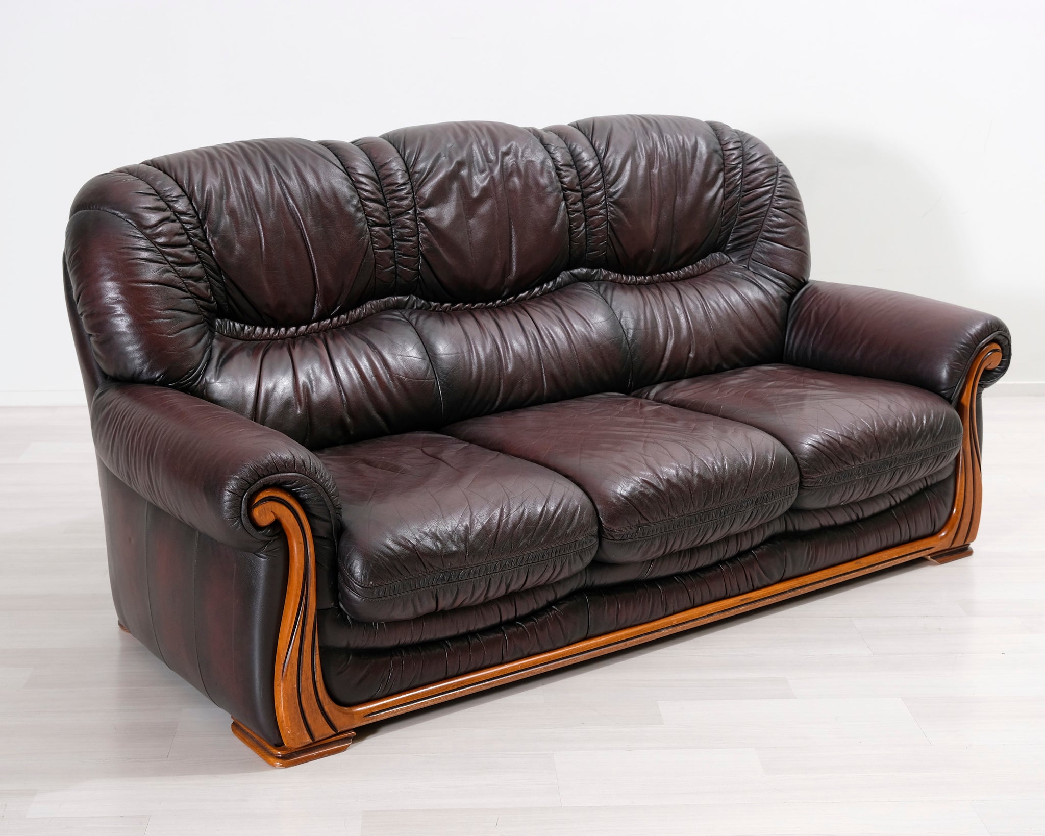 Kolmen istuttava nahkasohva. Puusta valmistetut yksityiskohdat.