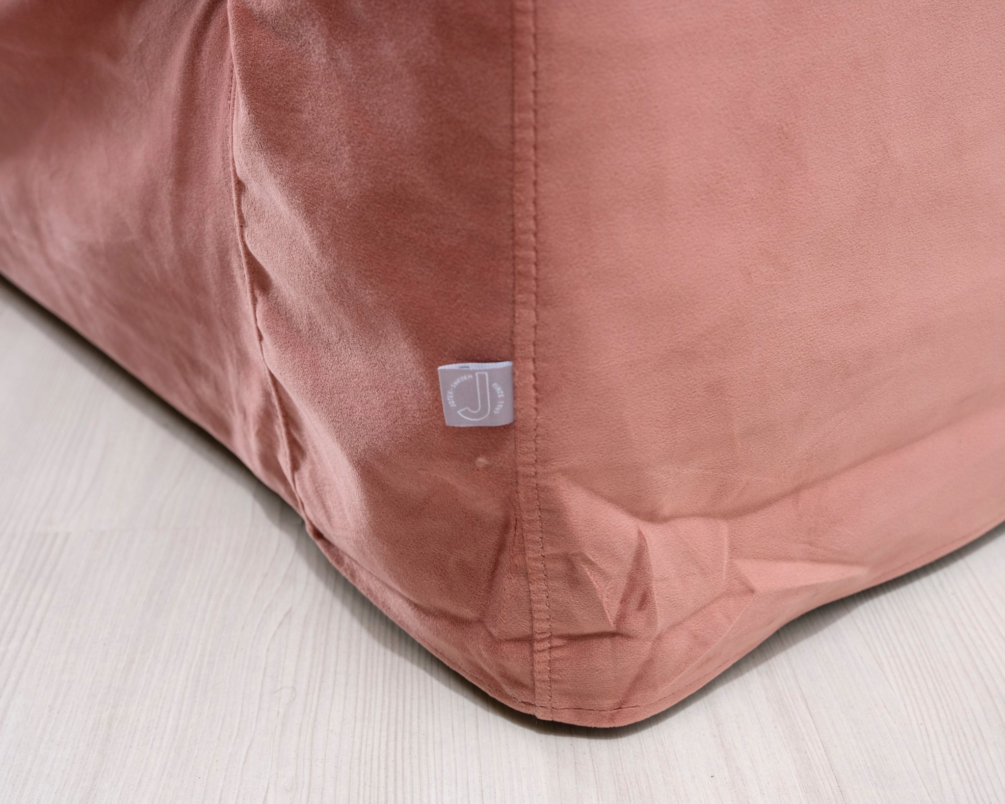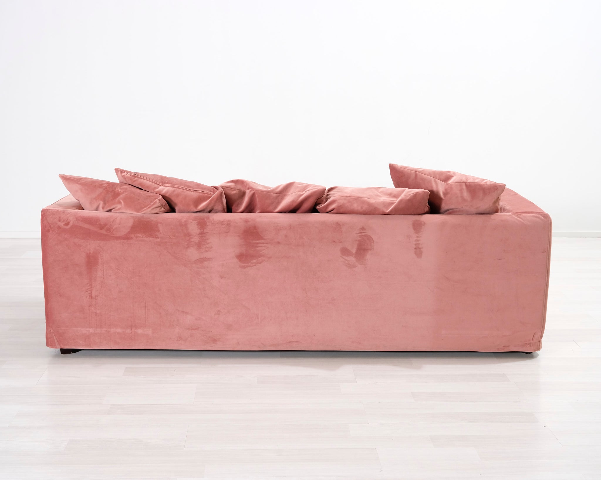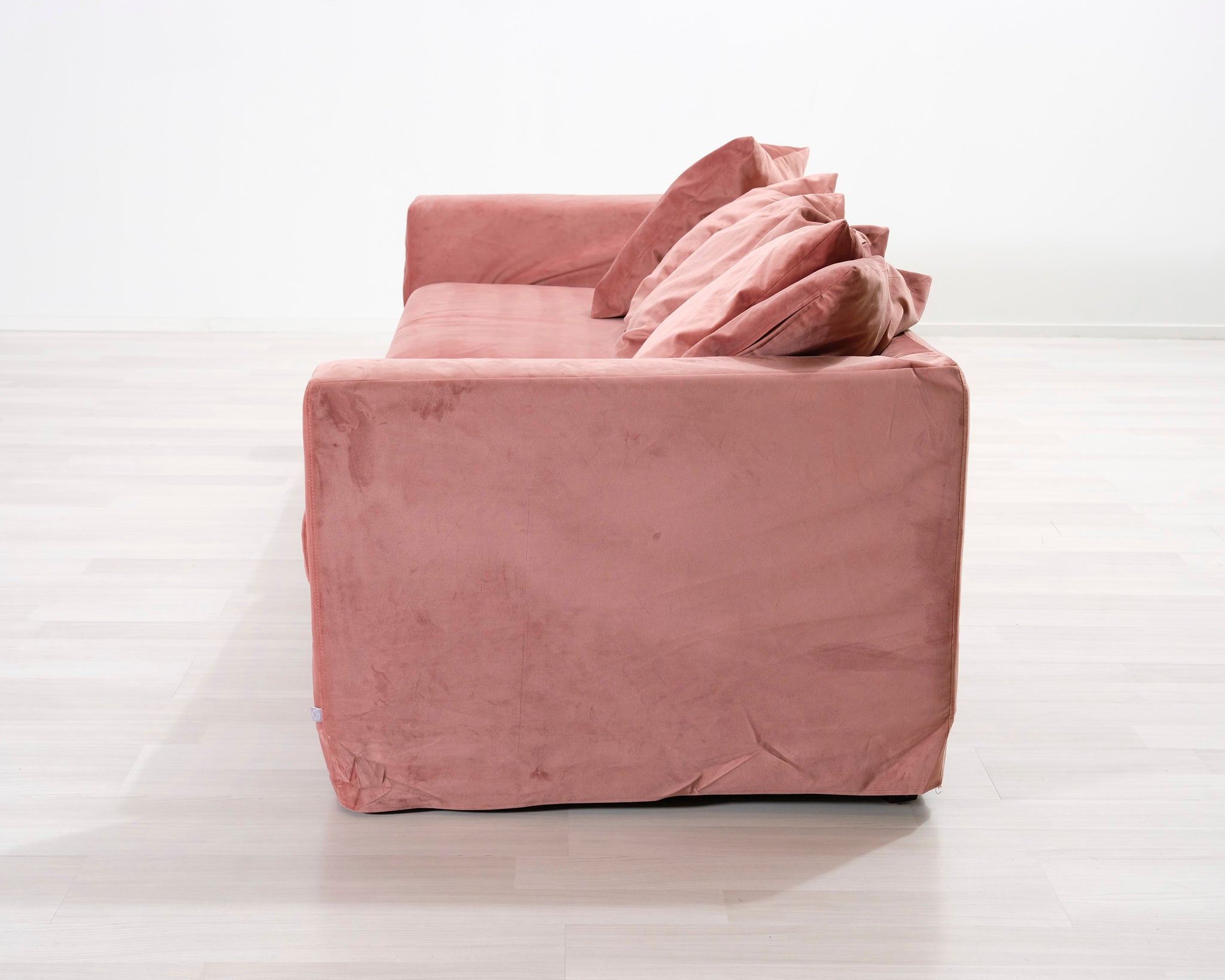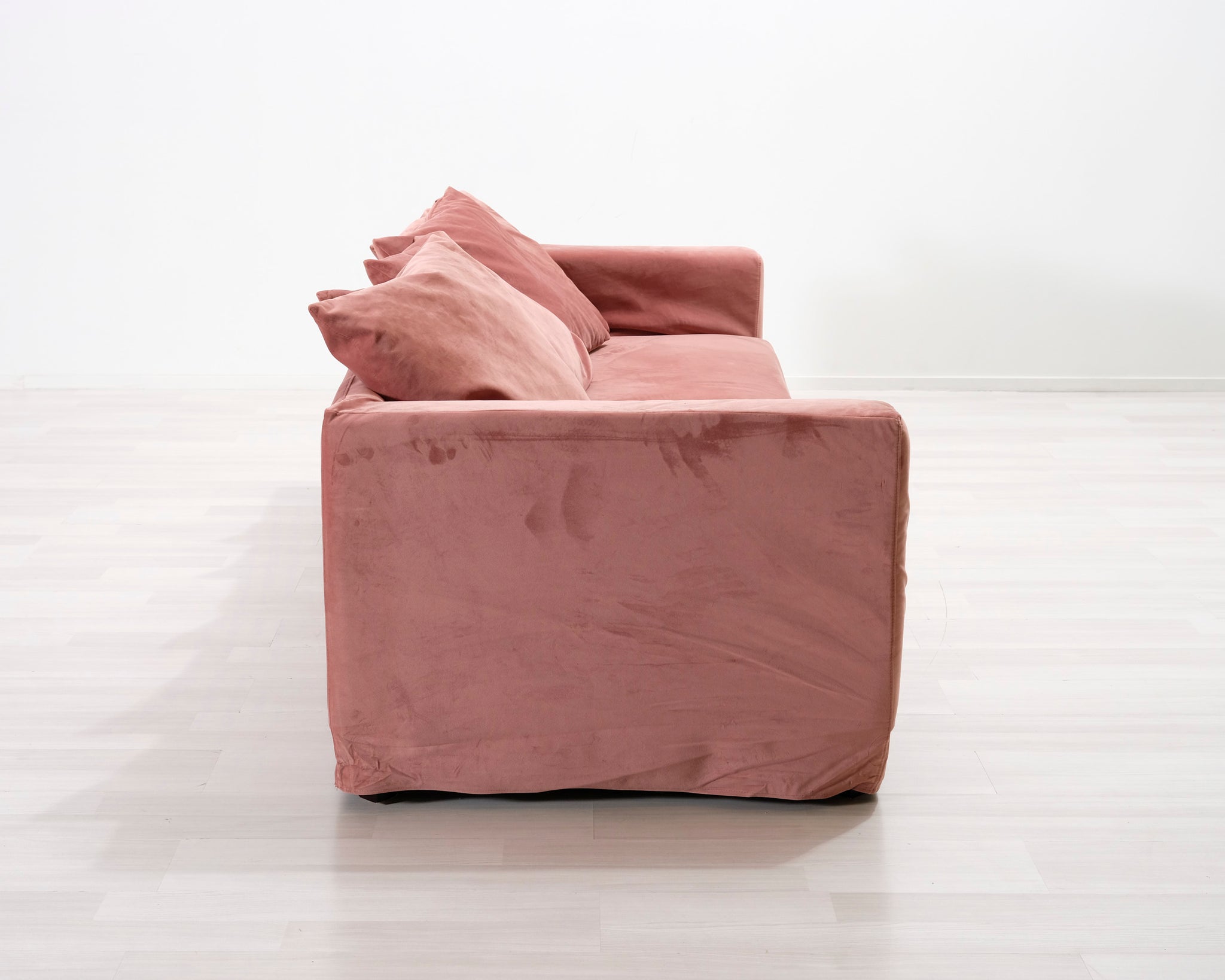 Jotexin valmistama kolmen istuttava sohva. Vaaleanpunainen kangasverhoilu. Matala selkänoja ja irtotyynyt antavat sohvalle rennon lookin.