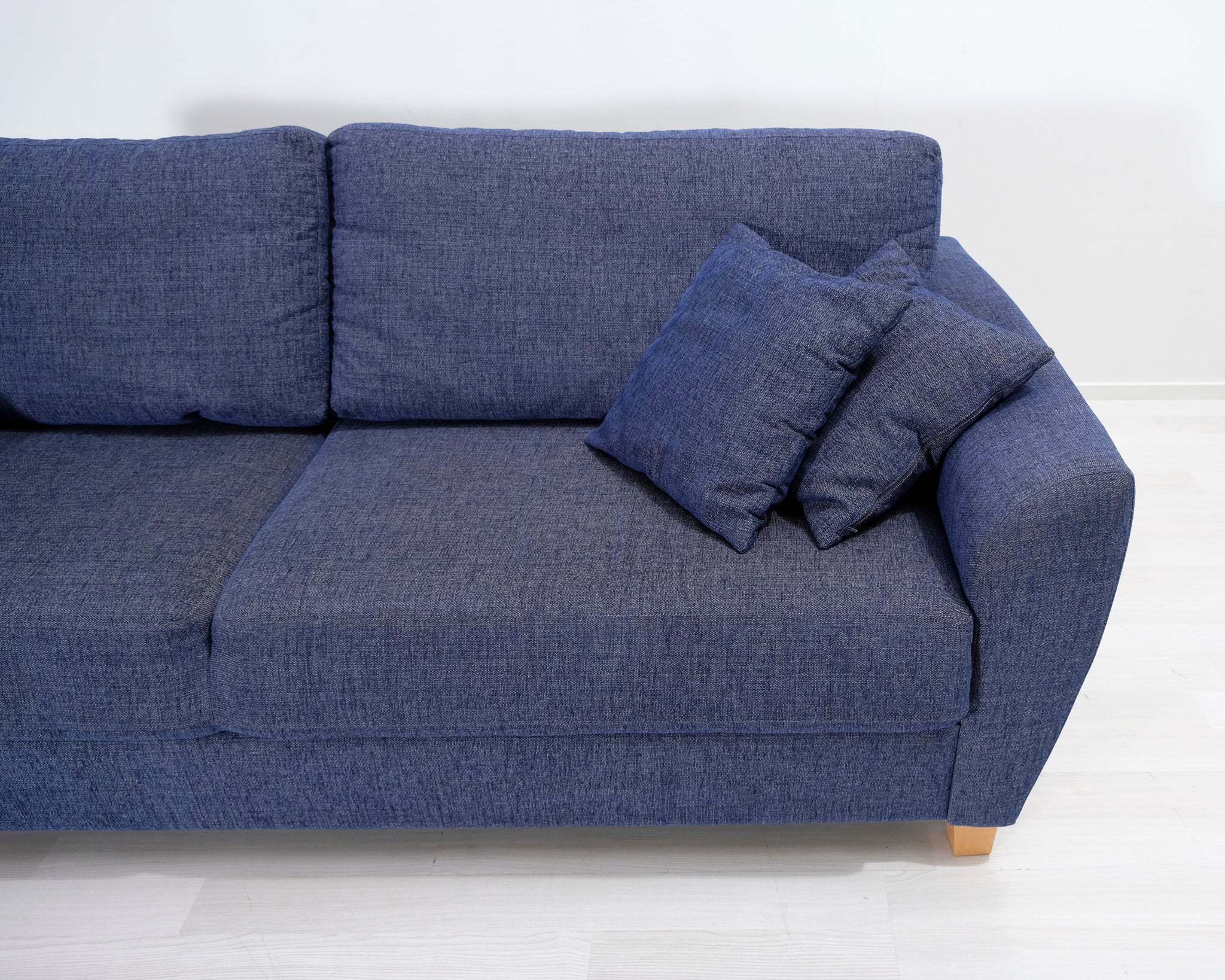 Mion Vaxholm-vuodesohva. Sininen kangasverhoilu. Irtotyynyt antavat sohvalle rennon ilmeen.