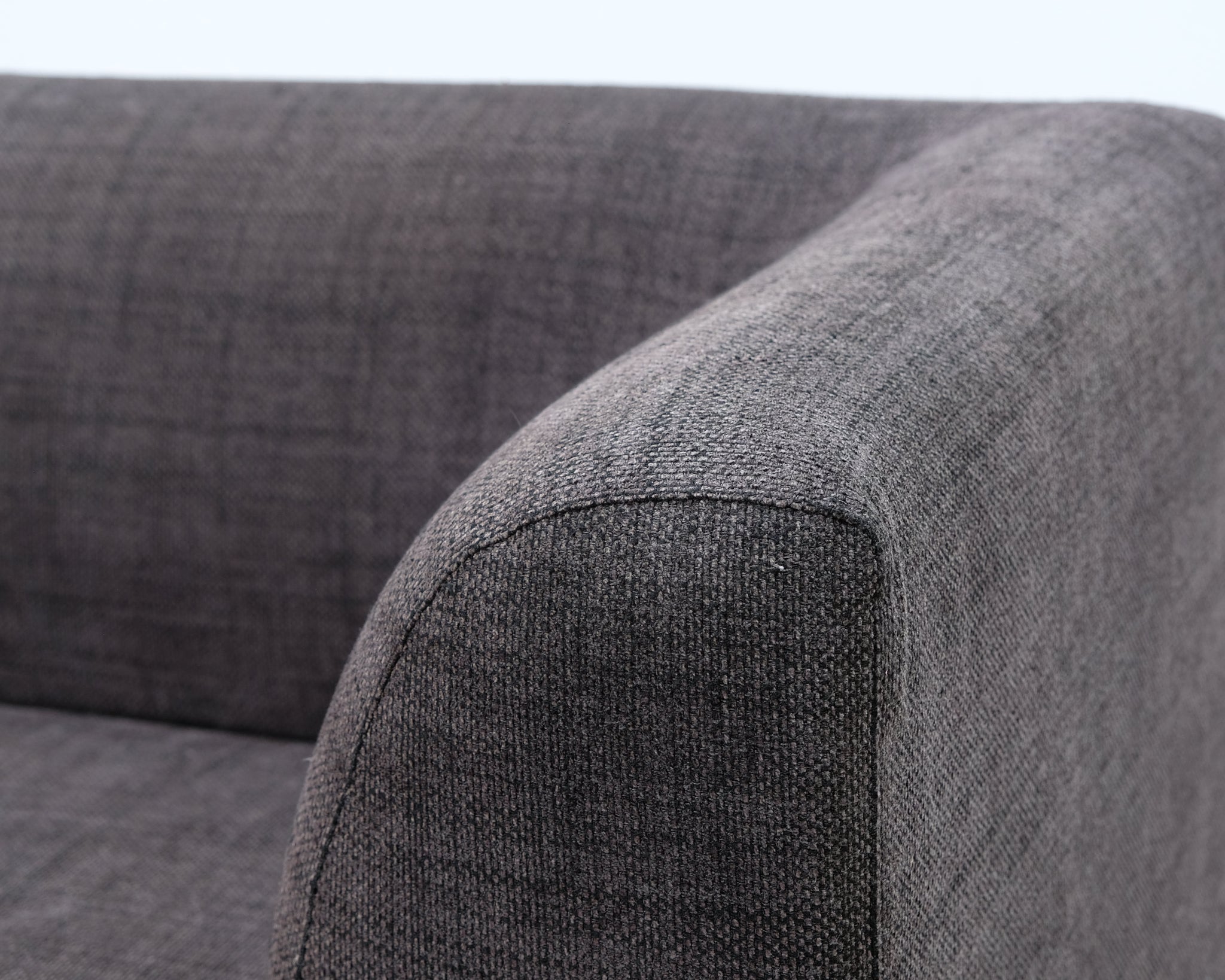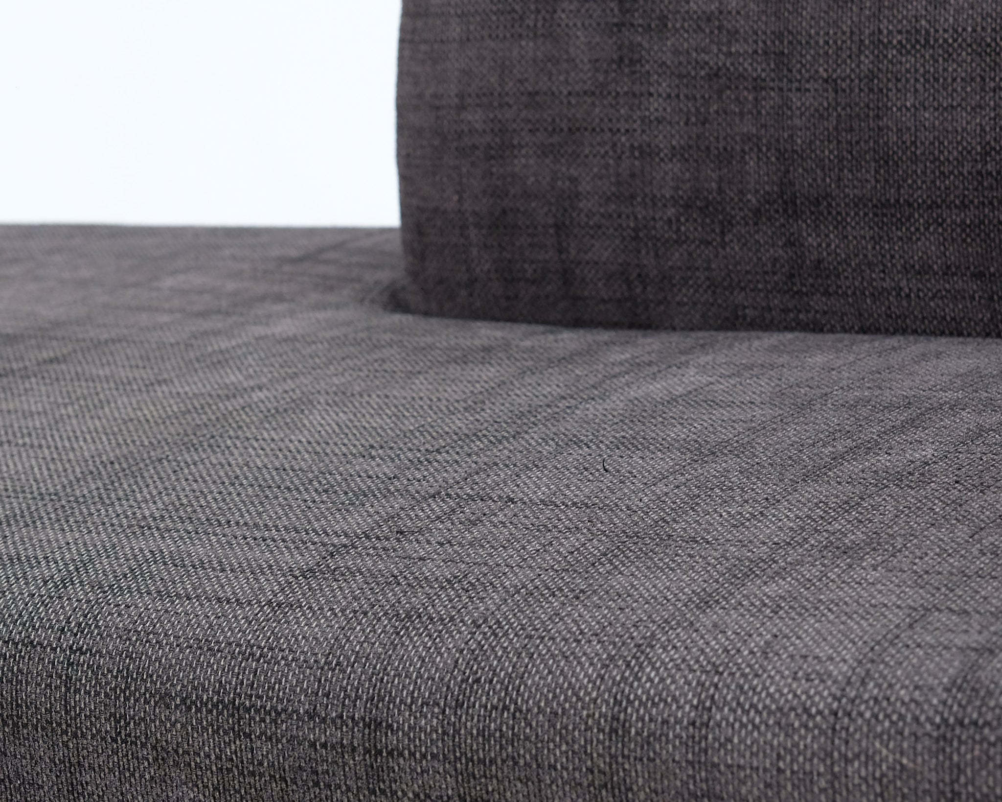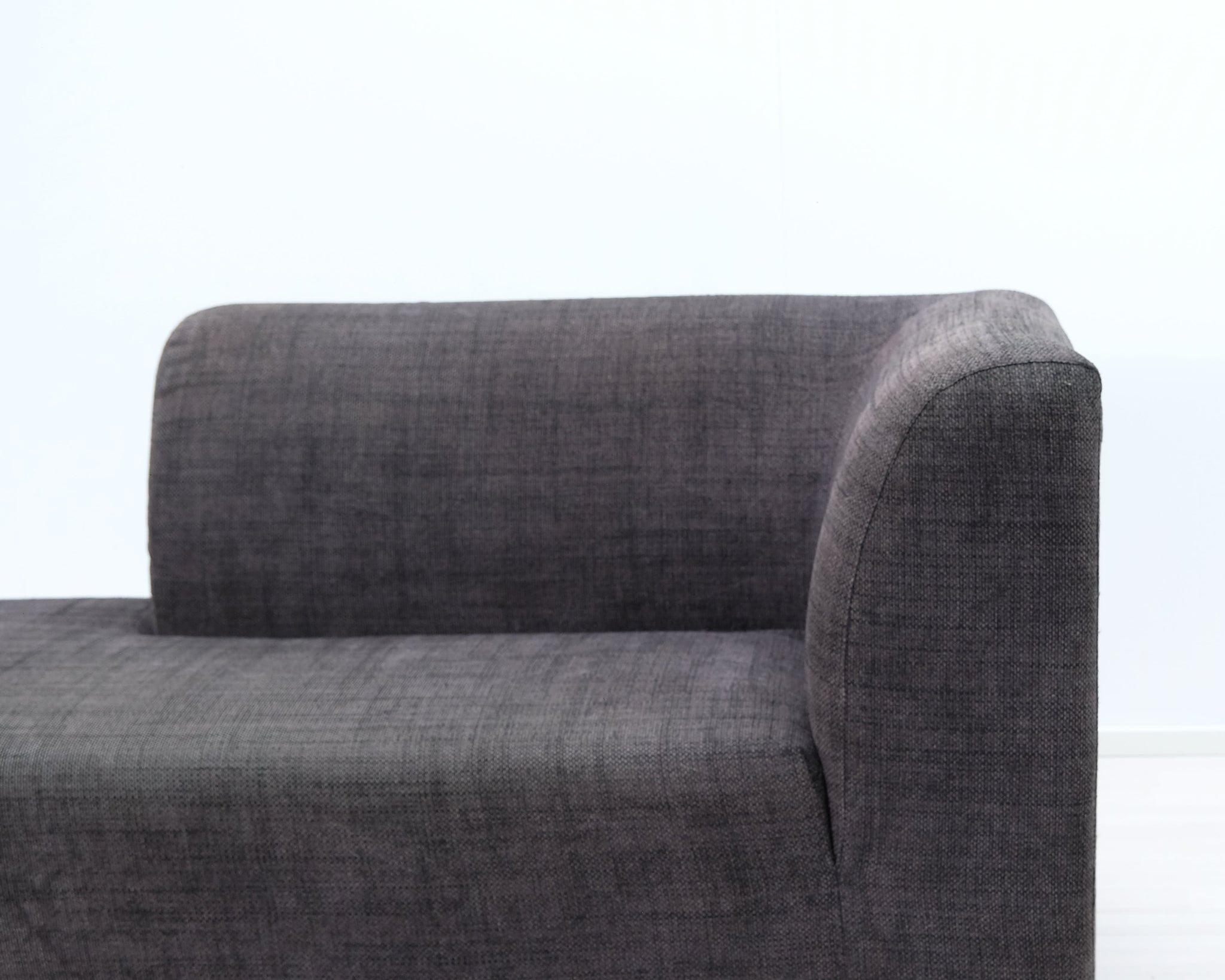 Tummanharmaa Camp-divaani merkiltä Adea. Ostettu Vepsäläiseltä. Kangasverhoilu, metalliset jalat.