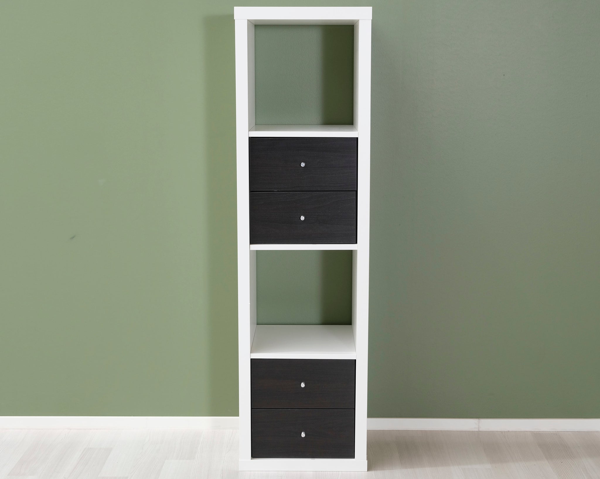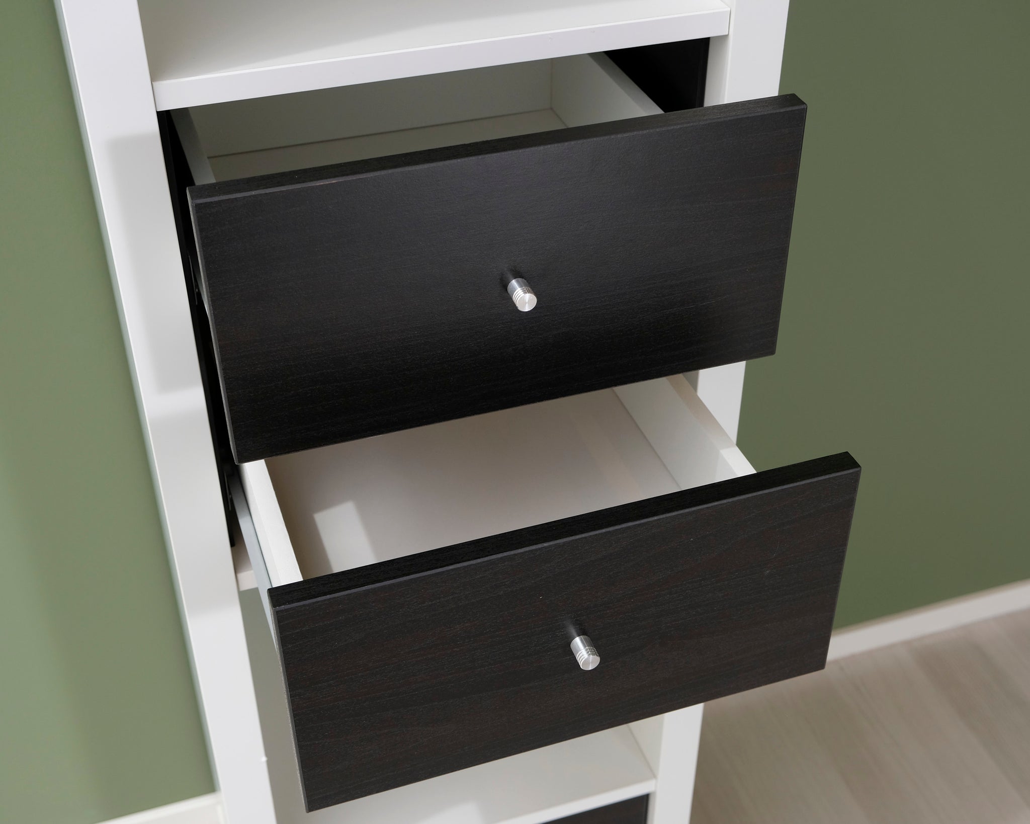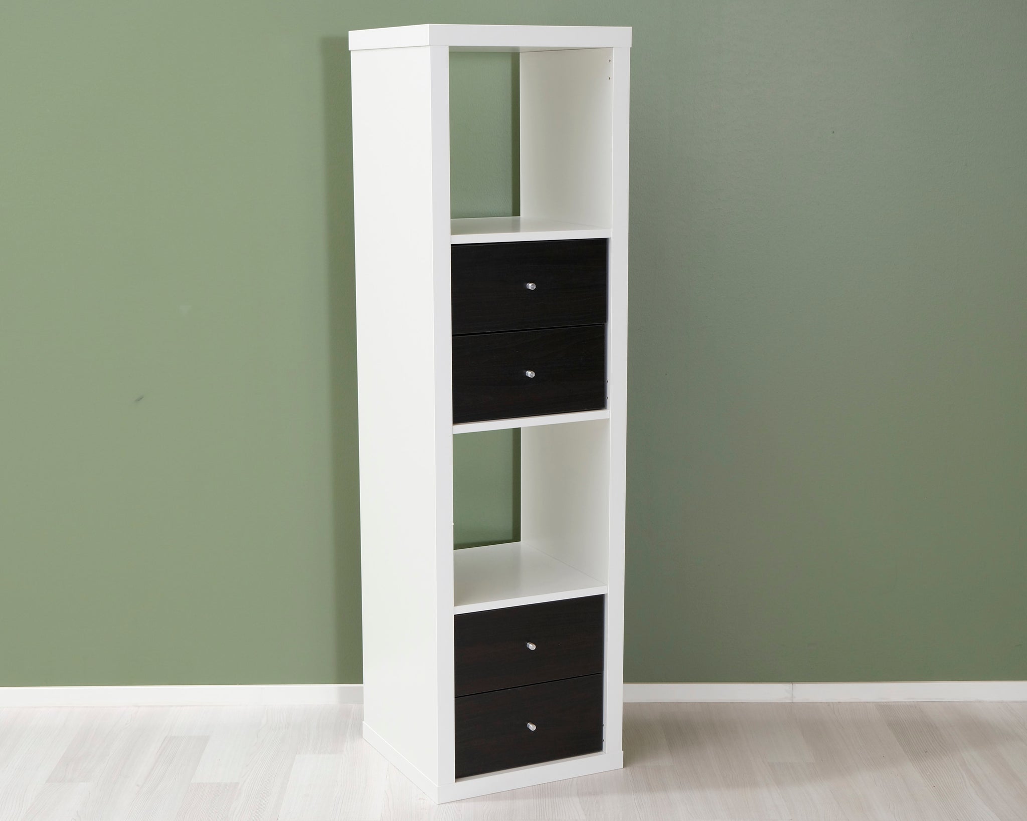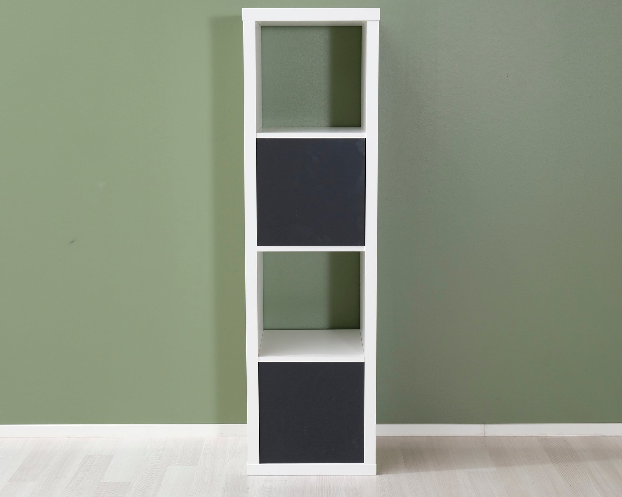 IKEA Kallax-hylly laatikostolla. Valkoinen. Siirettävät laatikostot joiden paikkaa voi vaihtaa tai ottaa kokonaan pois.