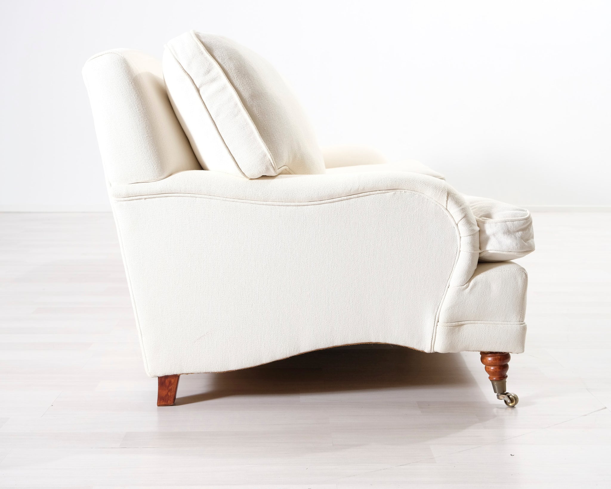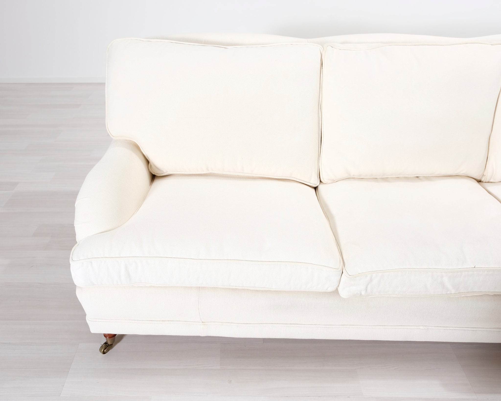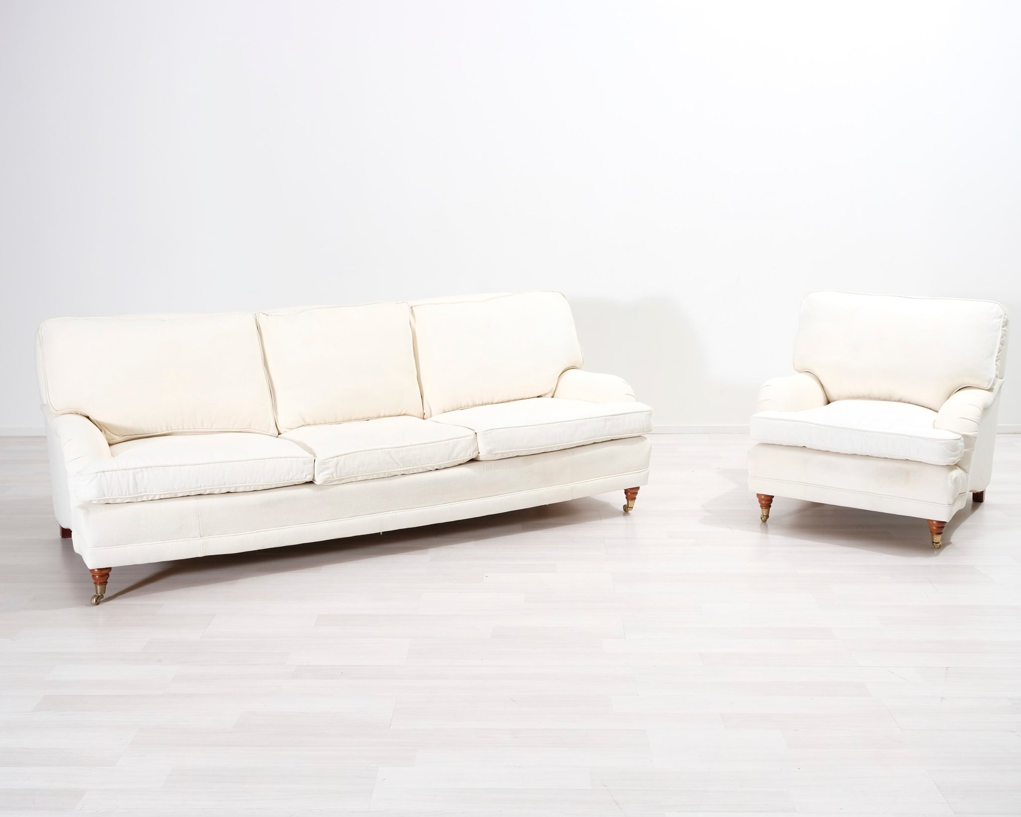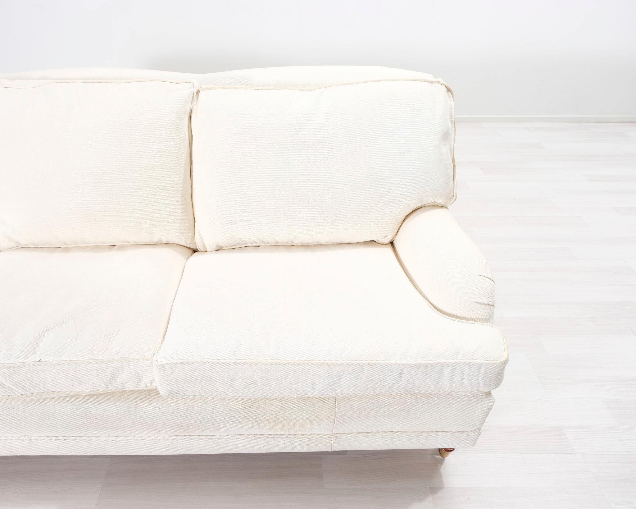 Kolmen istuttava Howard-tyylinen kangassohva. Valkoinen verhoilu. Hankittu George Hensher -liikkeestä.