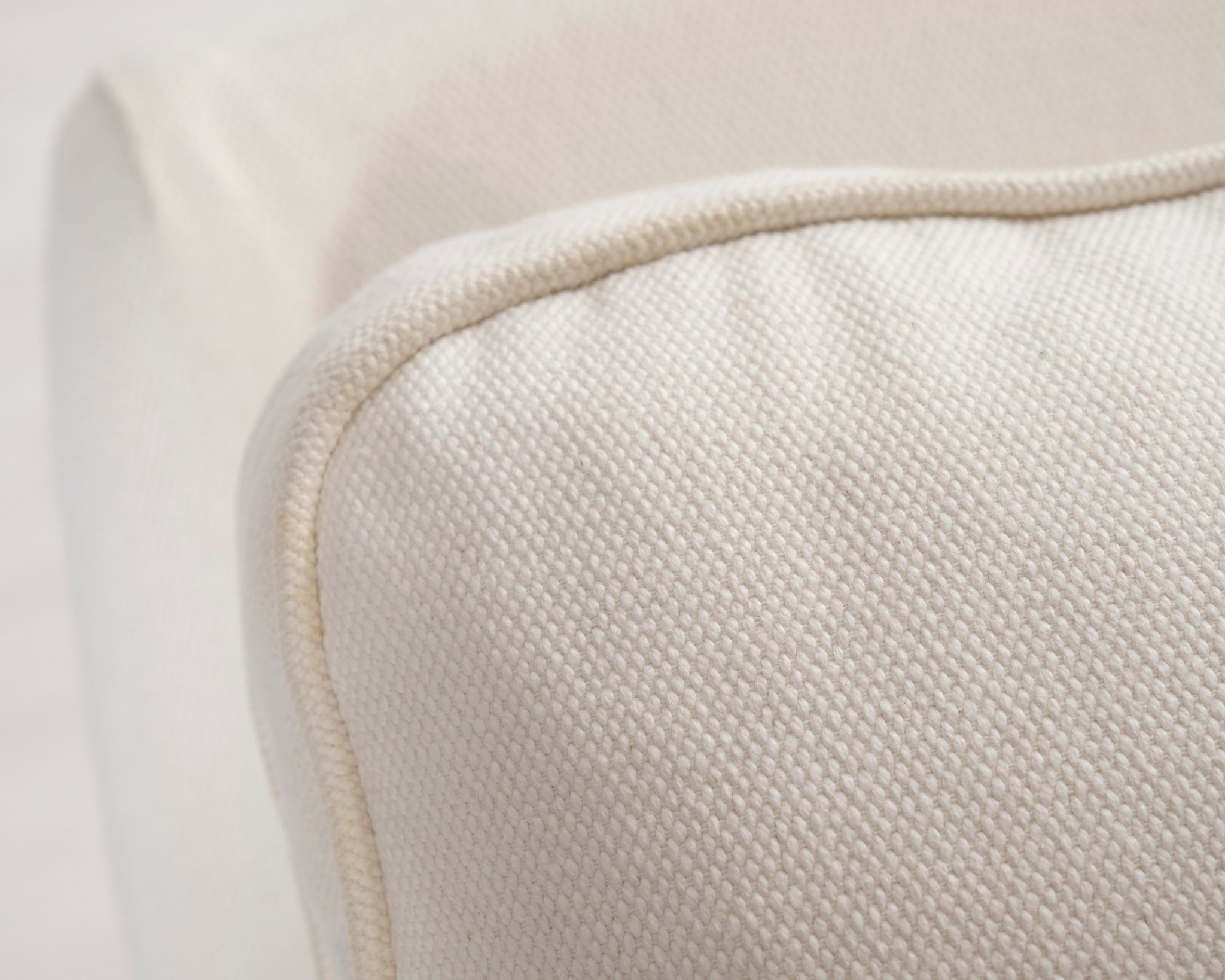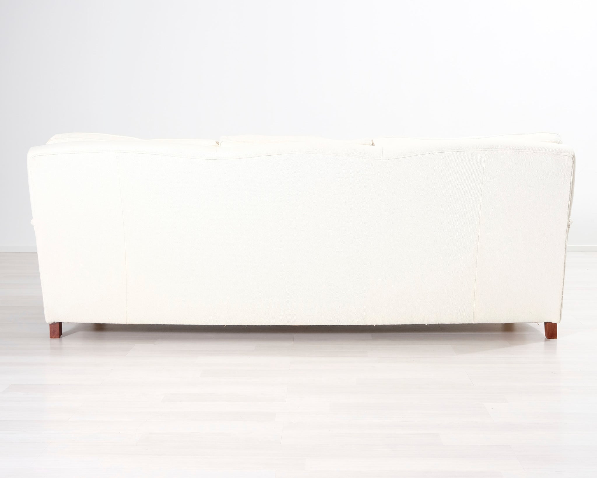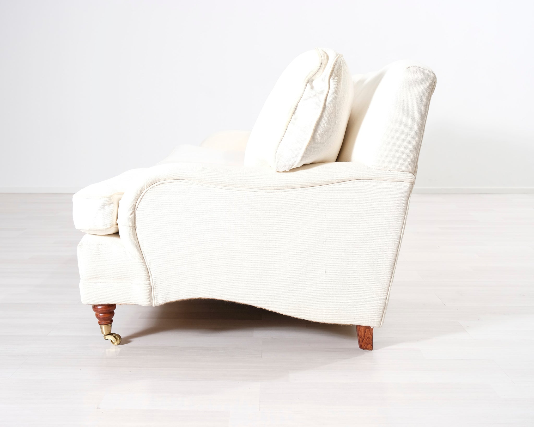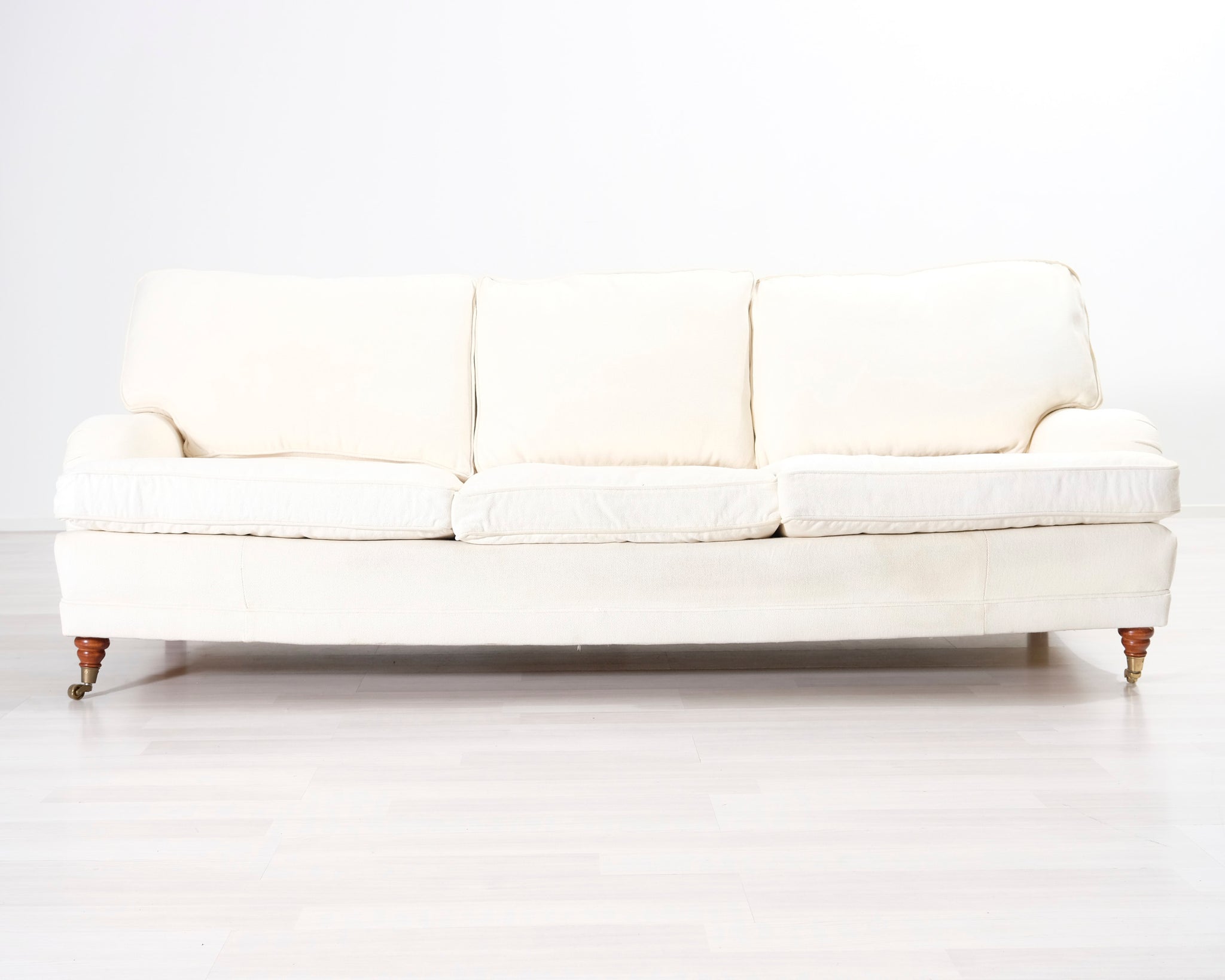 Kolmen istuttava Howard-tyylinen kangassohva. Valkoinen verhoilu. Hankittu George Hensher -liikkeestä.