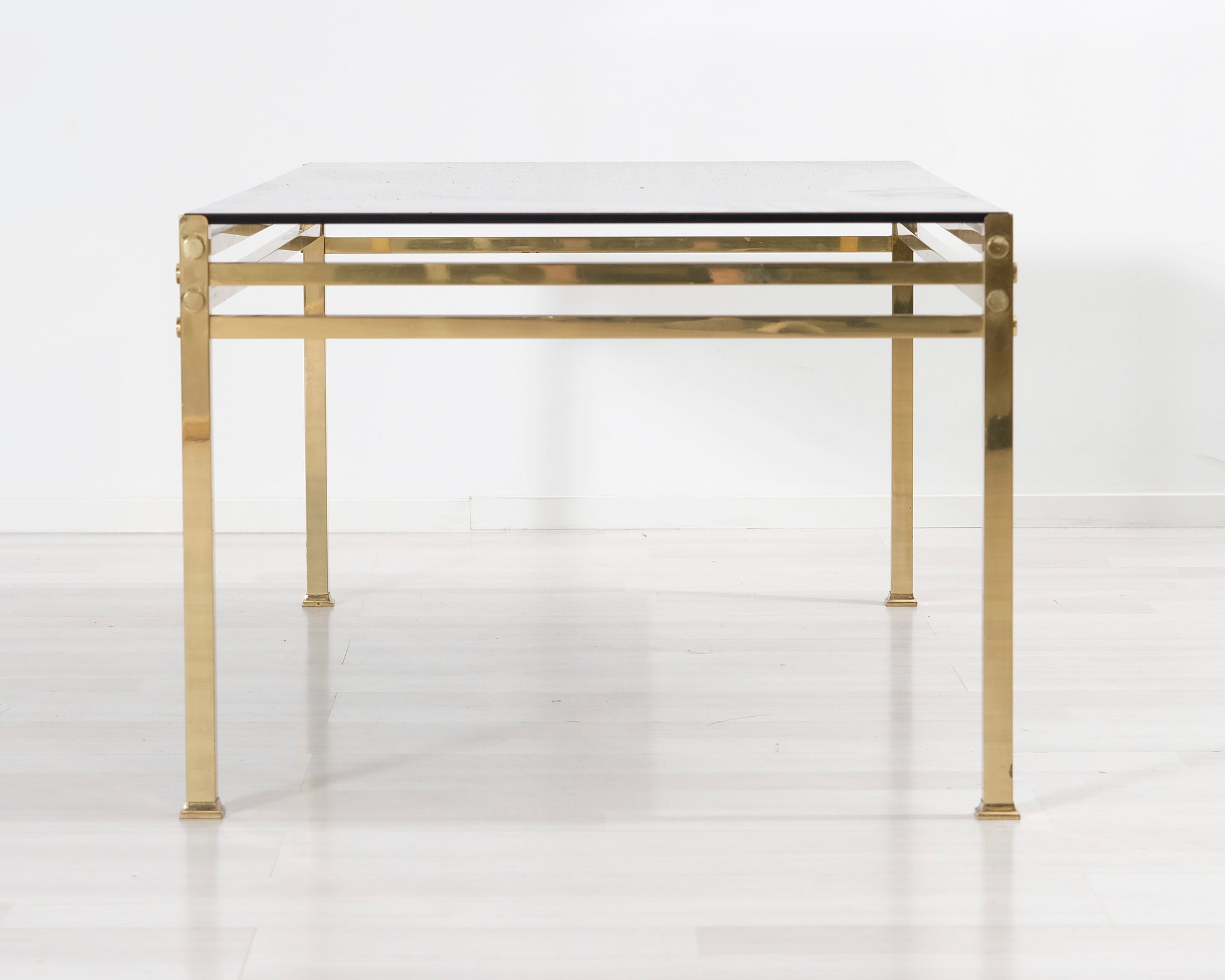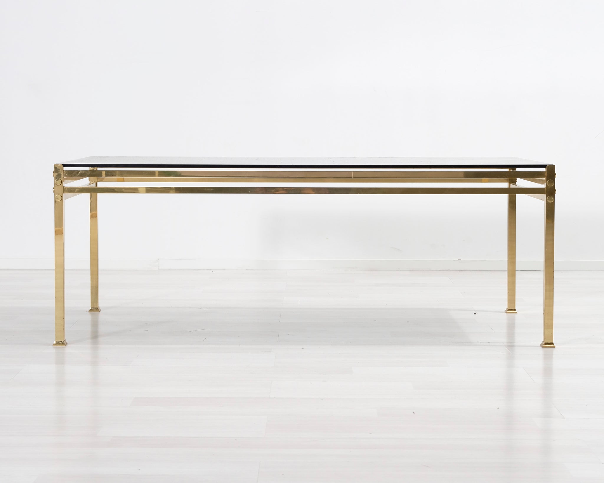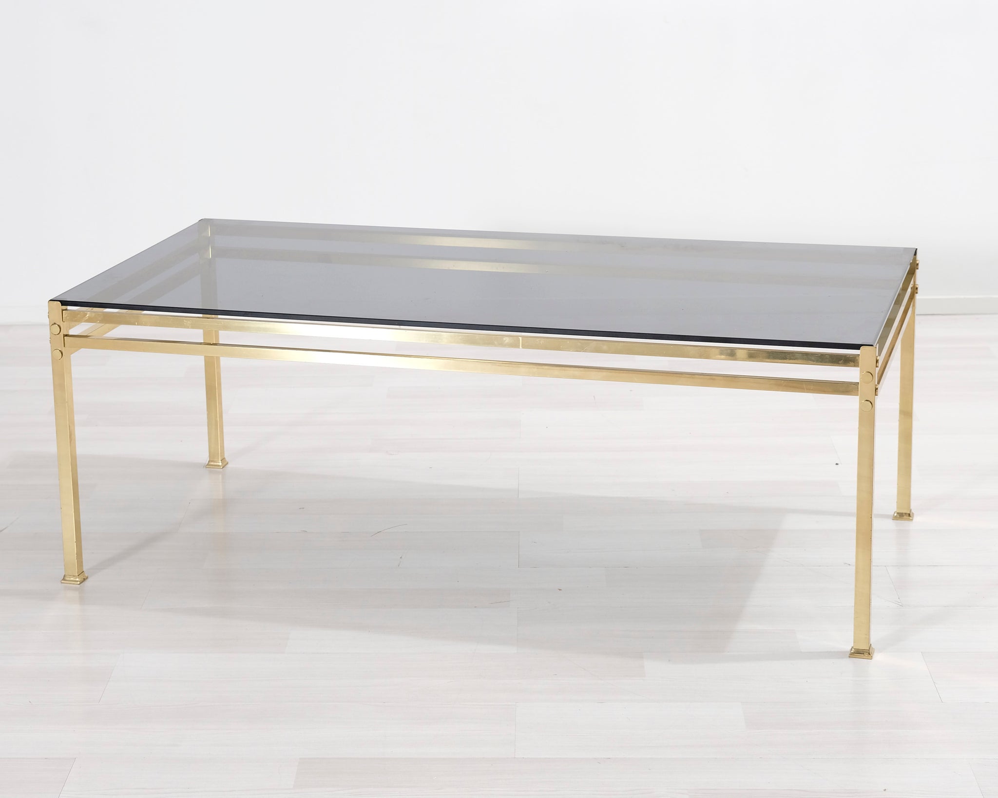 Messinkiruonkoinen sohvapöytä. Savulasista valmistettu pöytälevy. Valmistettu 1960-luvulla.